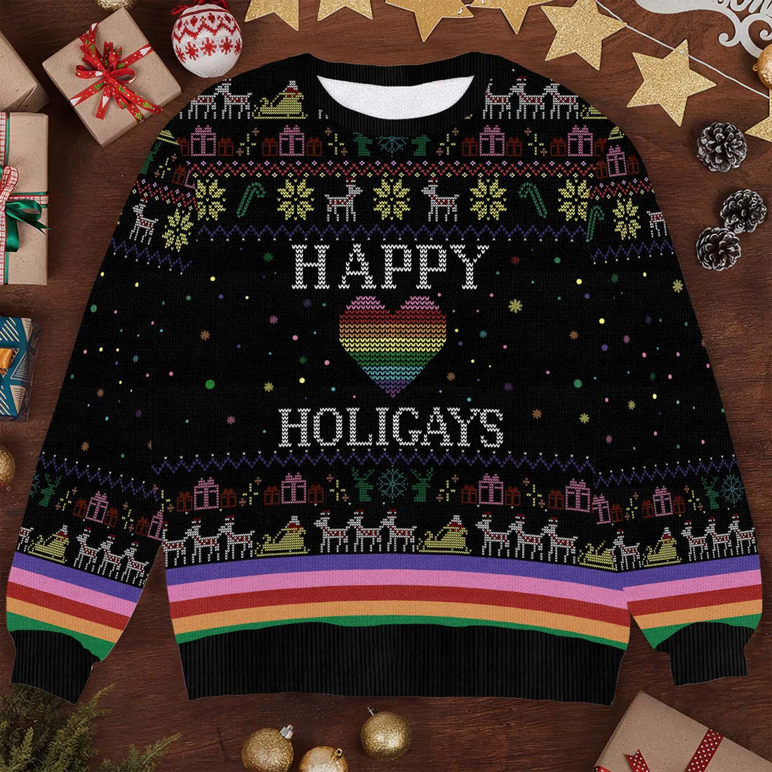Happy Holigays Christmas Sweater - Funny LGBTQ+ Pride Ugly Xmas Sweater - Festive Holiday Pullover with Rainbow