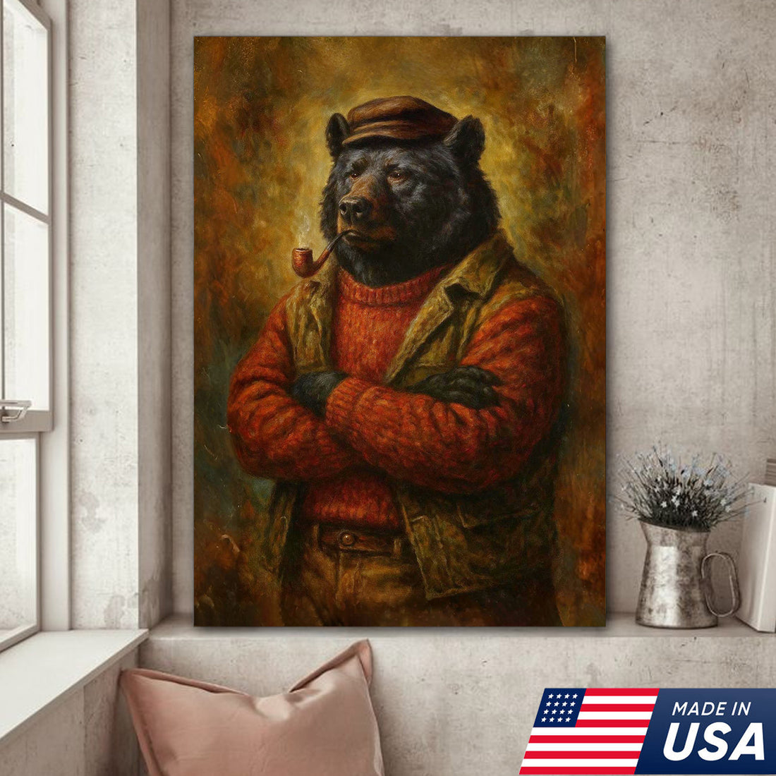 Vintage Black Bear Wall Art β Rustic Canvas Print of Bear in Red Sweater Smoking Pipe - Animal Portrait Home Decor