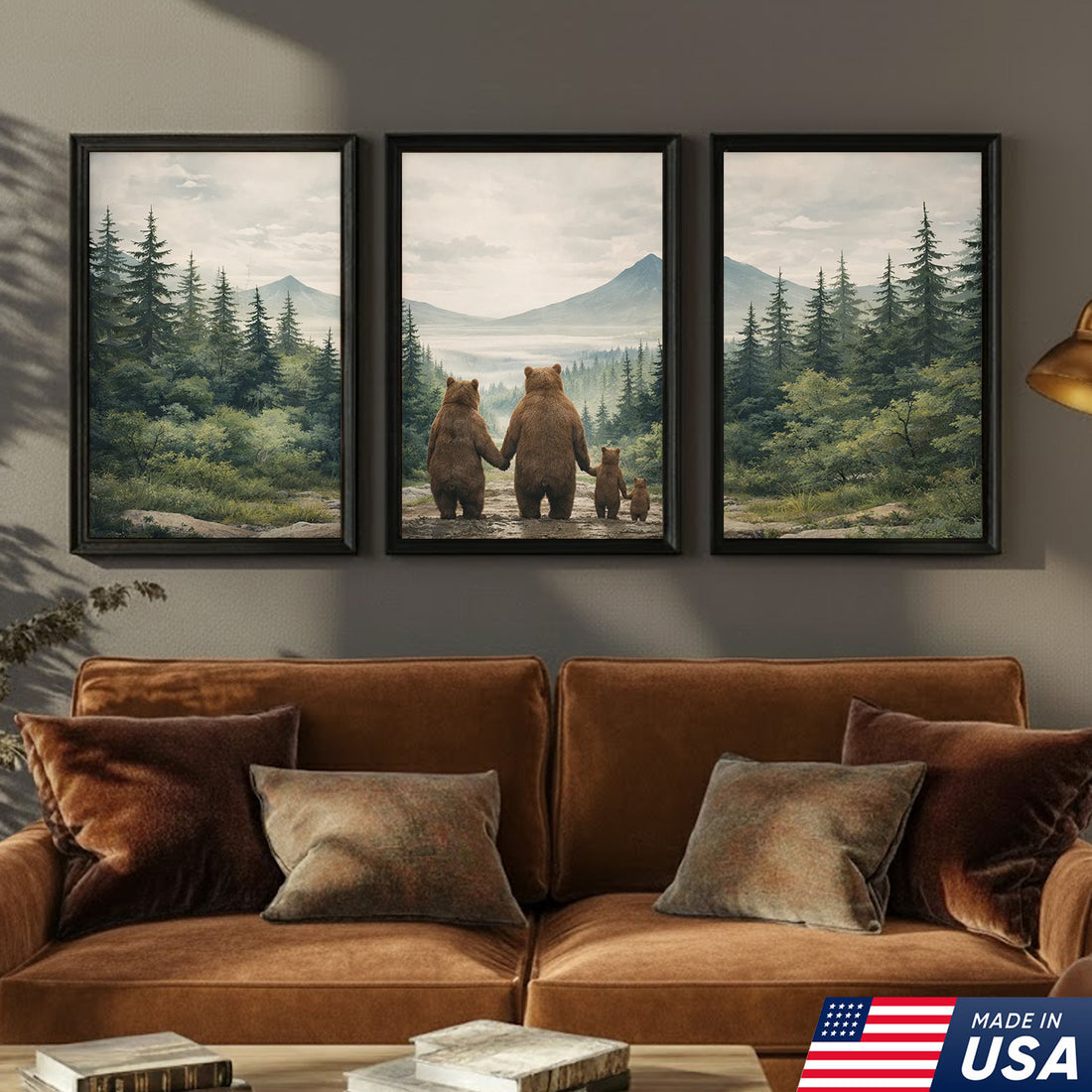 Bear Family Forest Triptych Canvas Wall Art Set, Peaceful Wildlife Landscape with Cubs, Warm Nature Inspired Living Room Home Decor Print
