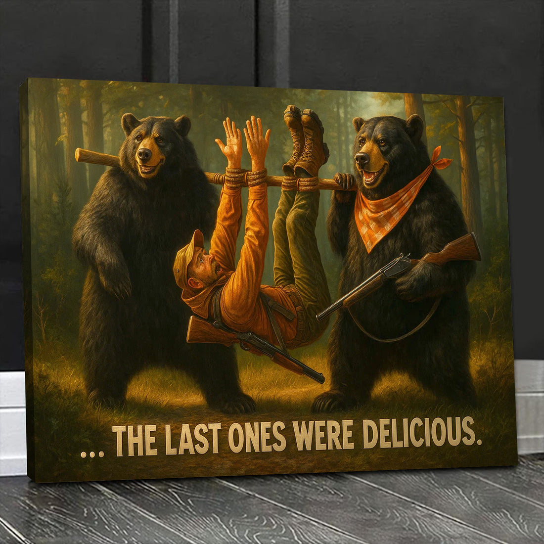 Funny Bear Hunting Canvas Wall Art - Hilarious Wilderness Scene with Hunter - Rustic Cabin and Lodge Decor