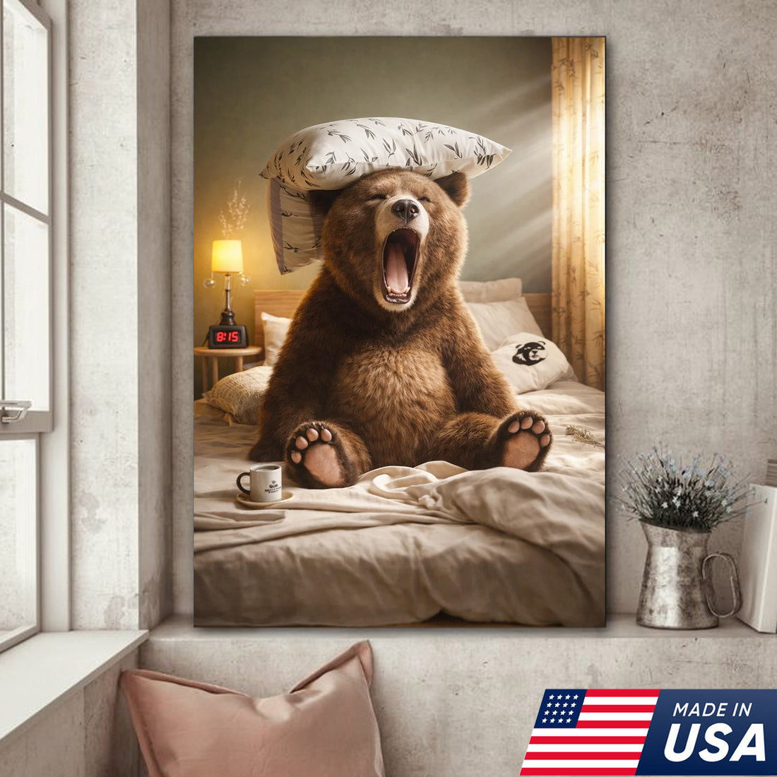 Funny Sleepy Bear Canvas Wall Art, Yawning Bear in Bed with Pillow, Cozy Bedroom Animal Art, Humorous Home Decor Gift