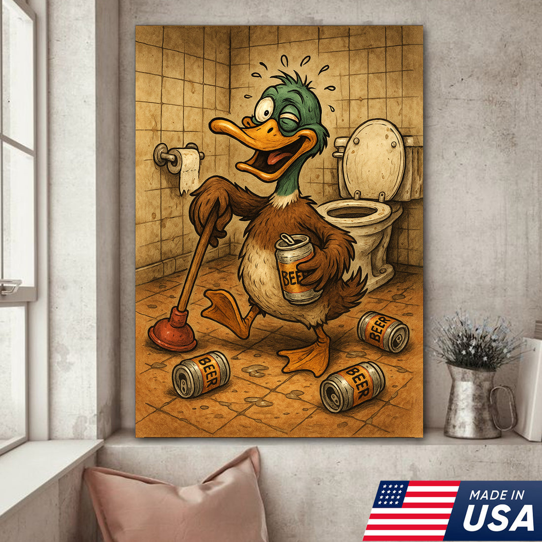 Funny Duck Canvas Wall Art – Hilarious Bathroom Decor with Soda Cans and Plunger for Rustic Cabin & Home