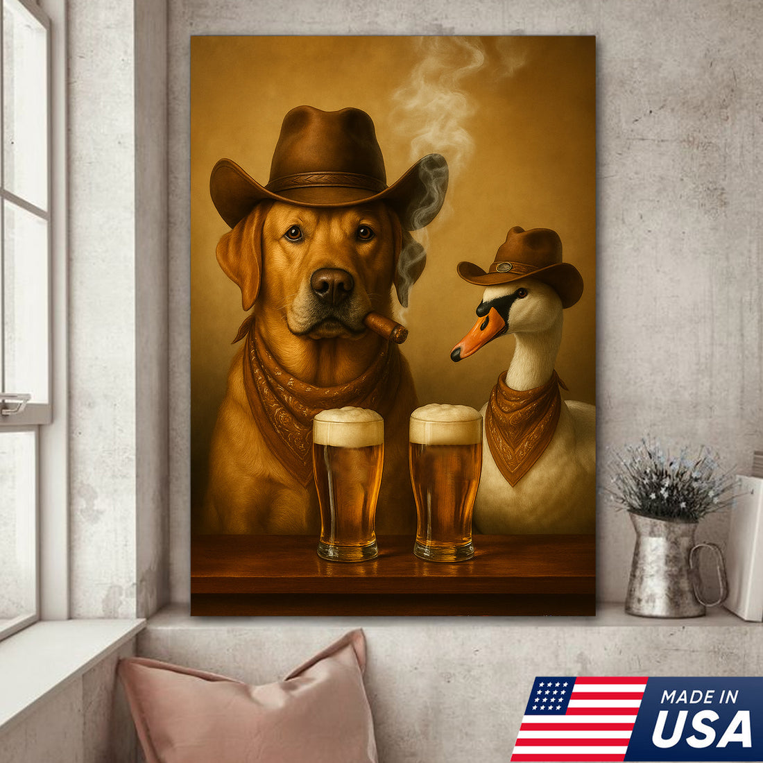 Funny Cowboy Dog & Goose Canvas Wall Art β Funny Beer & Smoking Western Decor for Hunters, Cabin & Man Cave