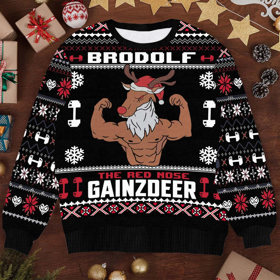 Funny Brodolf Gym Christmas Sweater - Red Nose Gainzdeer Holiday Pullover - Ugly Xmas Sweater for Hunt lover