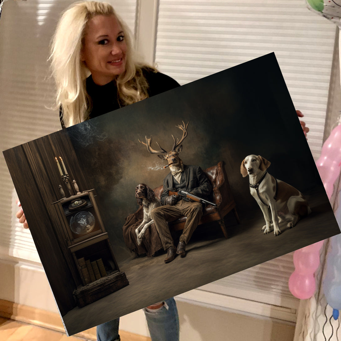 Deer Hunter Gentleman Canvas β Surreal Wall Art with Dogs for Cabin or Man Cave
