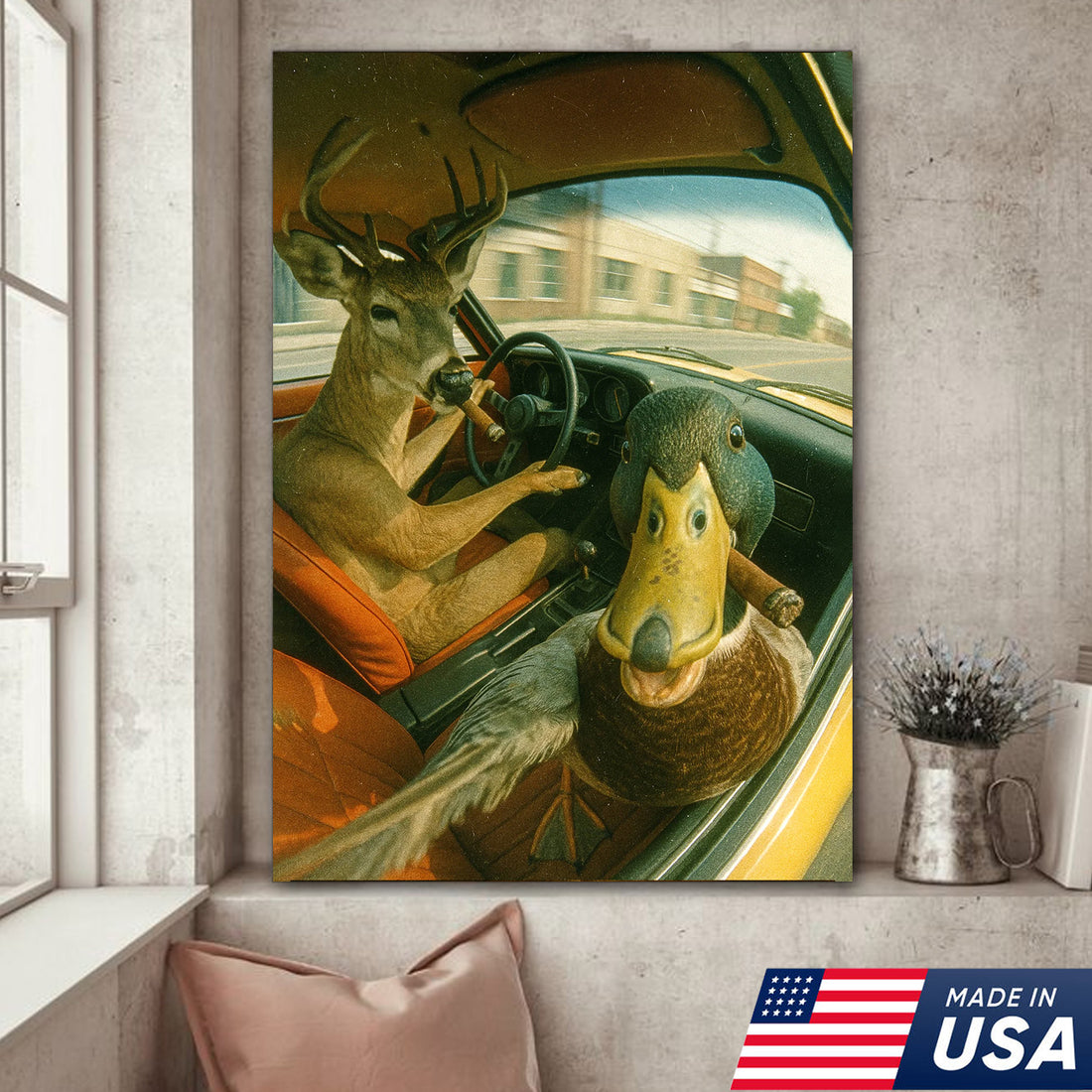Wild Road Trip Canvas Wall Art β Deer & Duck Adventure Scene β Quirky Rustic Cabin Decor