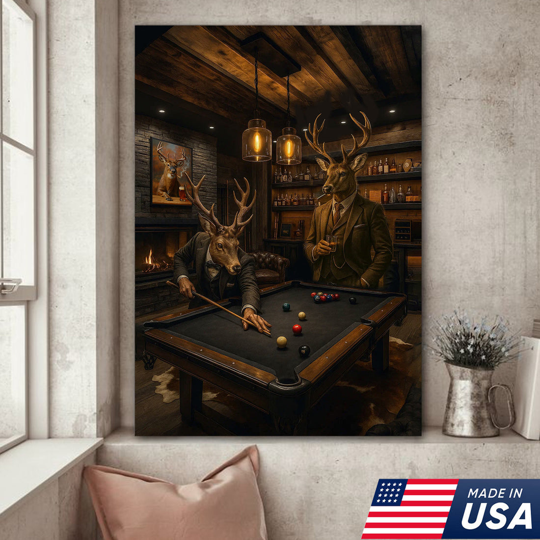 Deer Gentlemen Billiards Canvas Wall Art β Whitetail Bucks in Suits at Pool Table β Lodge Game Room Decor
