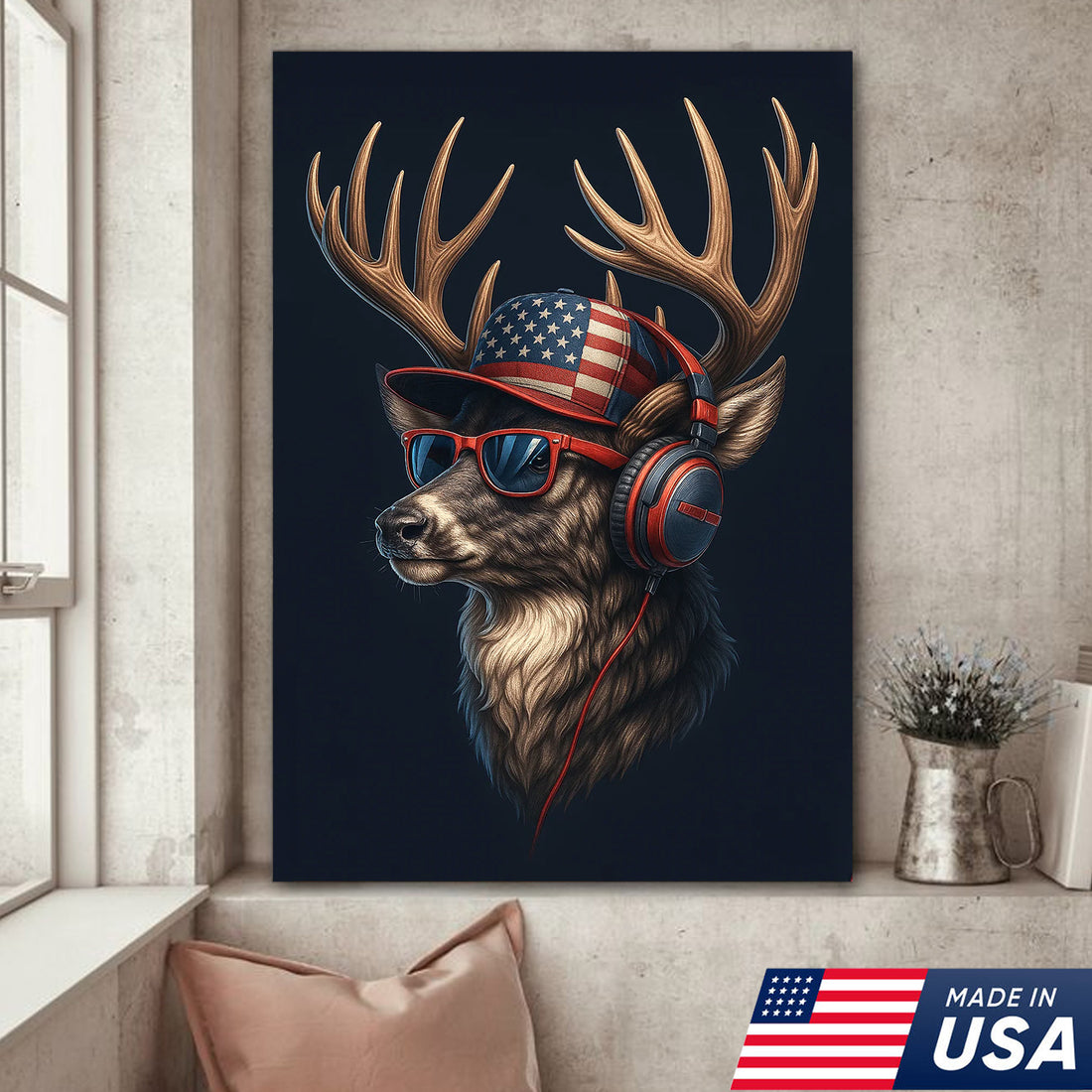 Patriotic Deer Wall Art Canvas β Cool Buck with American Flag Hat and Headphones β Rustic Hunting Lodge Decor USA