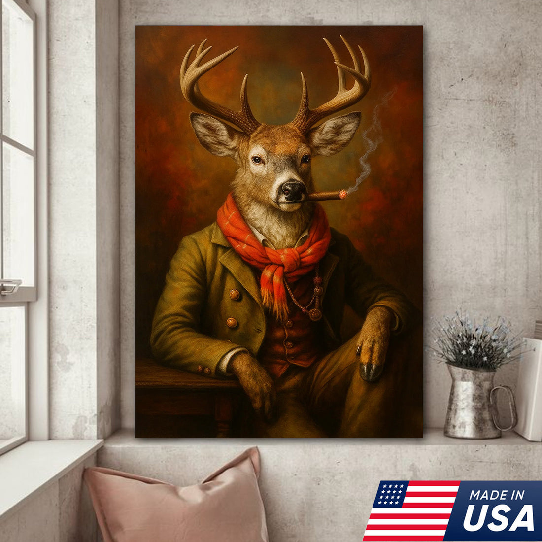 Vintage Deer Canvas Wall Art - Gentleman Stag with Smoking Wall Decor β Rustic Hunting Lodge