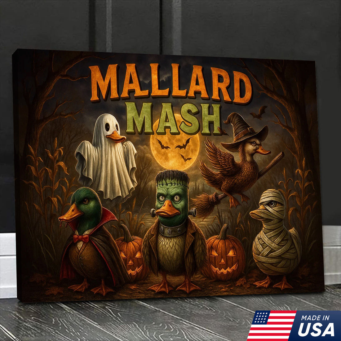 Mallard Mash Halloween Canvas Wall Art β Funny Ducks in Costumes with Pumpkins and Full Moon Decor