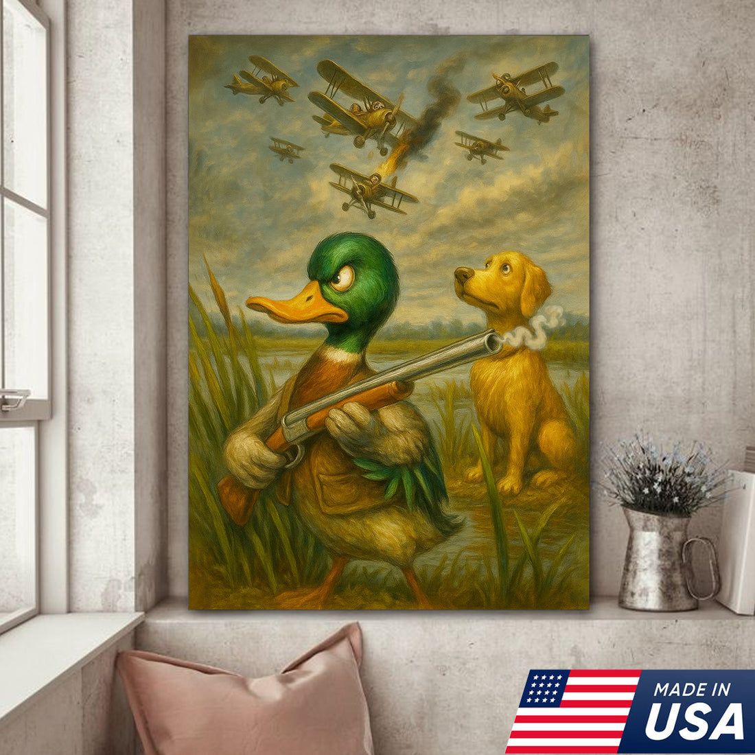 Funny Duck with Shotgun Canvas Wall Art β Hunting Dog & Airplane Battle Rustic Decor, Man Cave Lodge Gift