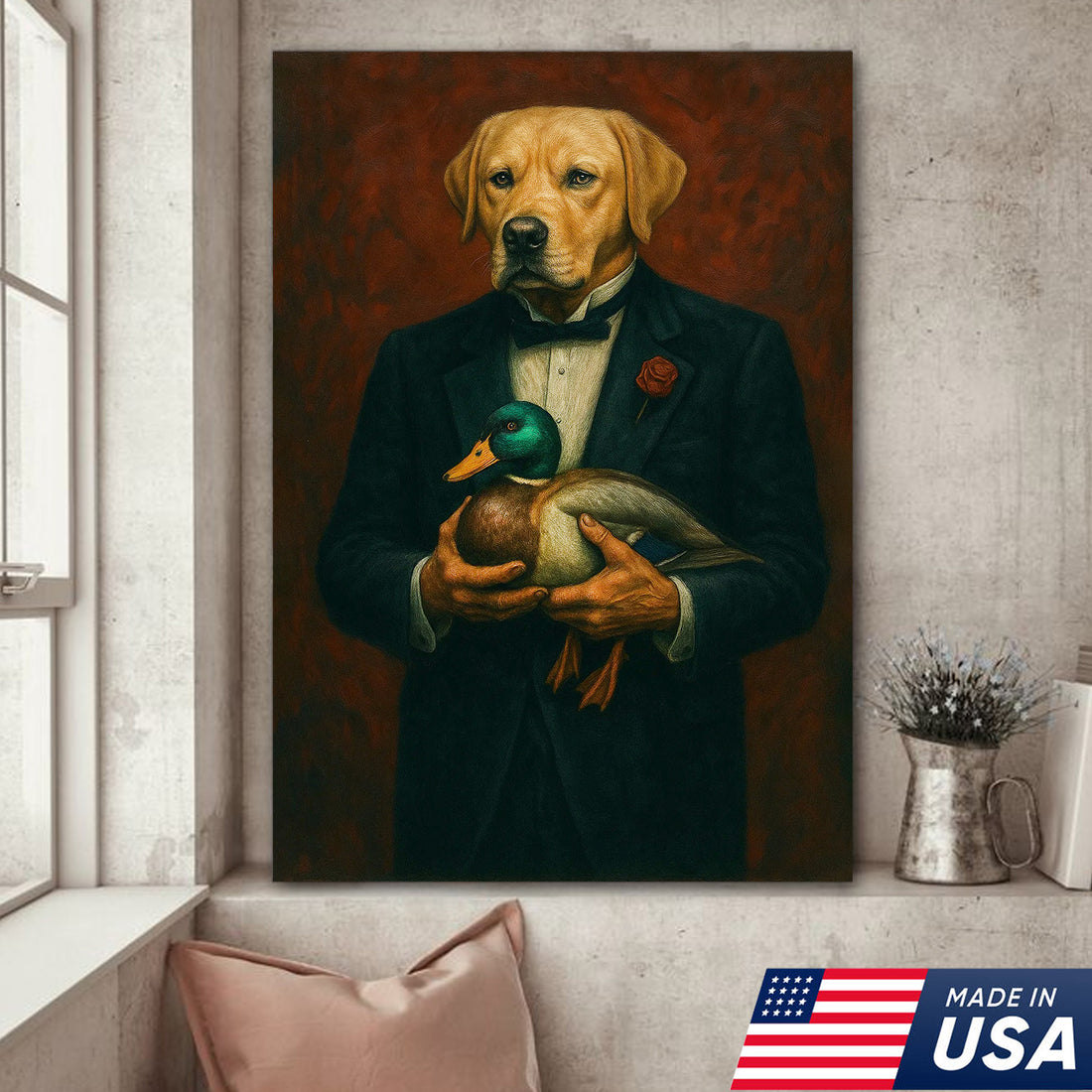 Yellow Labrador Retriever Canvas Wall Art β Distinguished Dog in Tuxedo Holding Mallard Duck β Elegant Hunting Dog Portrait Decor