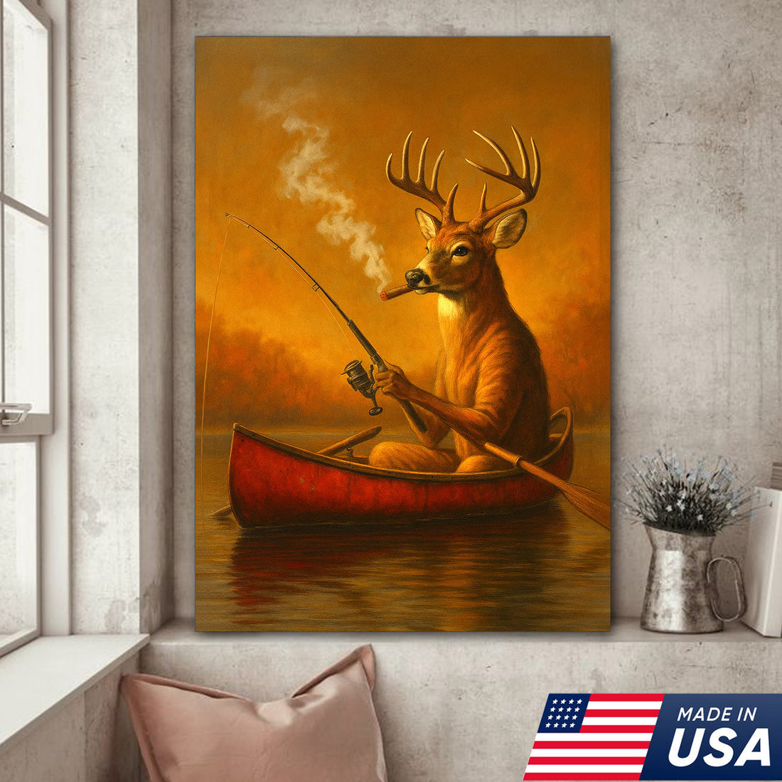 Funny Elk Fishing Canvas Wall Art – Rustic Cabin Decor for Hunters & Fishermen