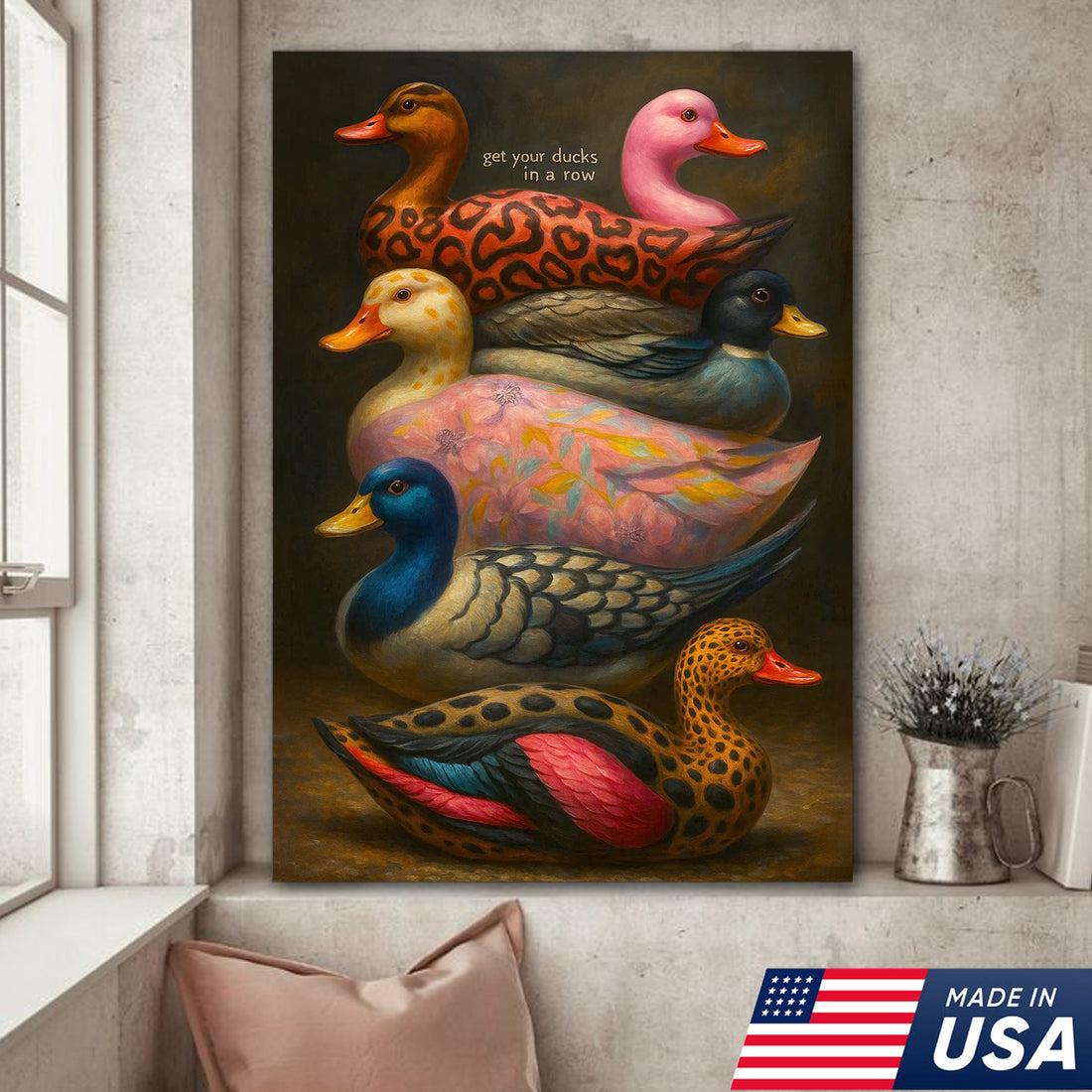 Colorful Duck Wall Art Canvas – Funny Get Your Ducks in a Row Farmhouse Decor – Rustic Wildlife Home Decoration