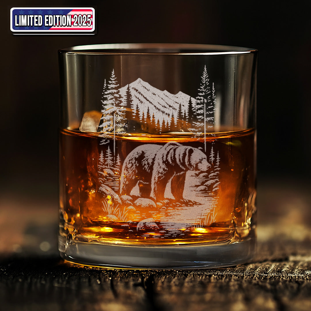 Bear Forest Engraved Whiskey Glass, Rustic Barware Gift for Hunters, Outdoorsmen & Drinking Lovers