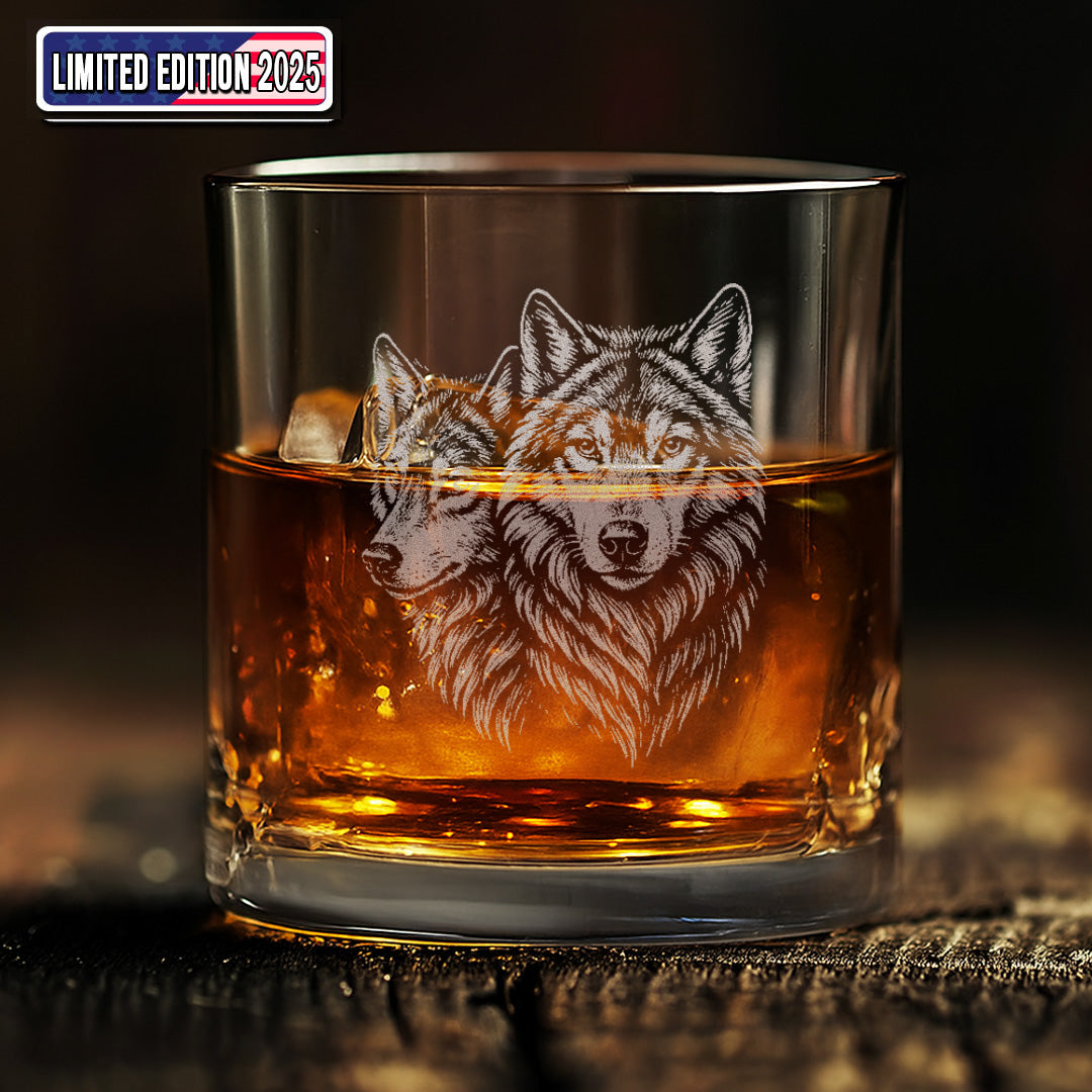 Engraved Wolf Whiskey Glass – Gift for Hunters, Outdoorsmen & Rustic Bar Deco