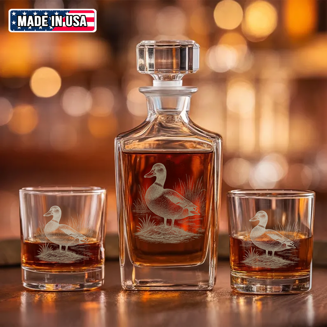 Duck Hunting Whiskey Decanter Set – Engraved Glass Barware Gift for Hunters & Drinking Lovers