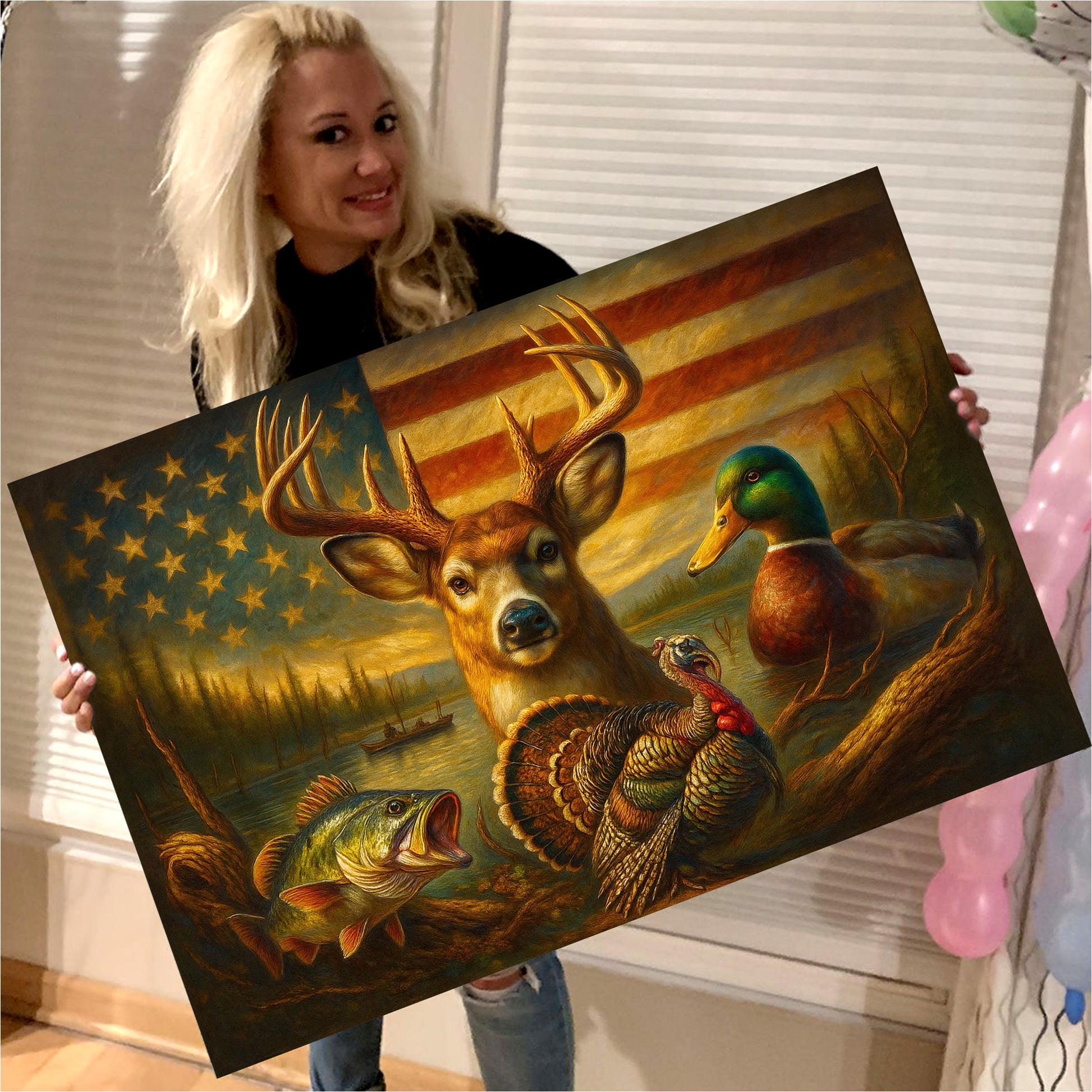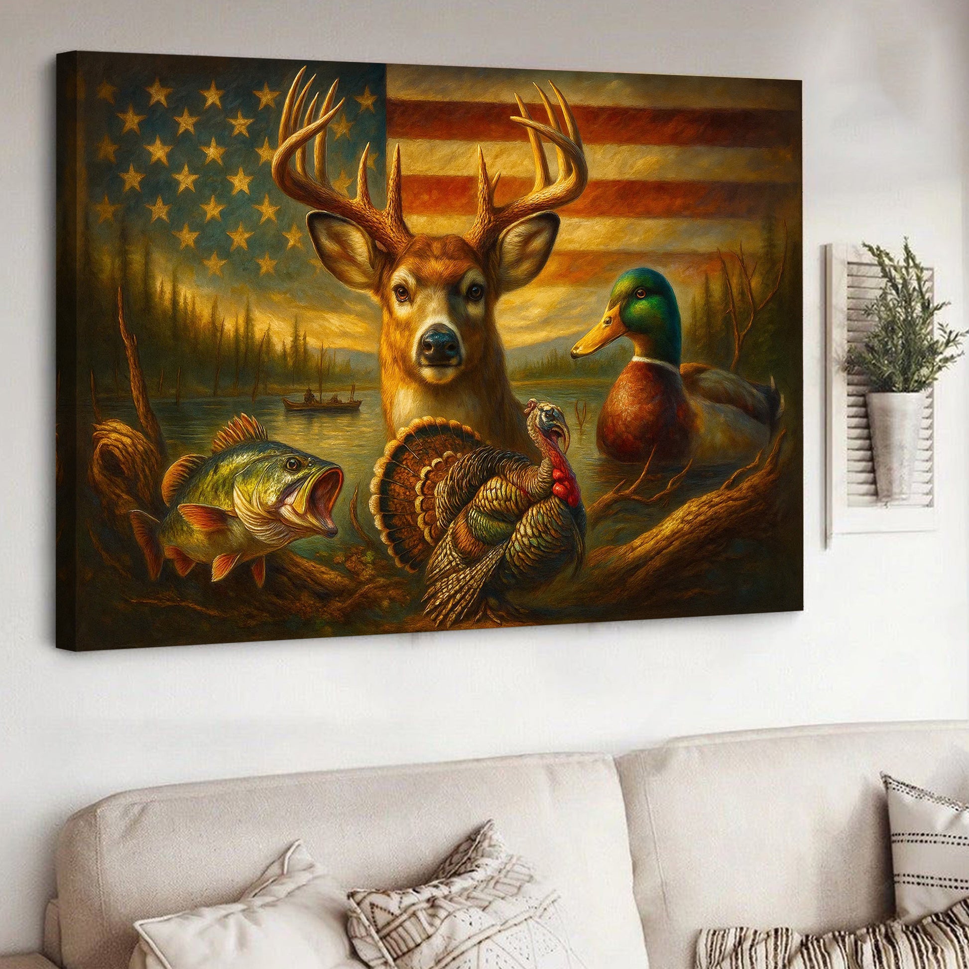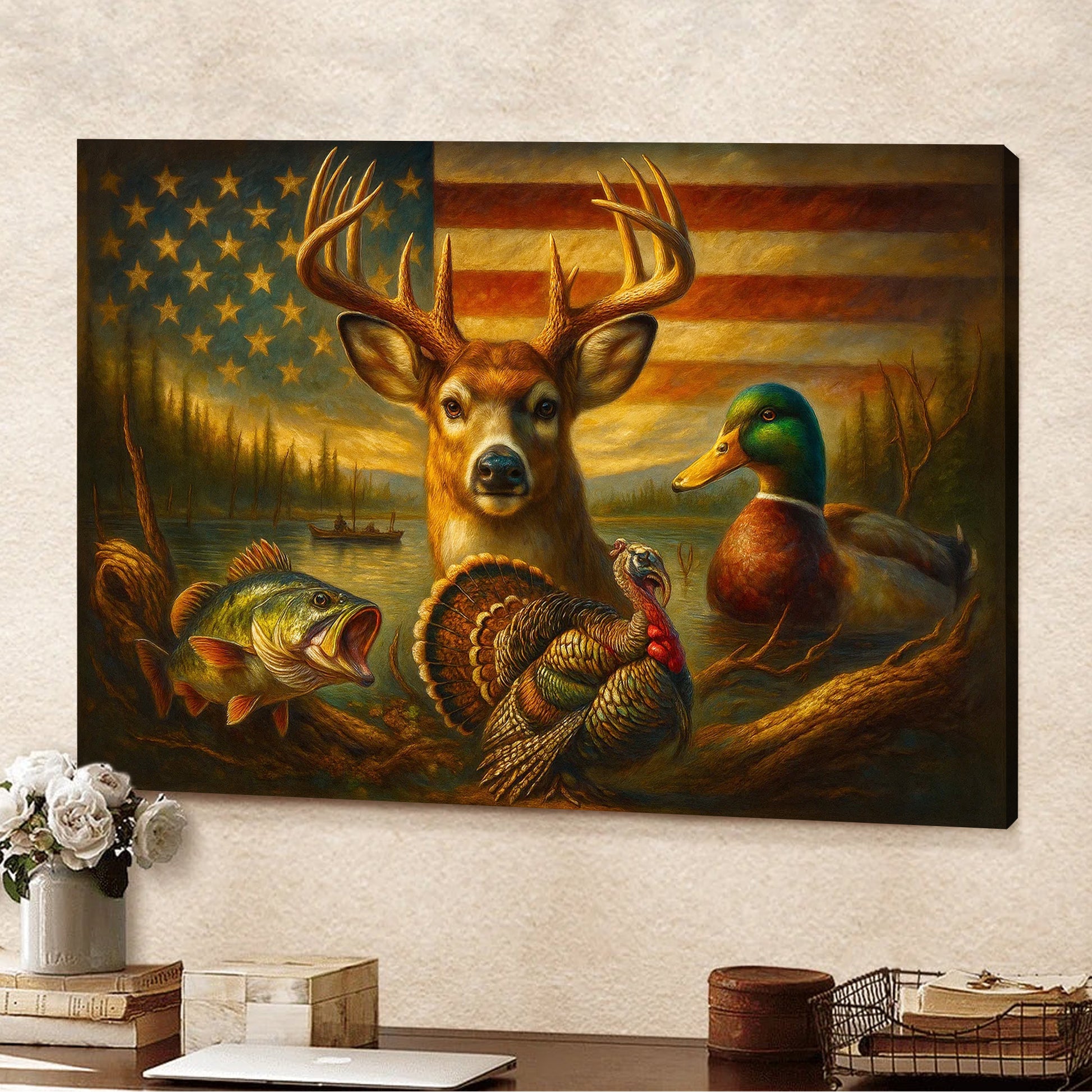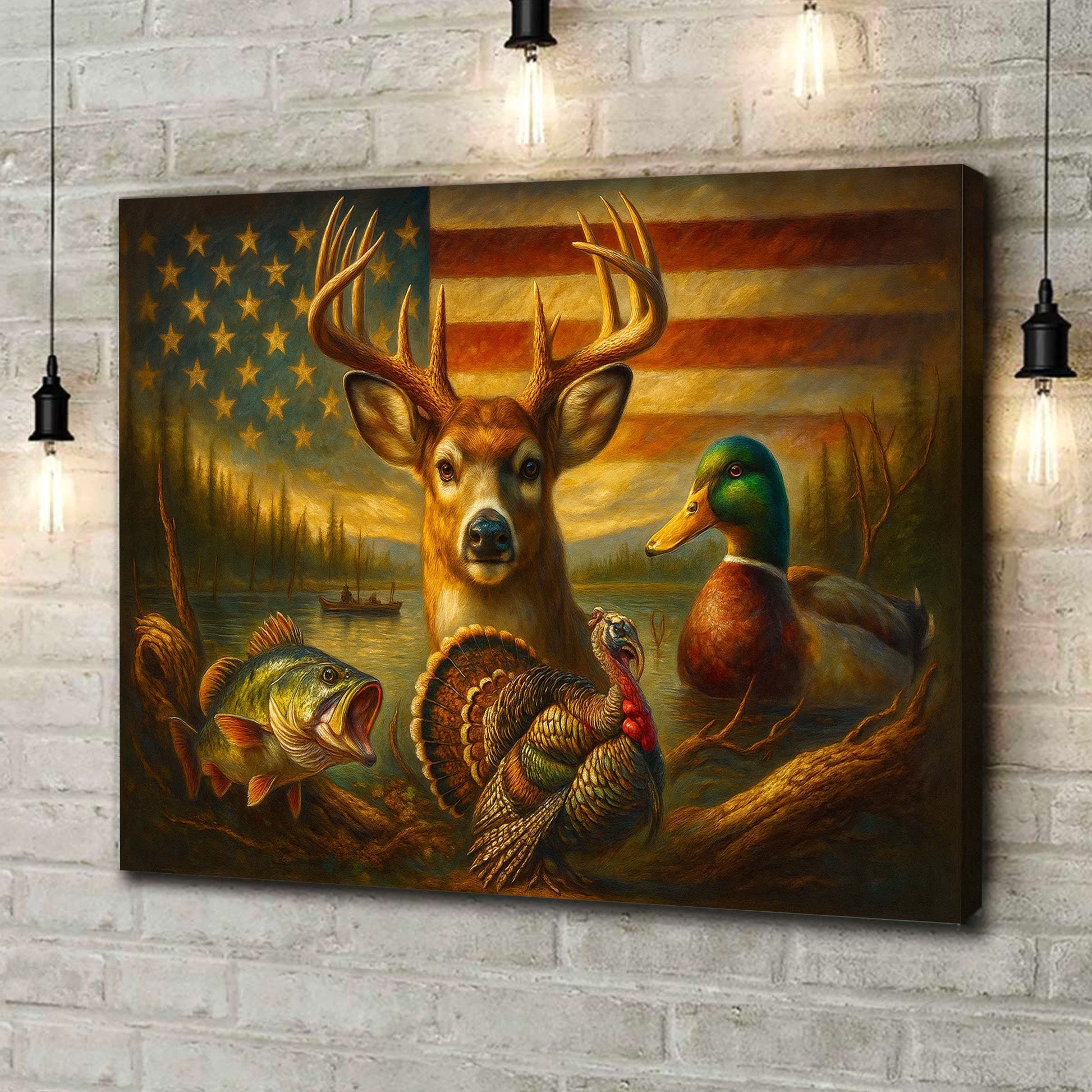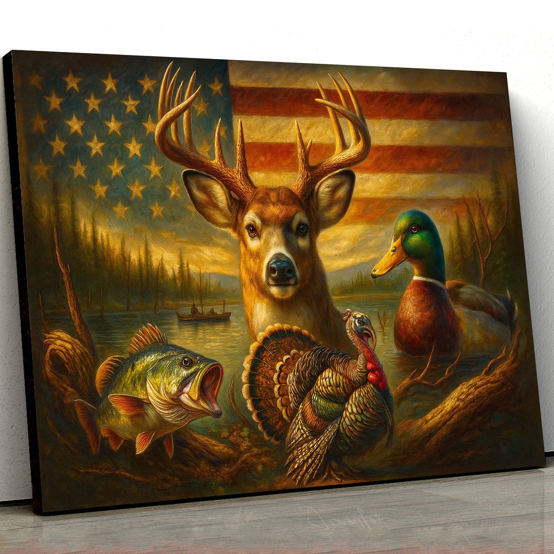 American Flag Hunting Canvas Wall Art – Whitetail Buck, Wild Turkey, Mallard Duck & Largemouth Bass – Patriotic Decor