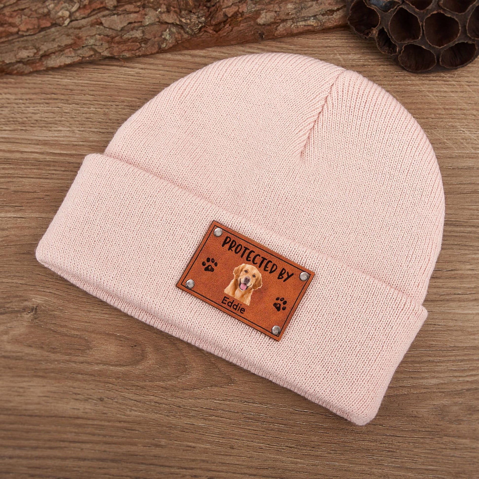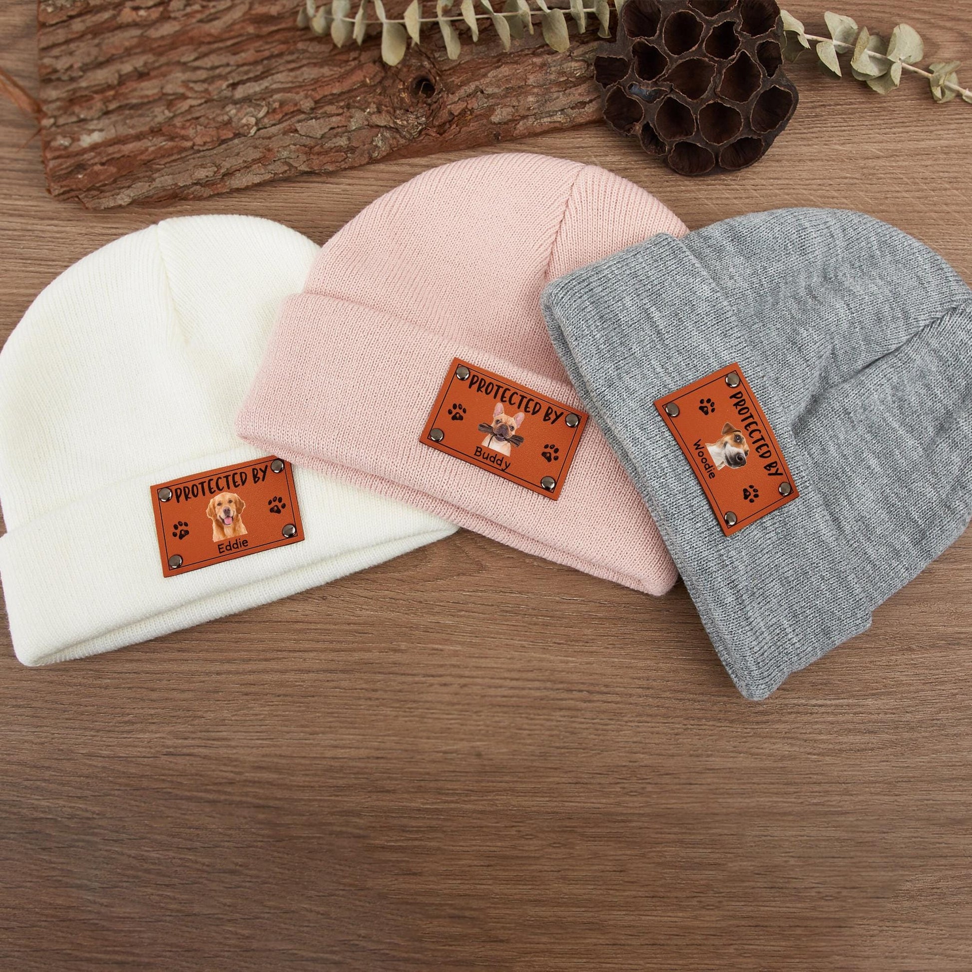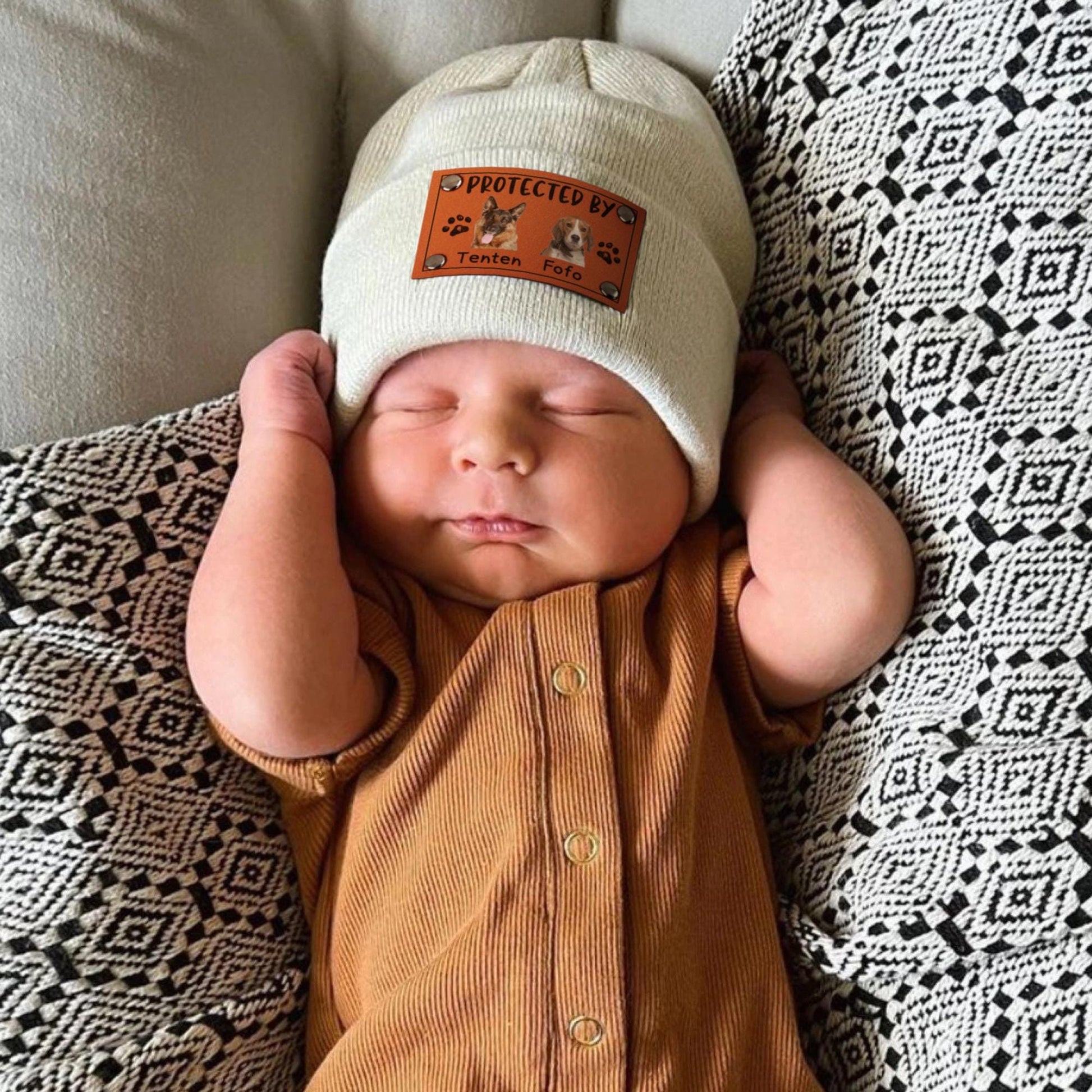 Baby Beanie Protected By Custom Portraits Using Pet Photo, Personalized Baby Beanie with Leather Patch, Beanie for Newborn, Infant, Baby