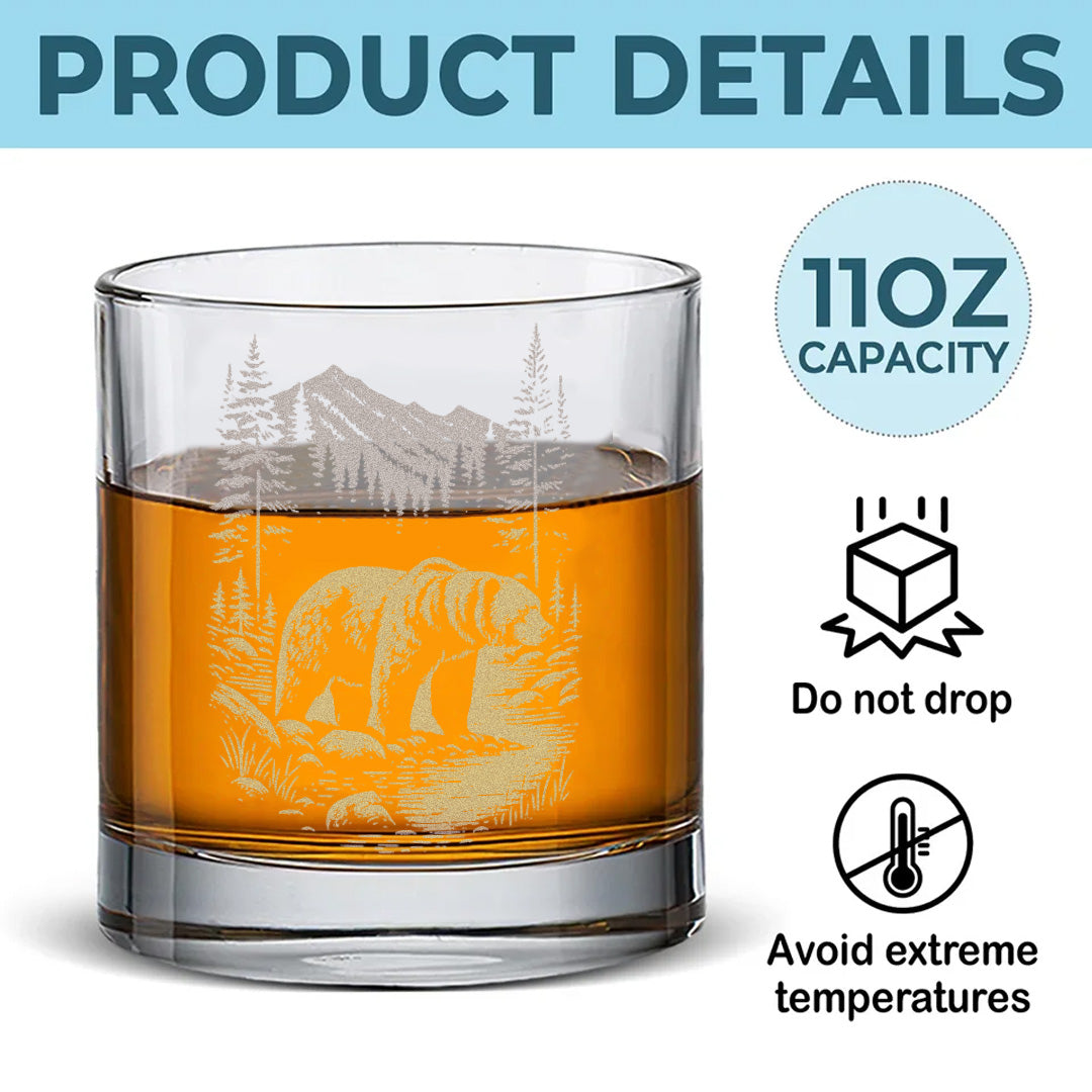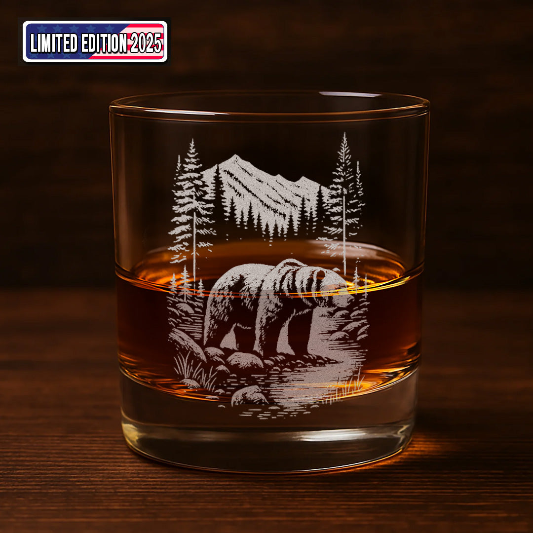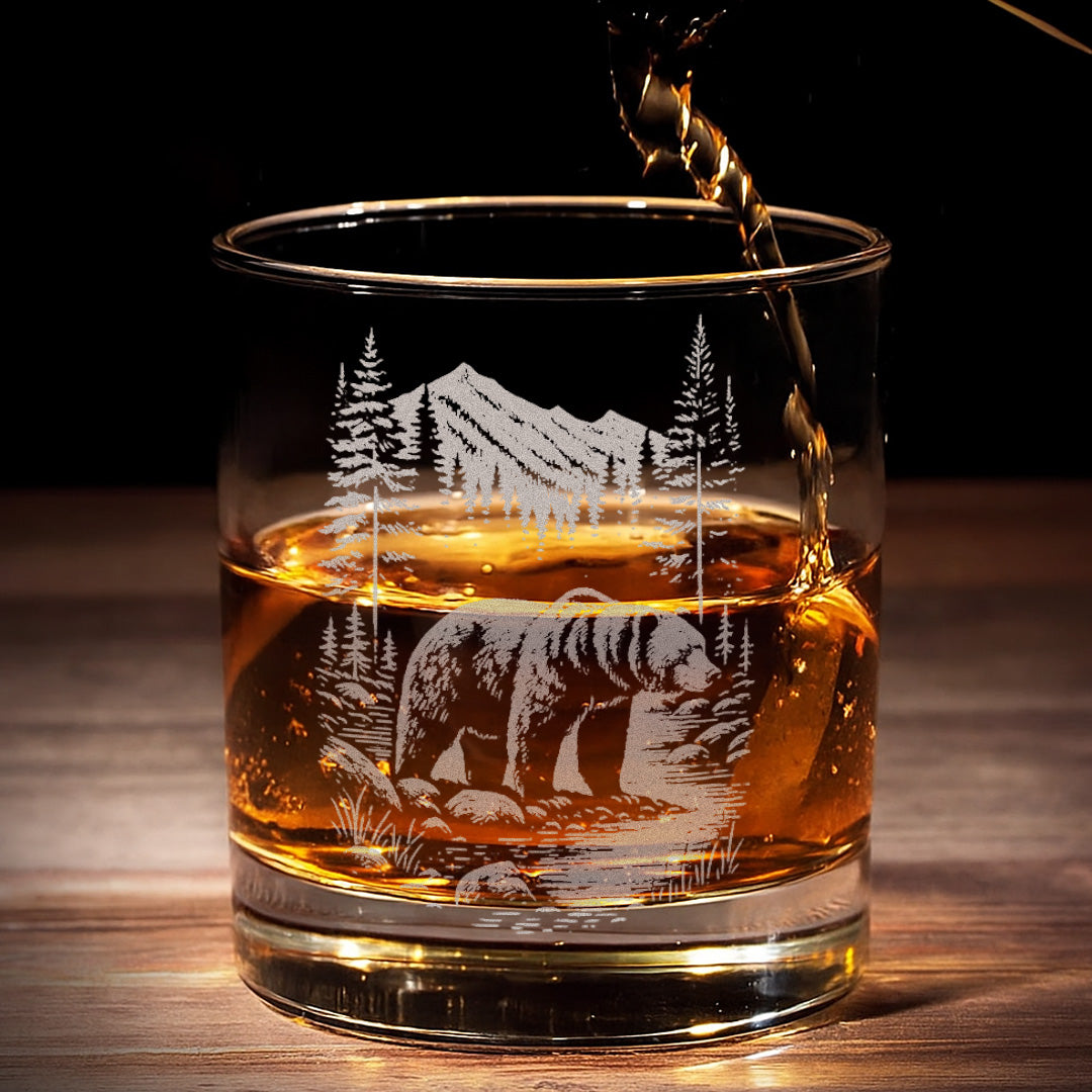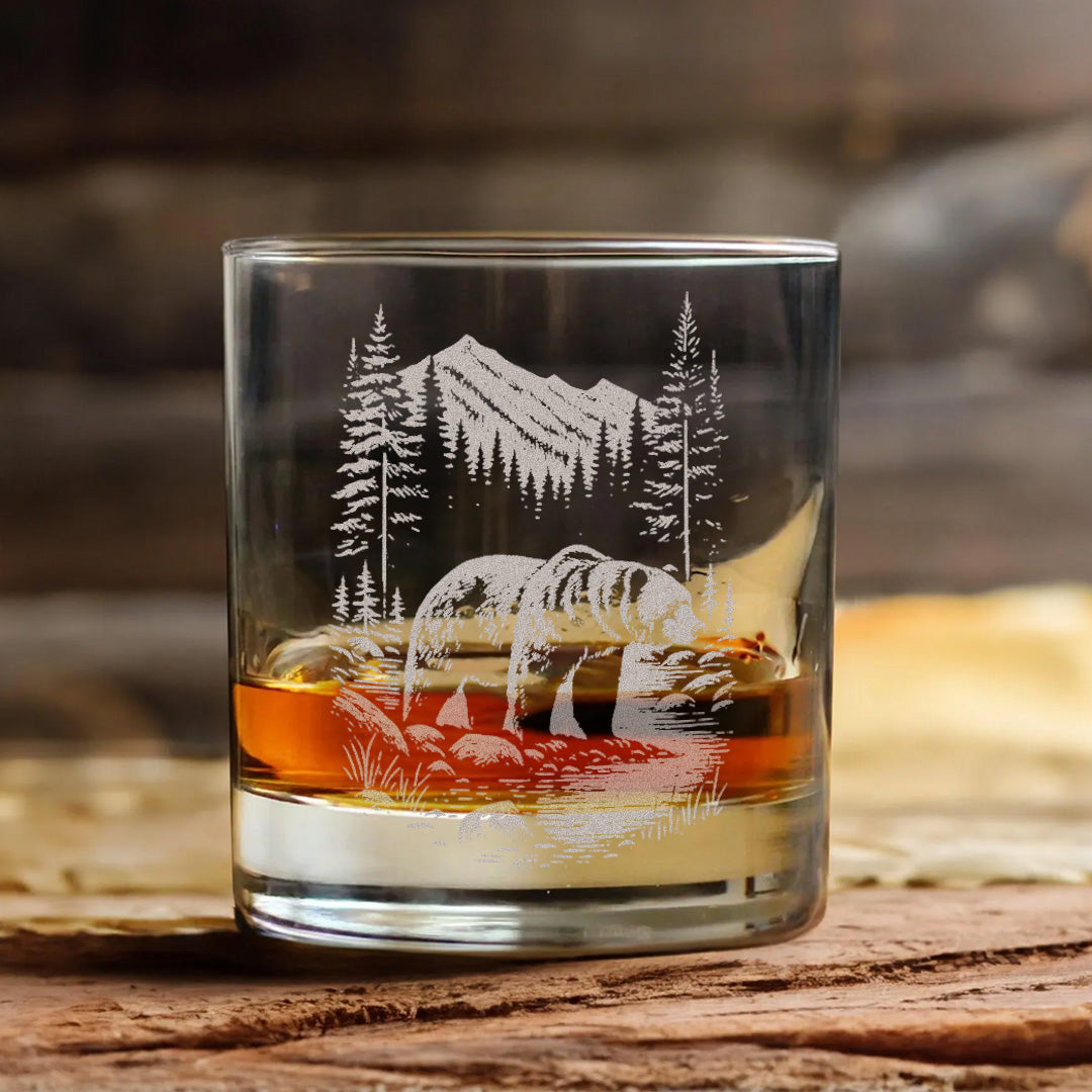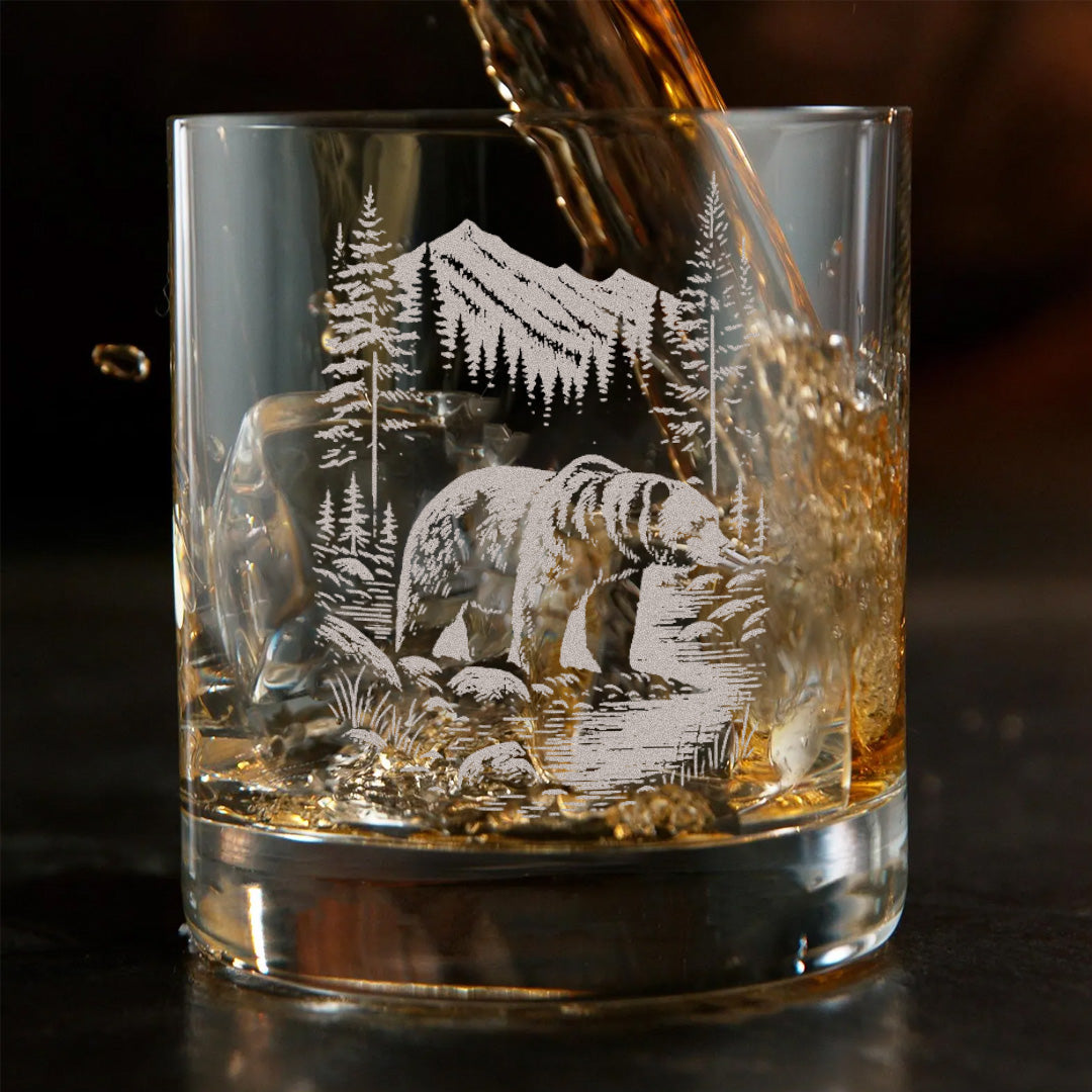 Bear Forest Engraved Whiskey Glass, Rustic Barware Gift for Hunters, Outdoorsmen & Drinking Lovers