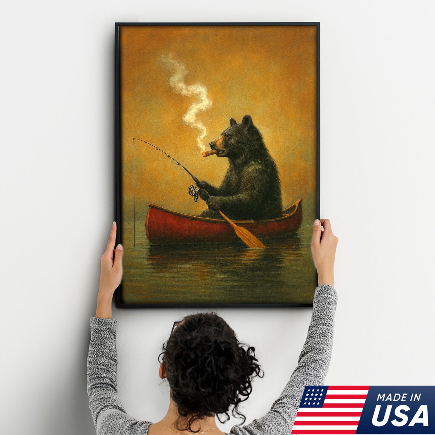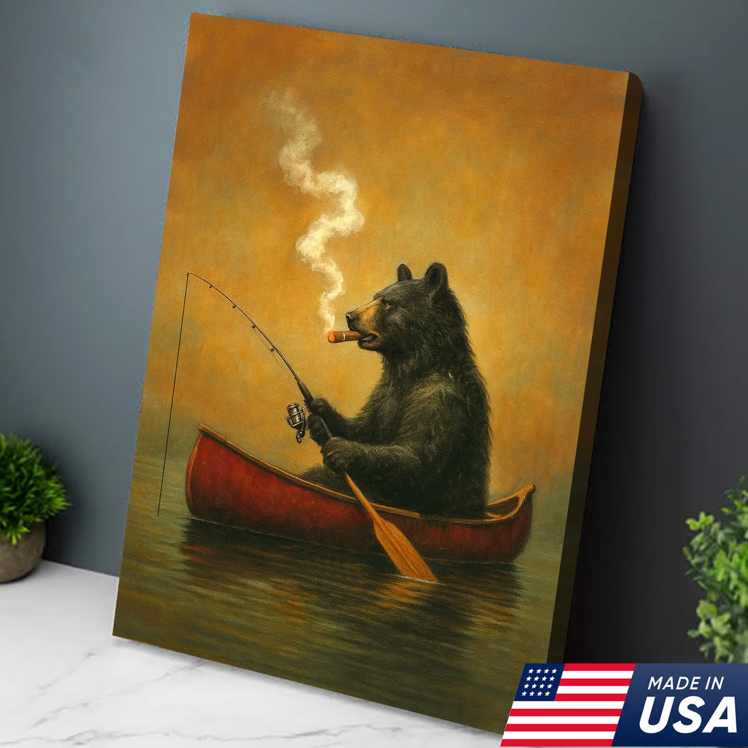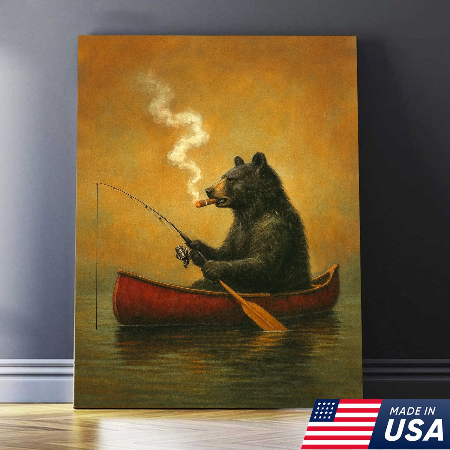 Bear Smoking Fishing Canvas, Funny Lodge Wall Art, Canoe Fishing Rustic Cabin Wall Art