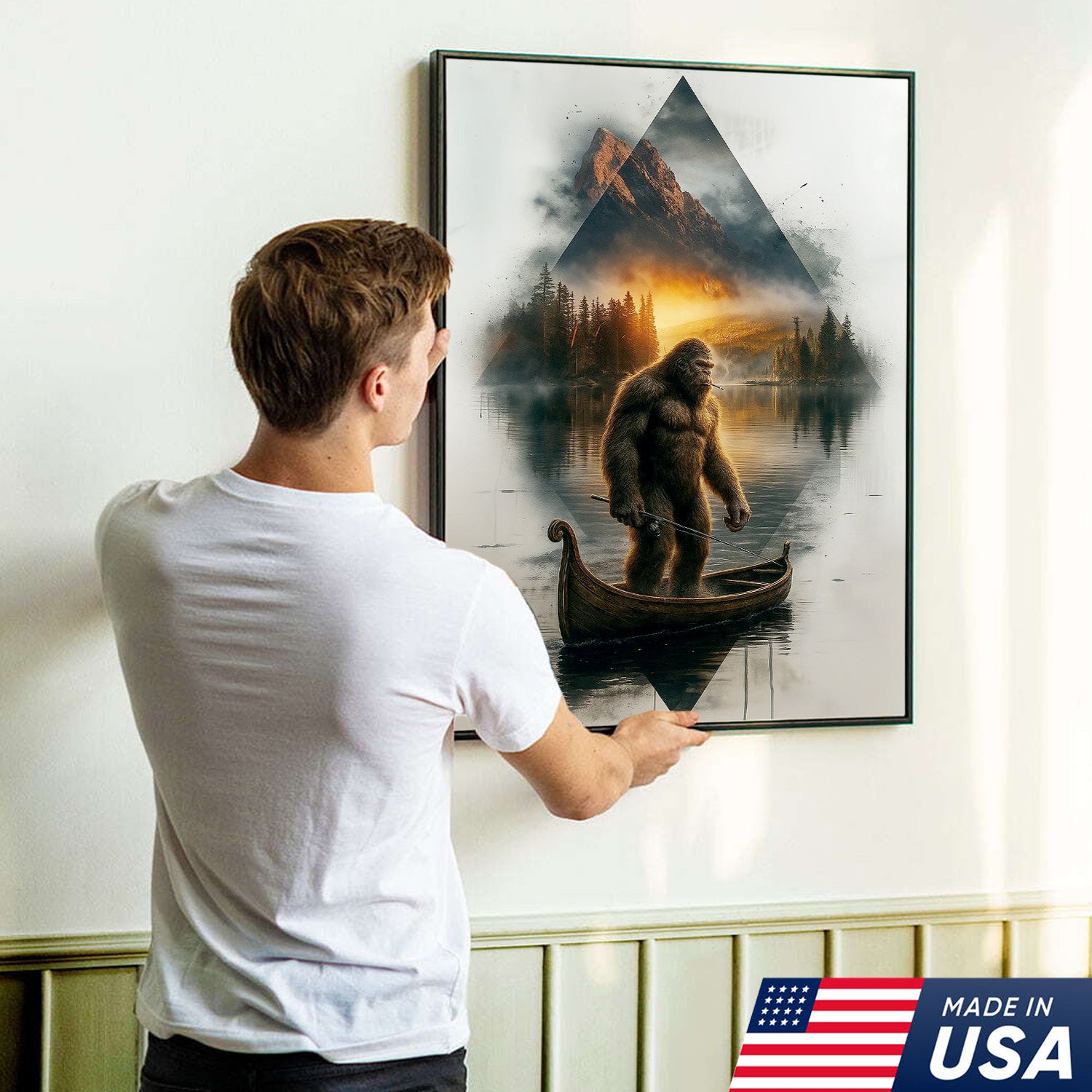 Bigfoot Fishing On Wooden Boat Adventure Canvas Wall Art – Mysterious Forest Lake Decor – Rustic Cabin & Lodge Artwork