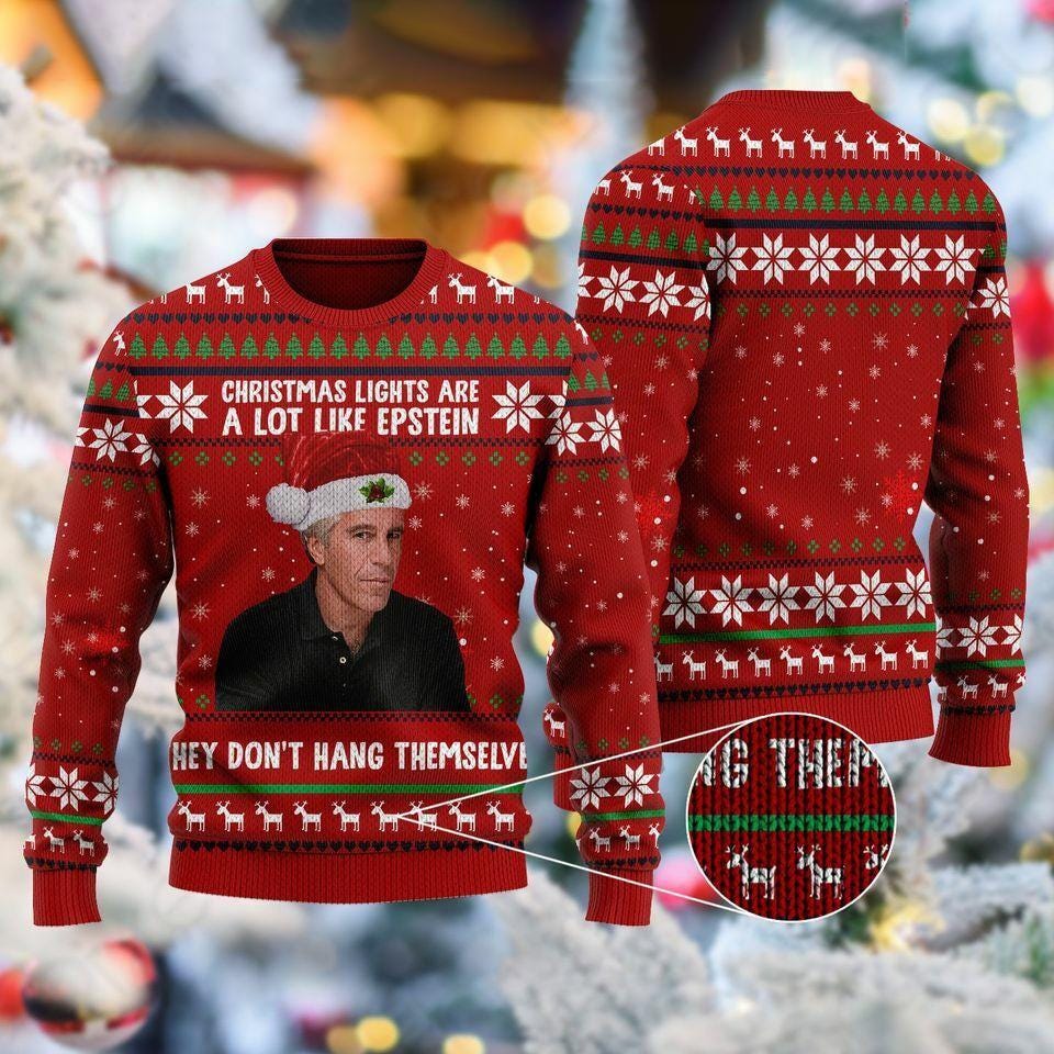 Christmas Lights Ugly Wool Sweater - Funny Epstein Meme Design - Red Knit Holiday Sweater for Ugly Sweater Parties and Gag Gifts