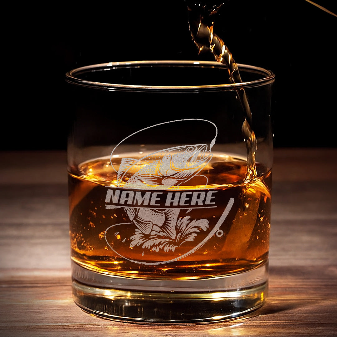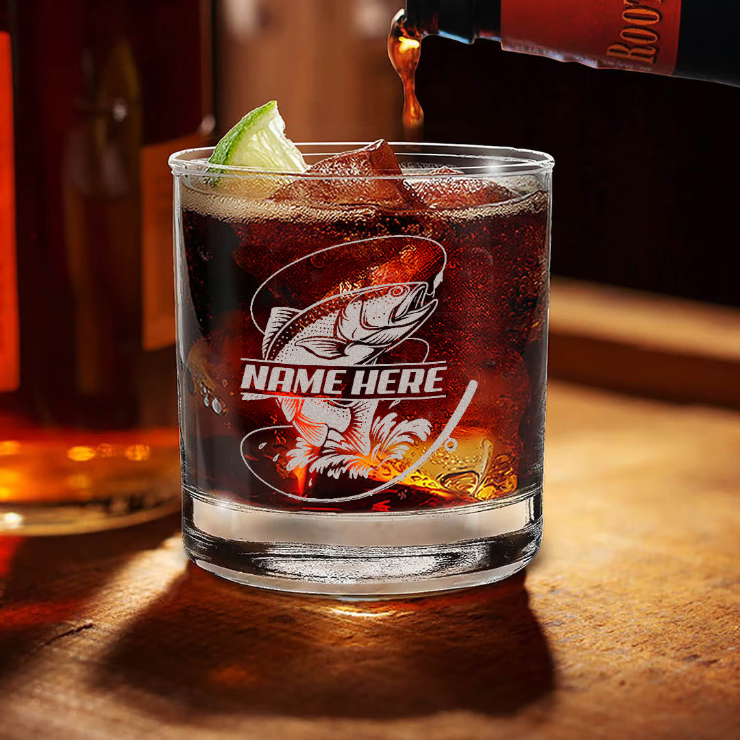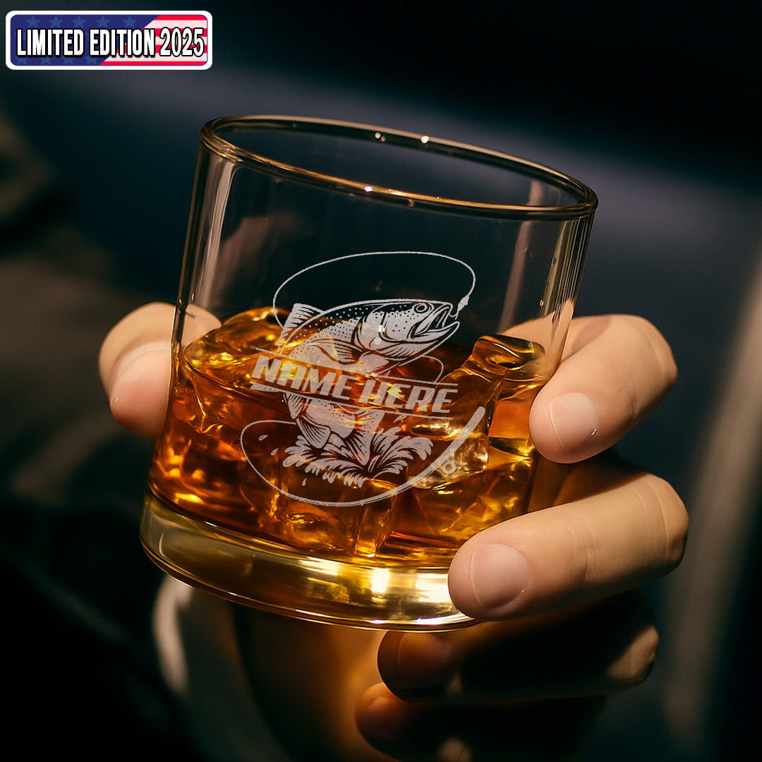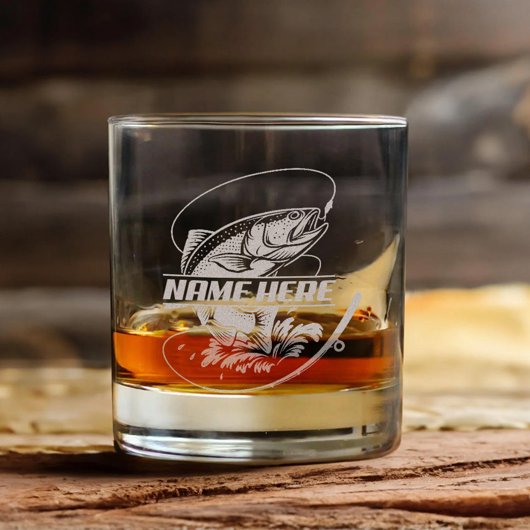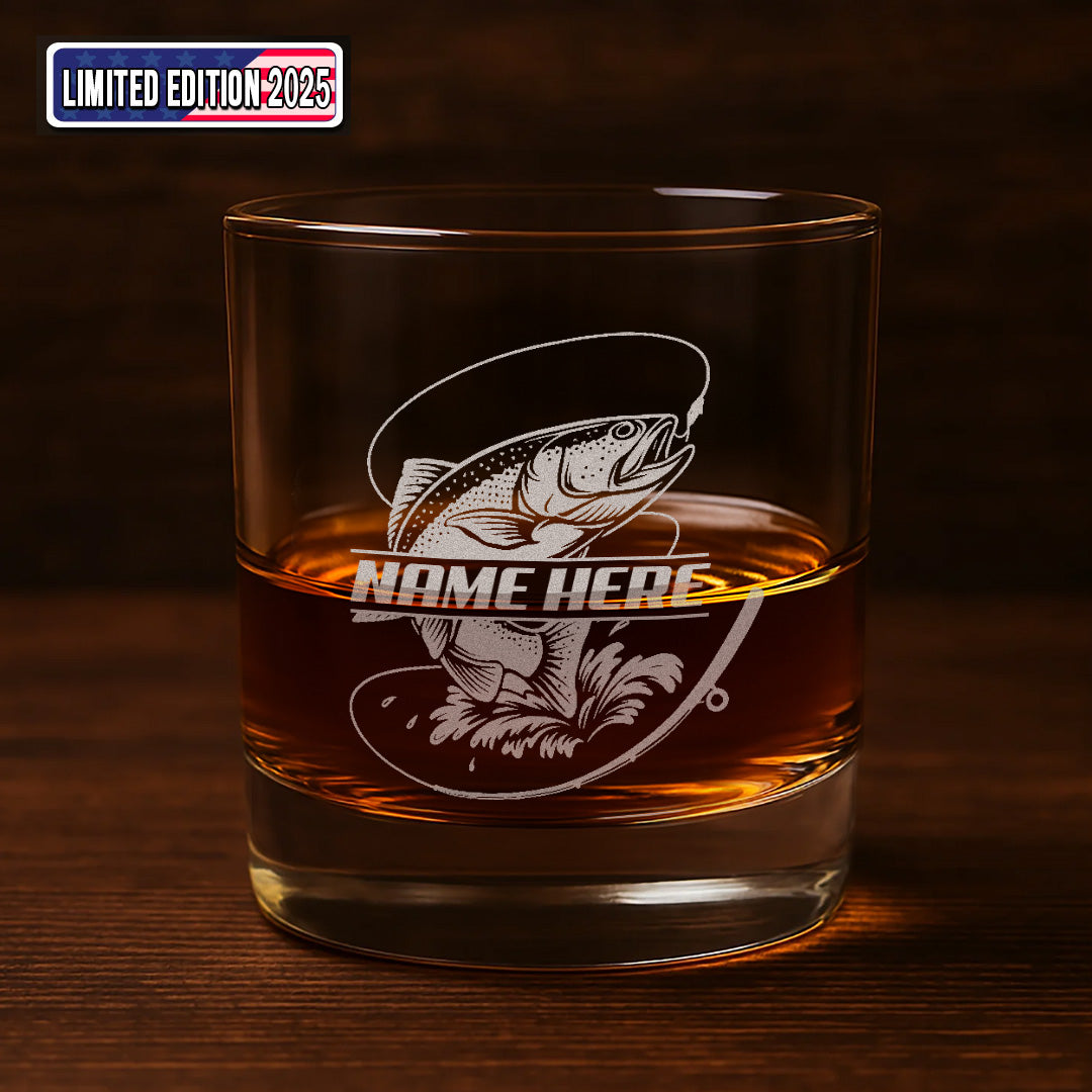 Custom Name Trout Fishing Whiskey Glass – Personalized Engraved Fly Fisherman Gift