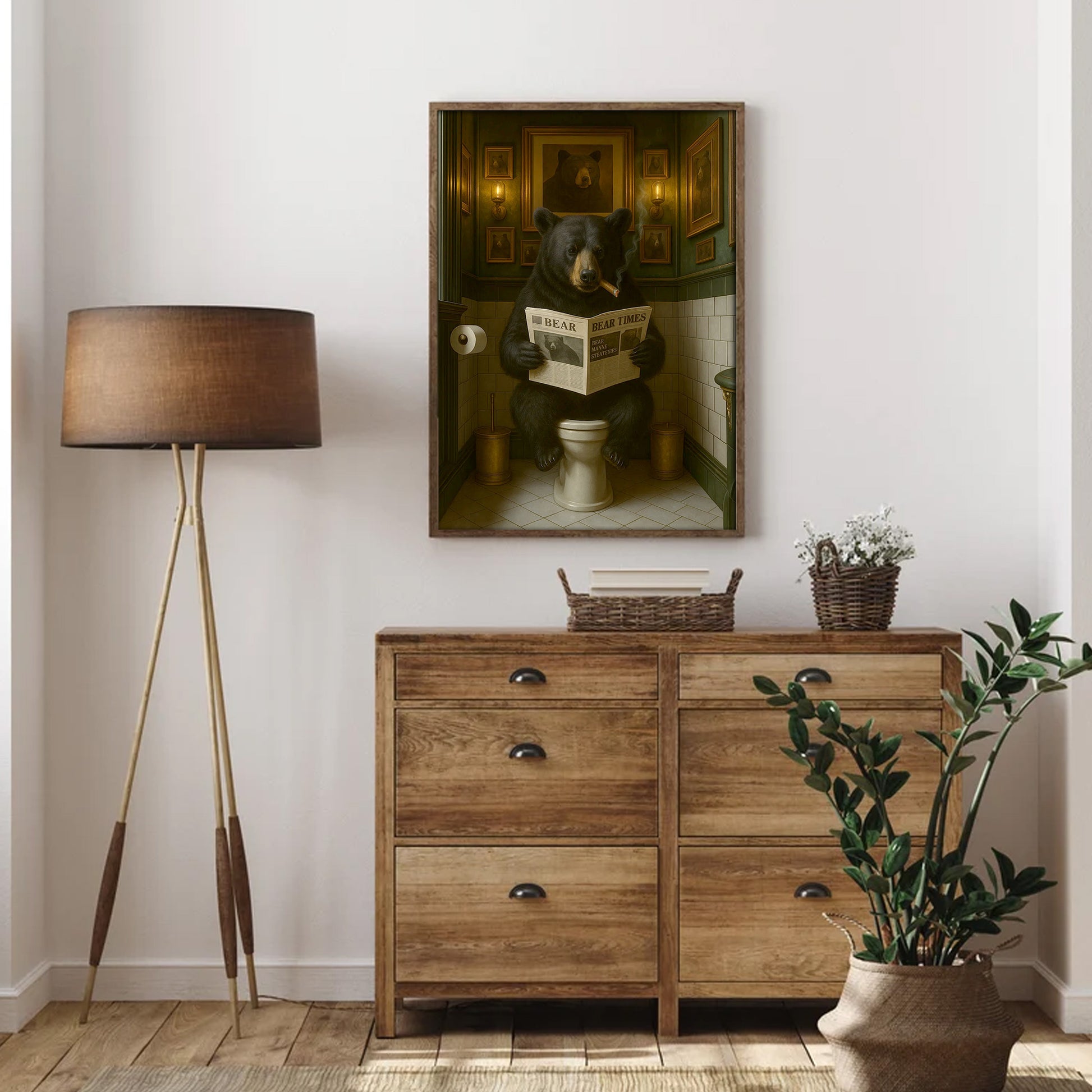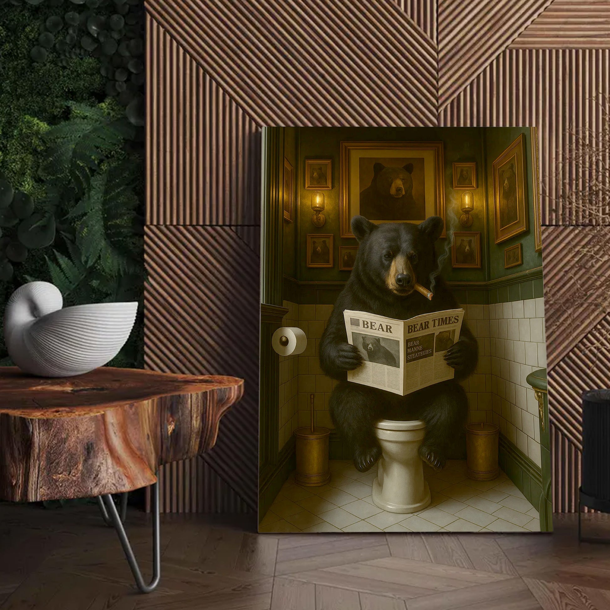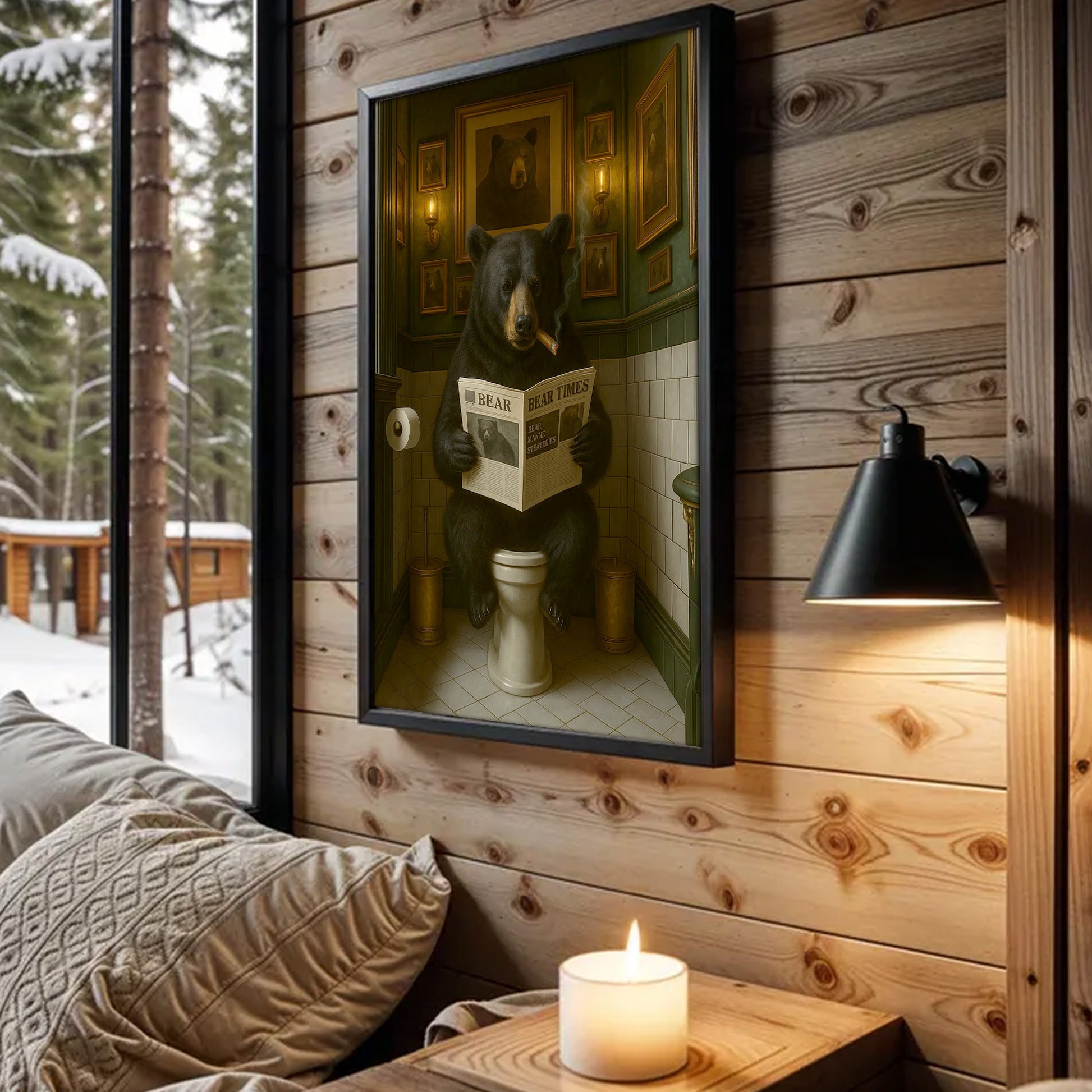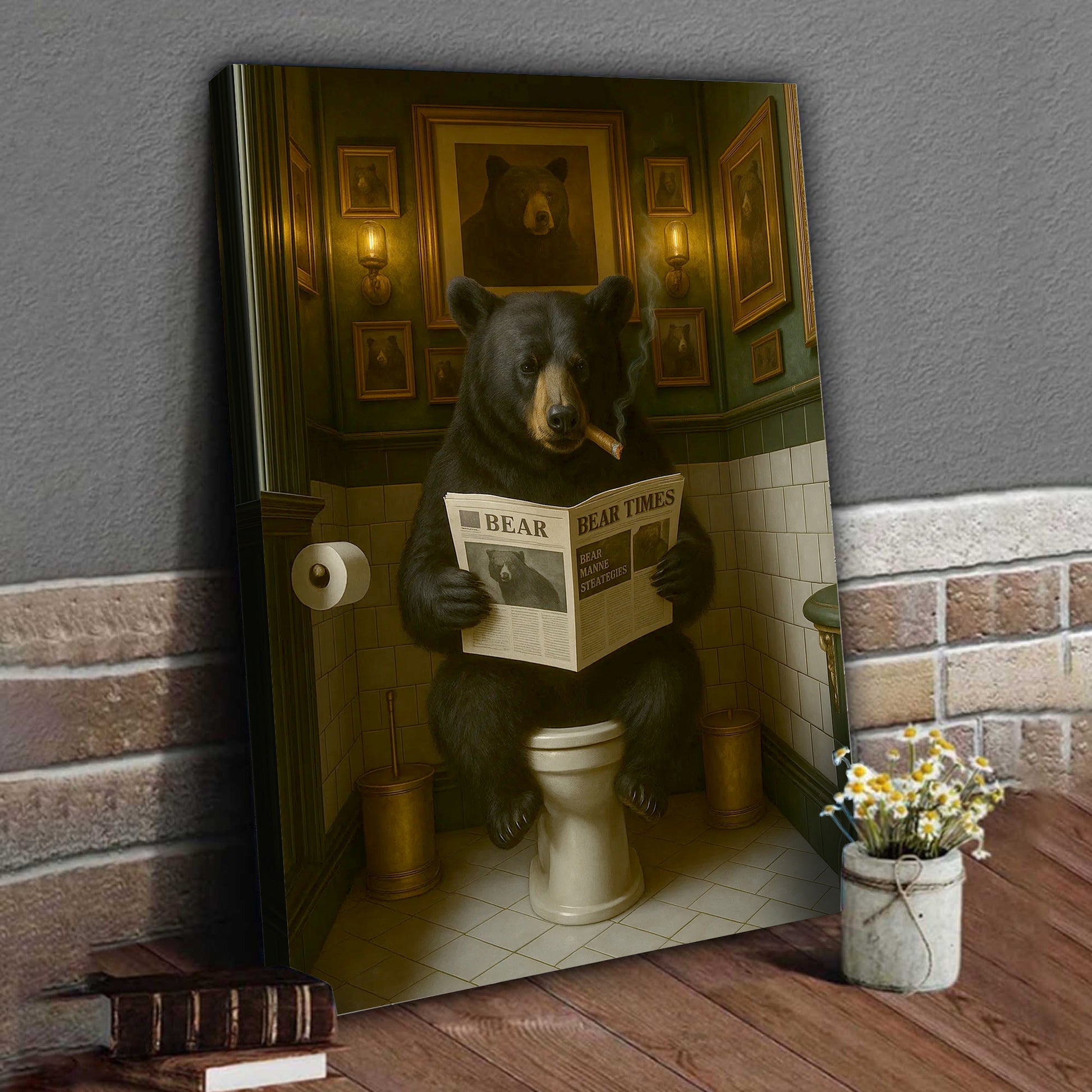 Funny Bear Hunting Bathroom Canvas – Black Bear On Toilet Reading Newspaper - Rustic Lodge Decor for Dad or Hunters