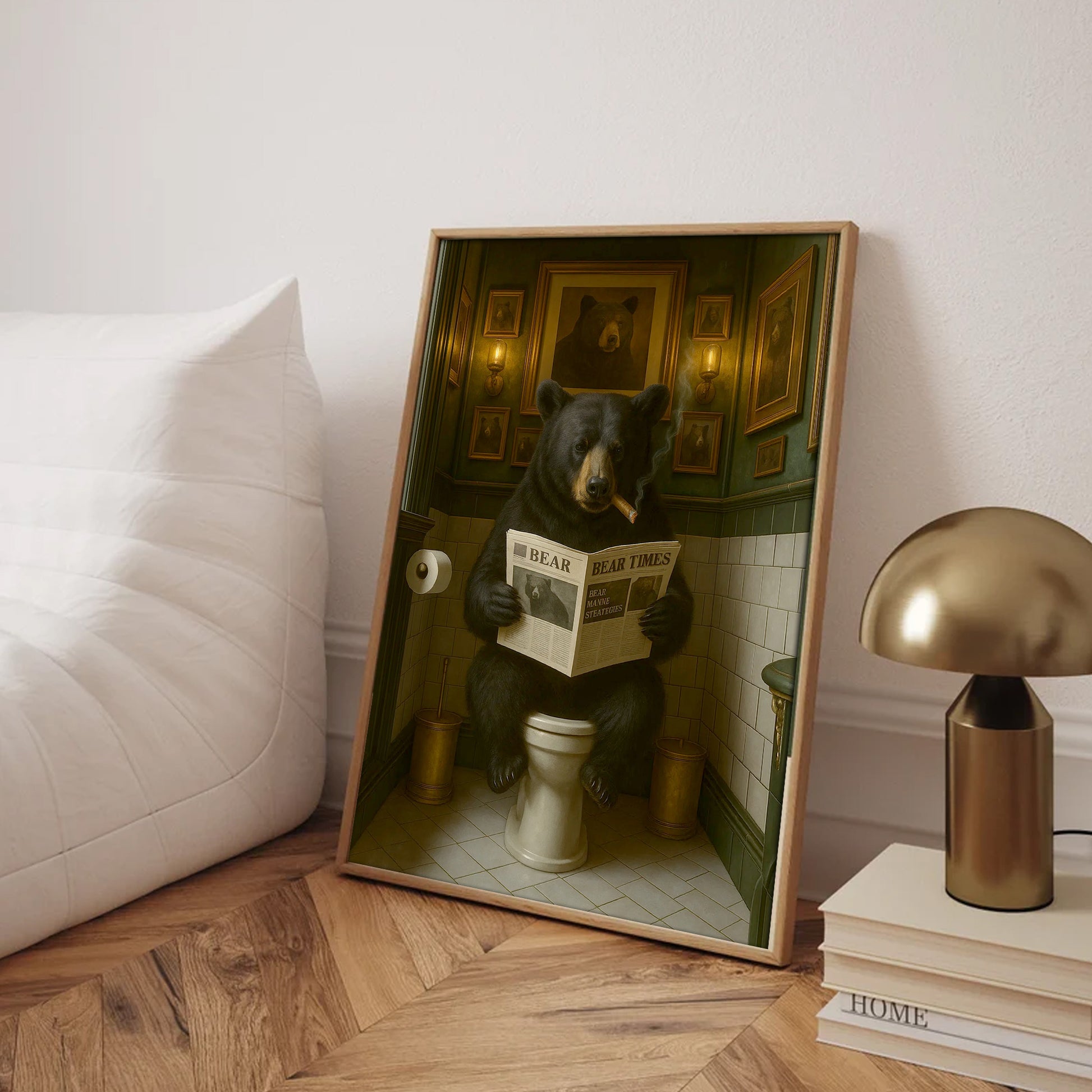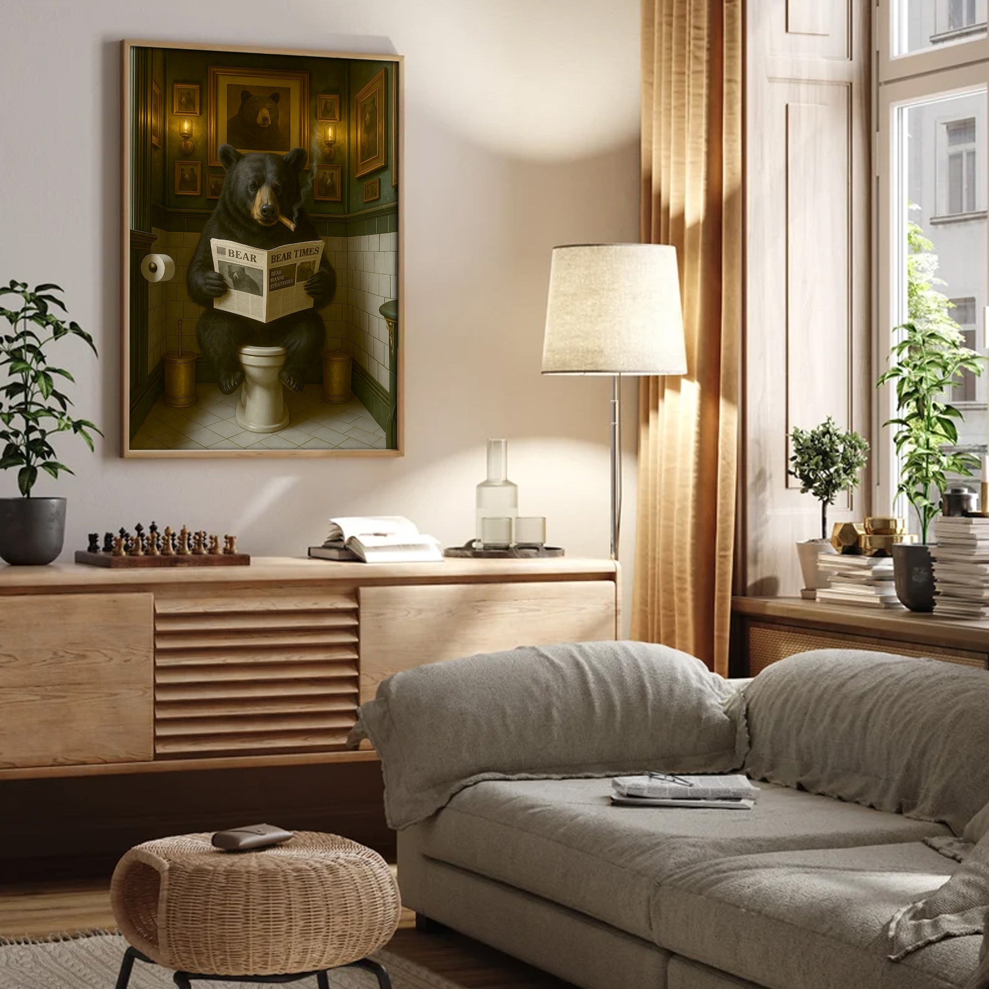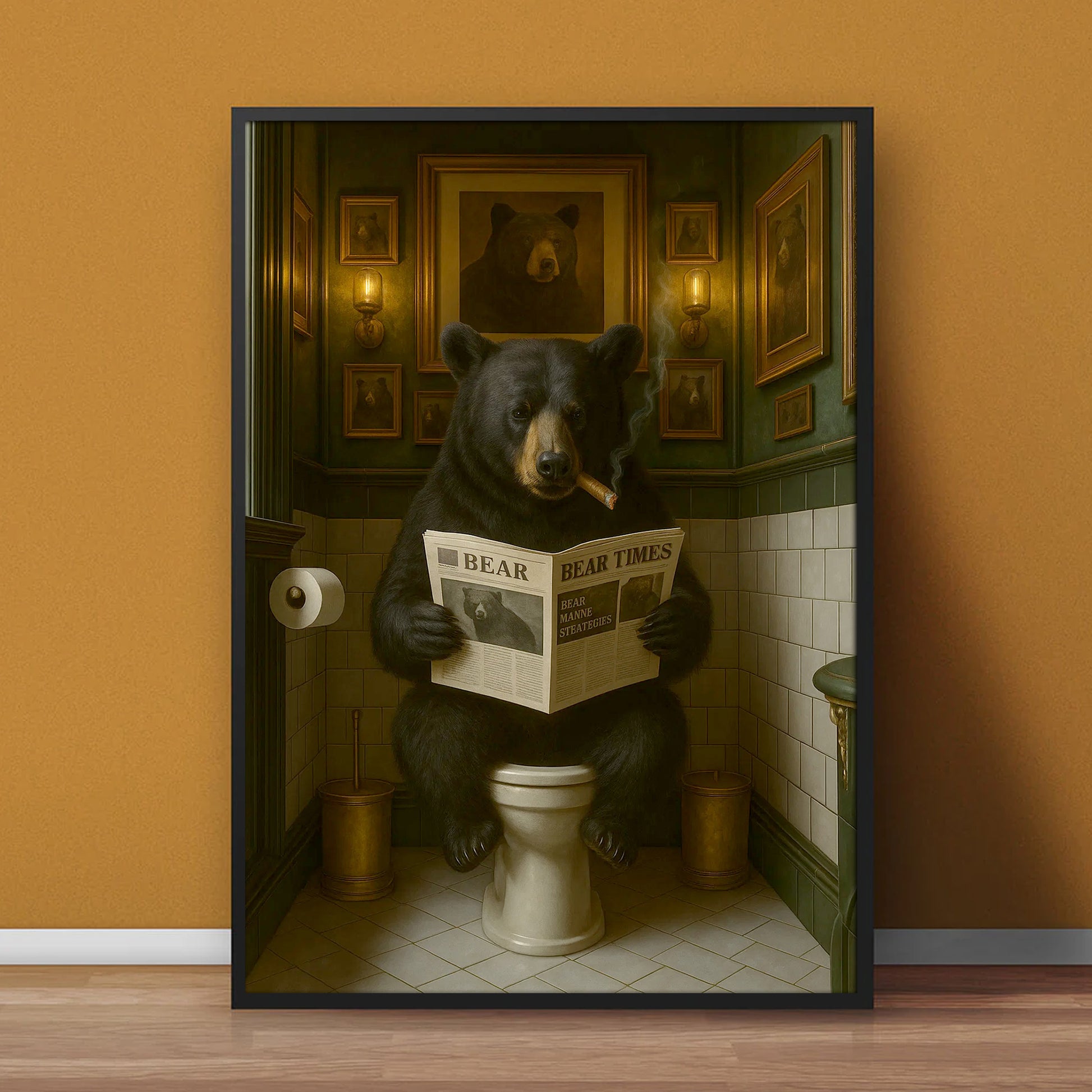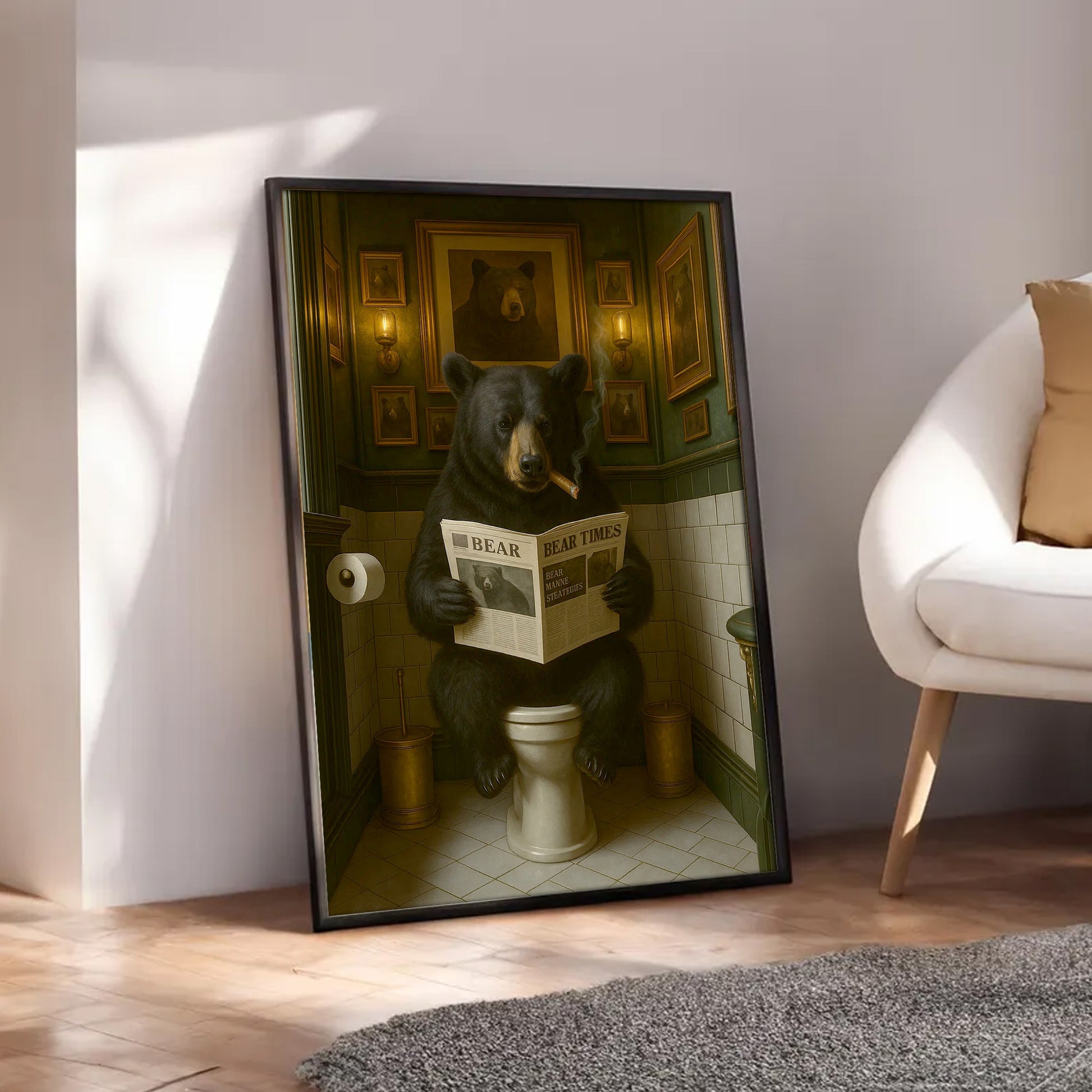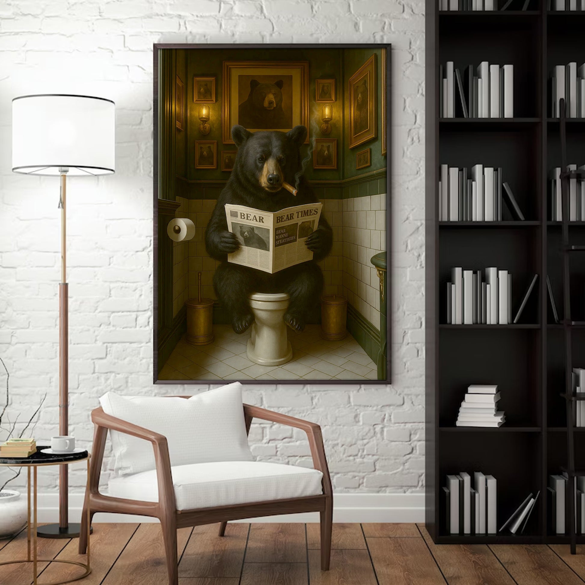 Funny Bear Hunting Bathroom Canvas – Black Bear On Toilet Reading Newspaper - Rustic Lodge Decor for Dad or Hunters