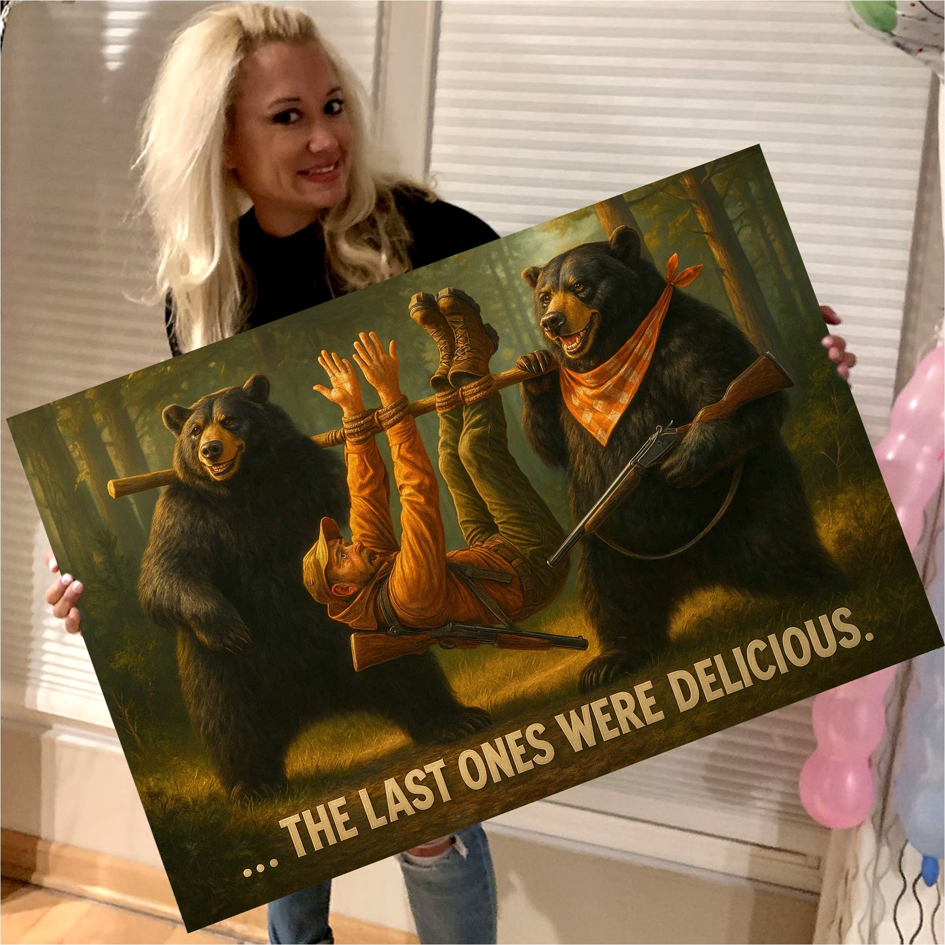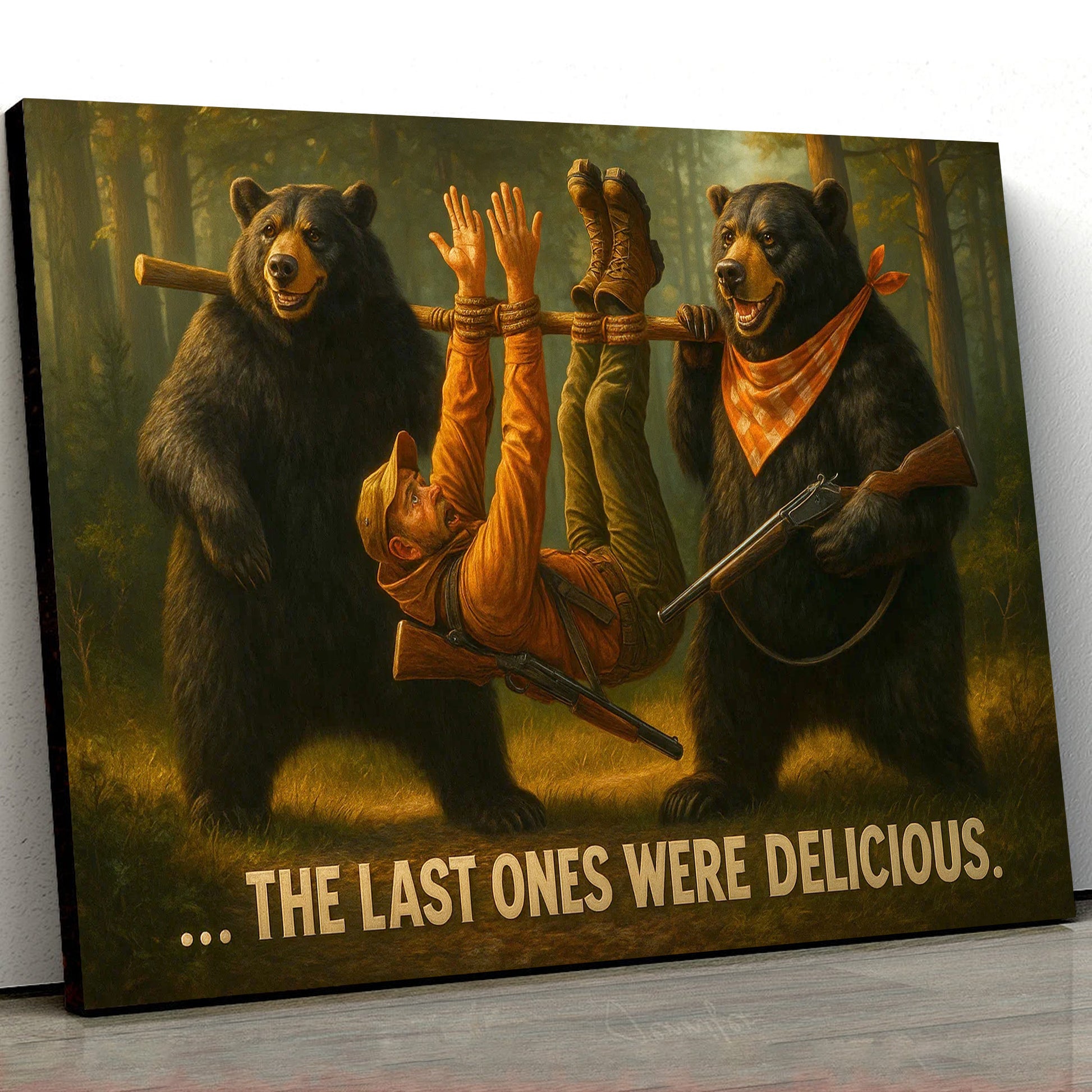 Funny Bear Hunting Canvas Wall Art - Hilarious Wilderness Scene with Hunter - Rustic Cabin and Lodge Decor