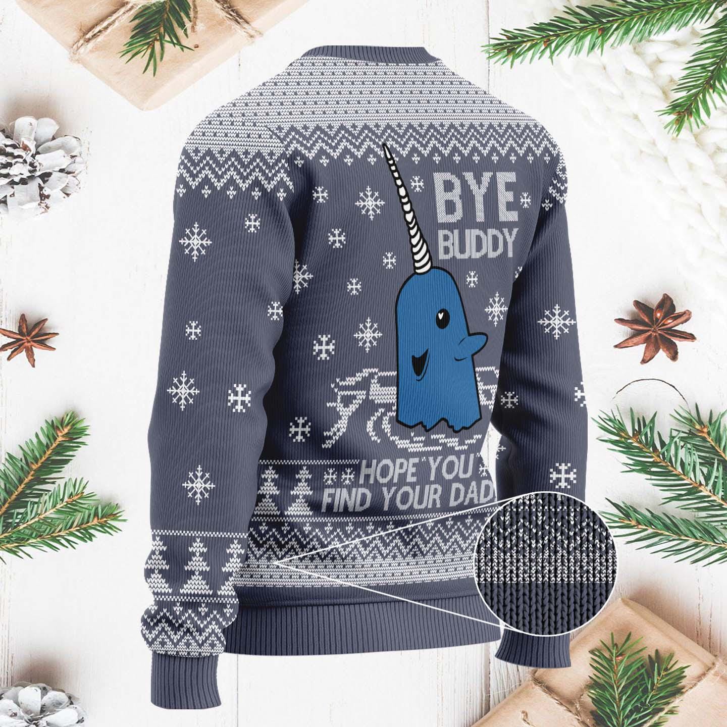 Funny Bye Buddy Narwhal Christmas Sweater - Hope You Find Your Dad Holiday Pullover - Ugly Xmas Sweater for Festive Fun