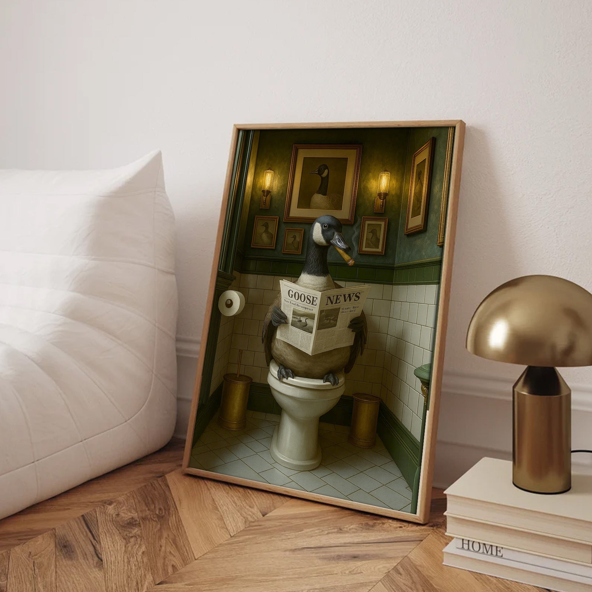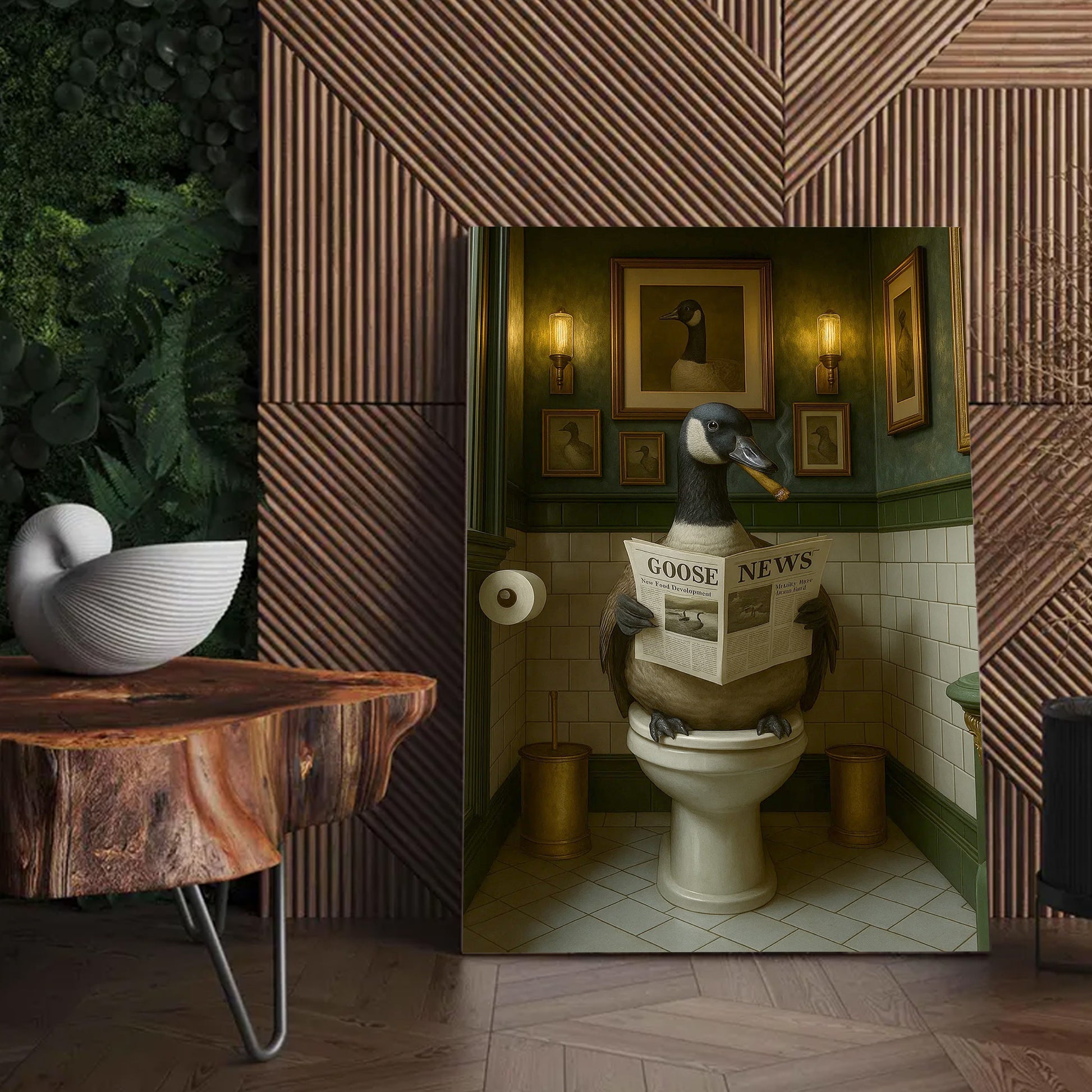 Funny Canada Goose Bathroom Poster – Rustic Cabin Wall Art, Goose Reading Newspaper on Toilet - Canvas Gift for Hunters