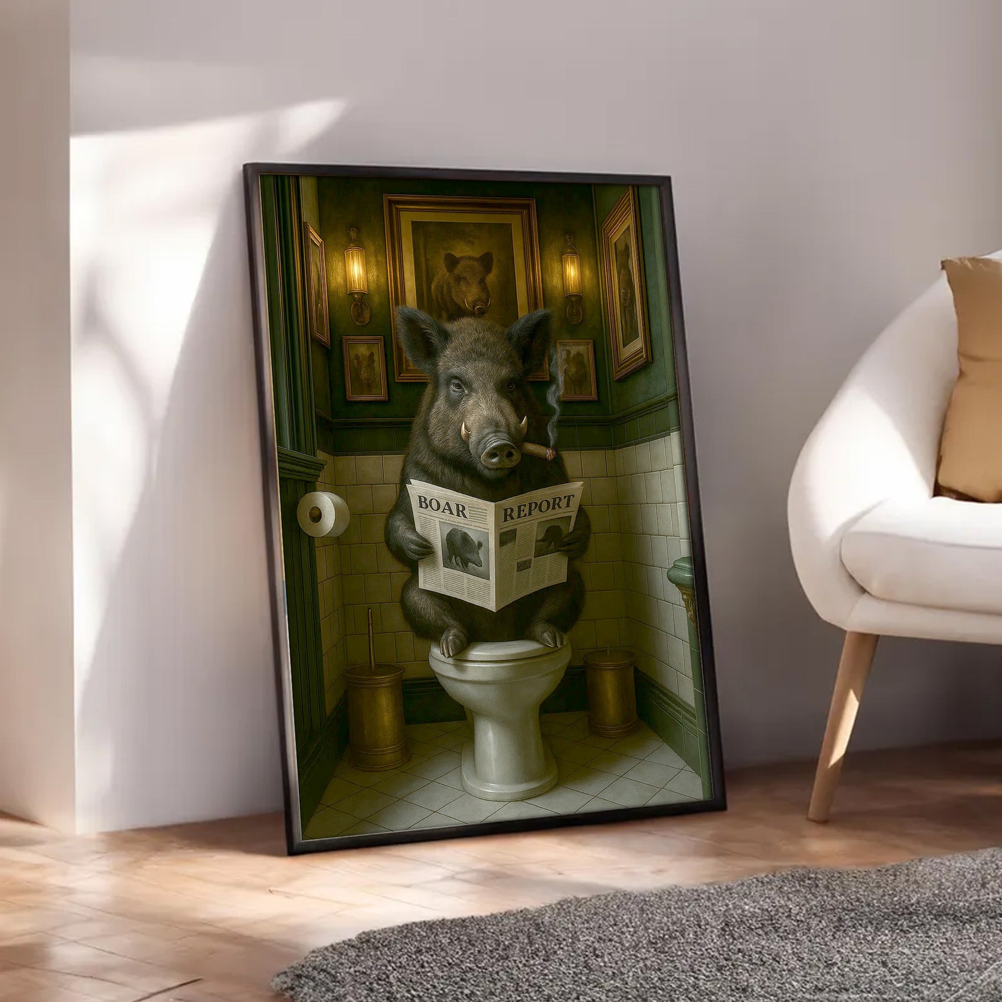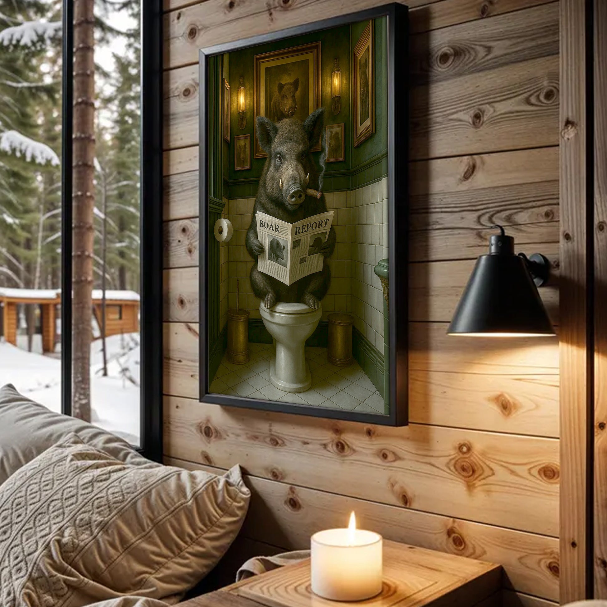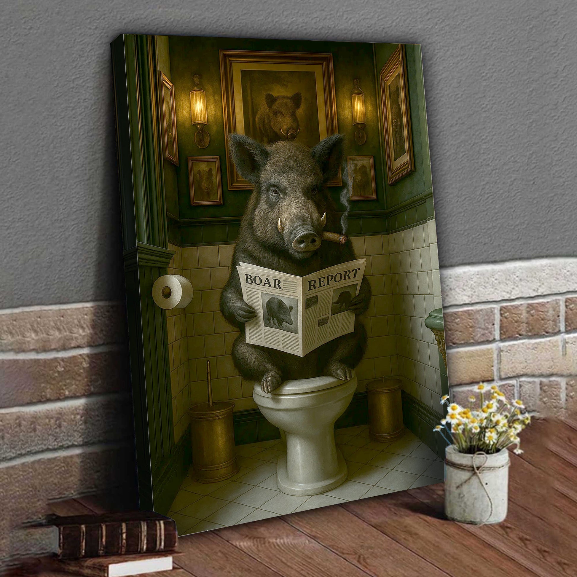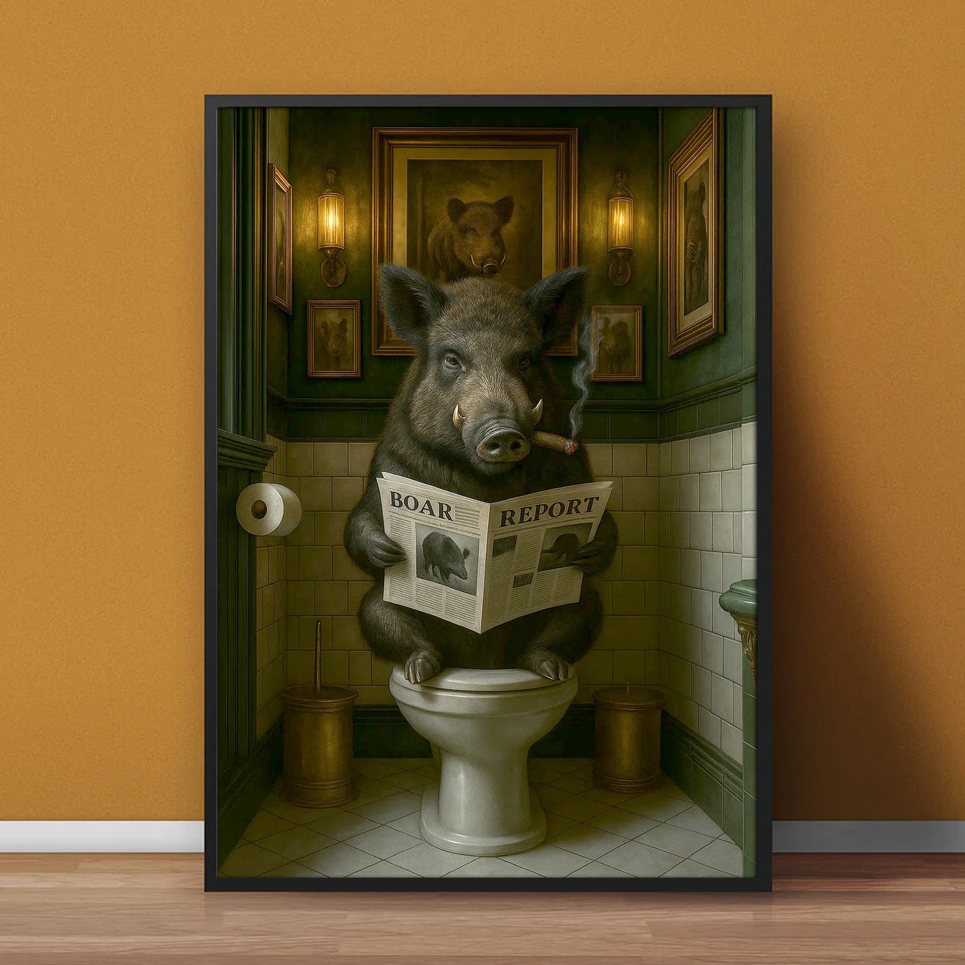 Funny Comical Wild Hog Poster – Smoking Boar on Toilet - Unique Rustic Gift for Hunters or Cabin Bathroom Decor