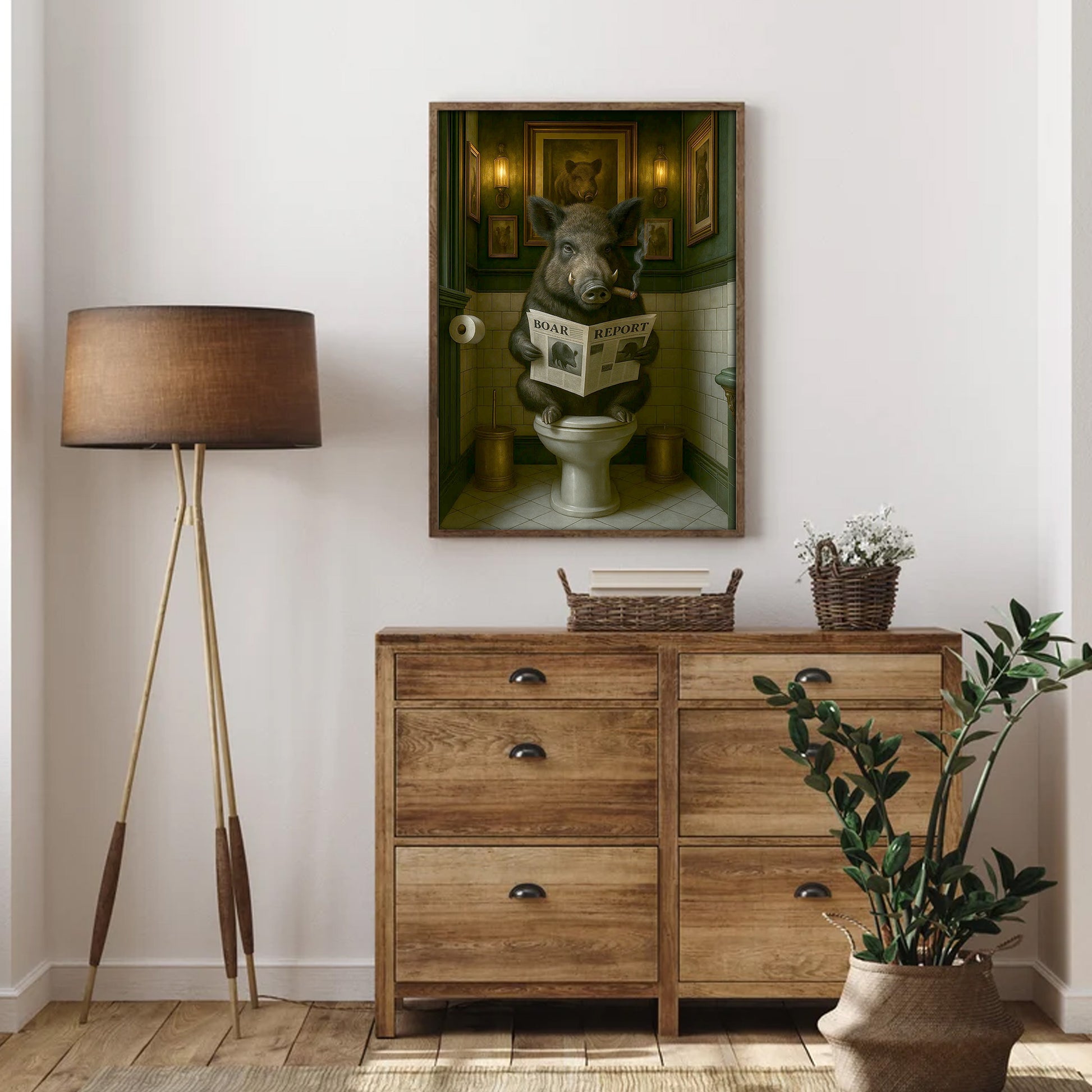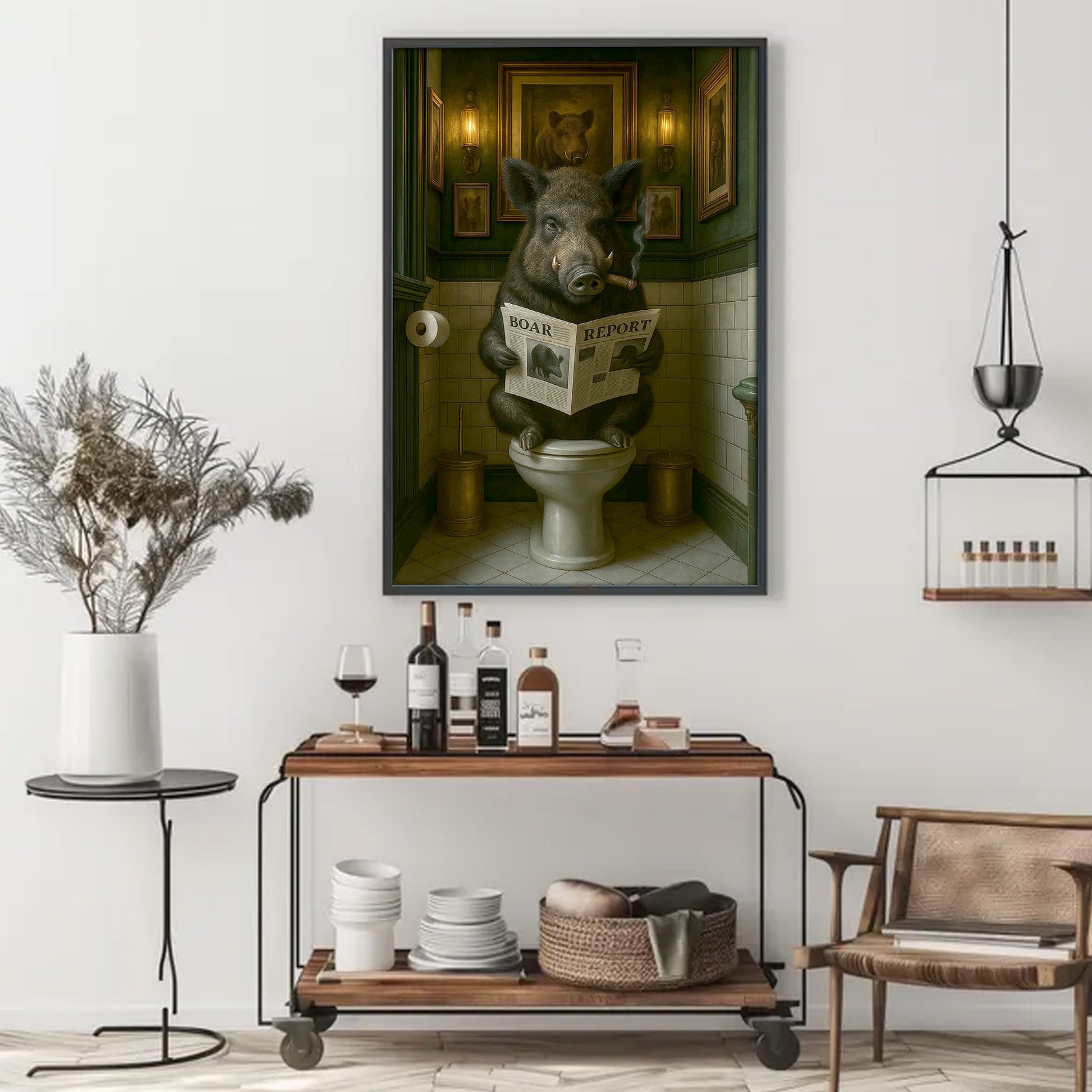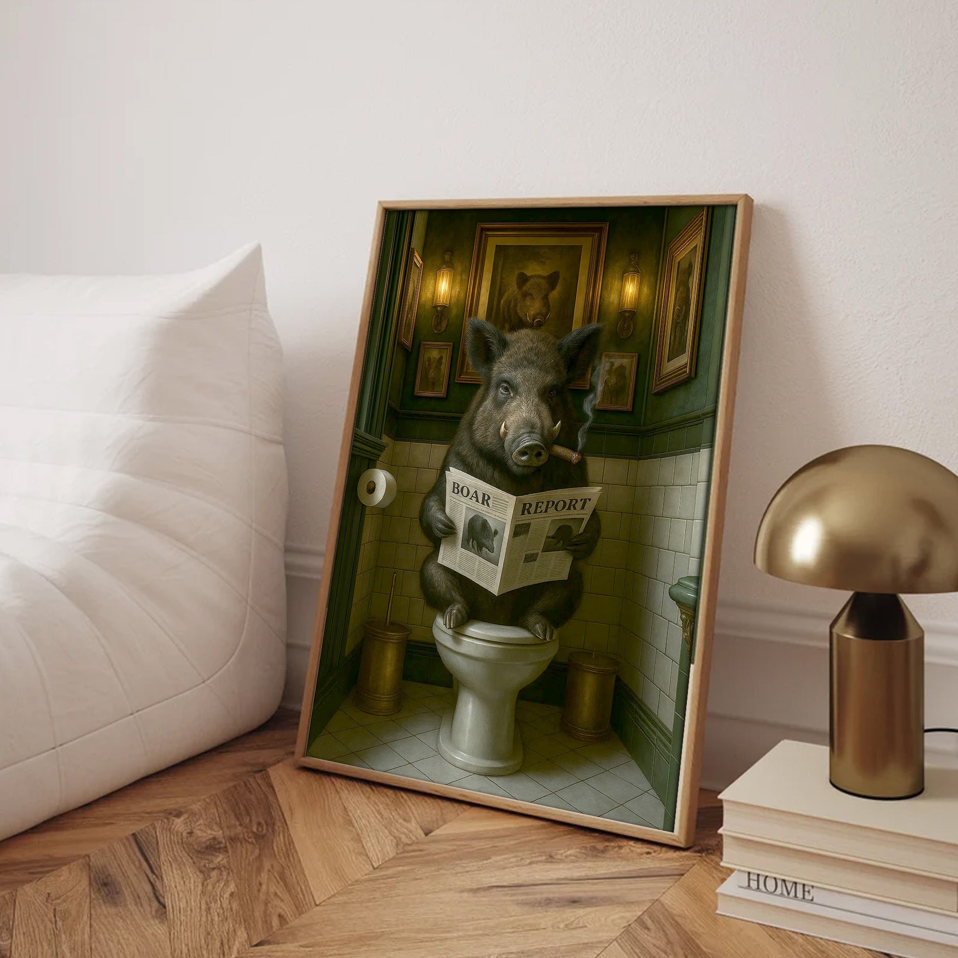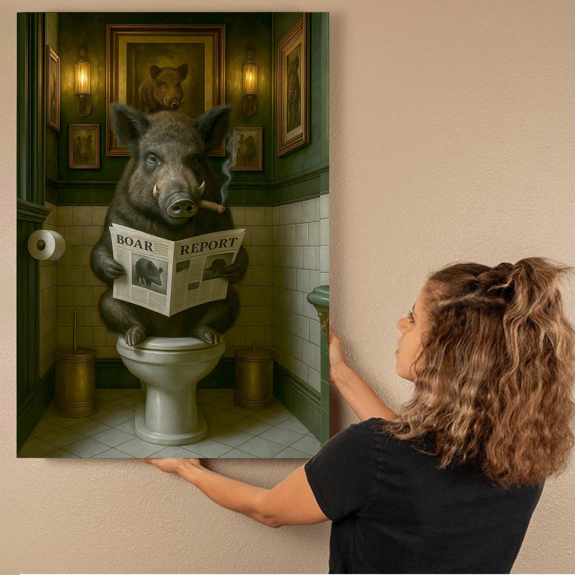 Funny Comical Wild Hog Poster – Smoking Boar on Toilet - Unique Rustic Gift for Hunters or Cabin Bathroom Decor