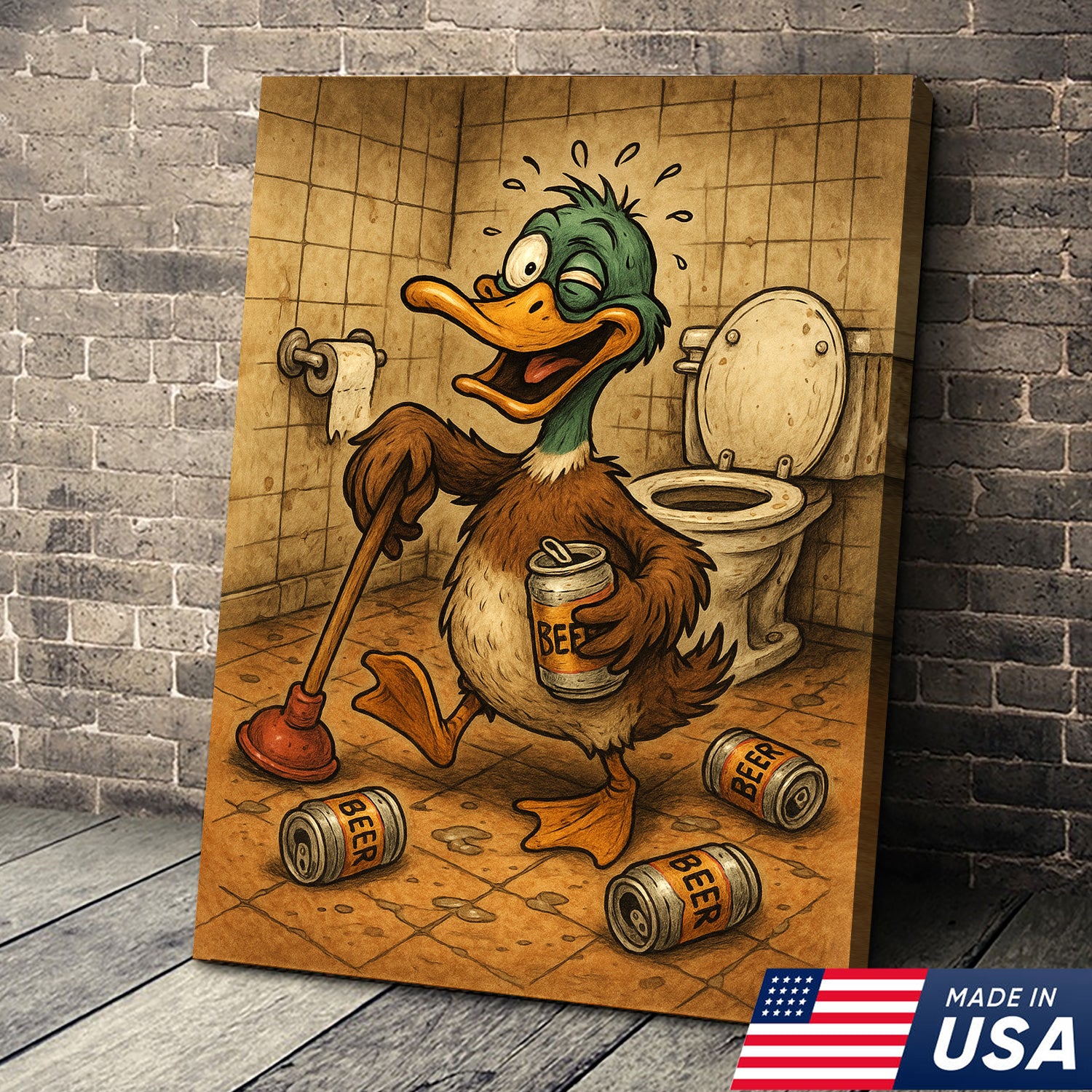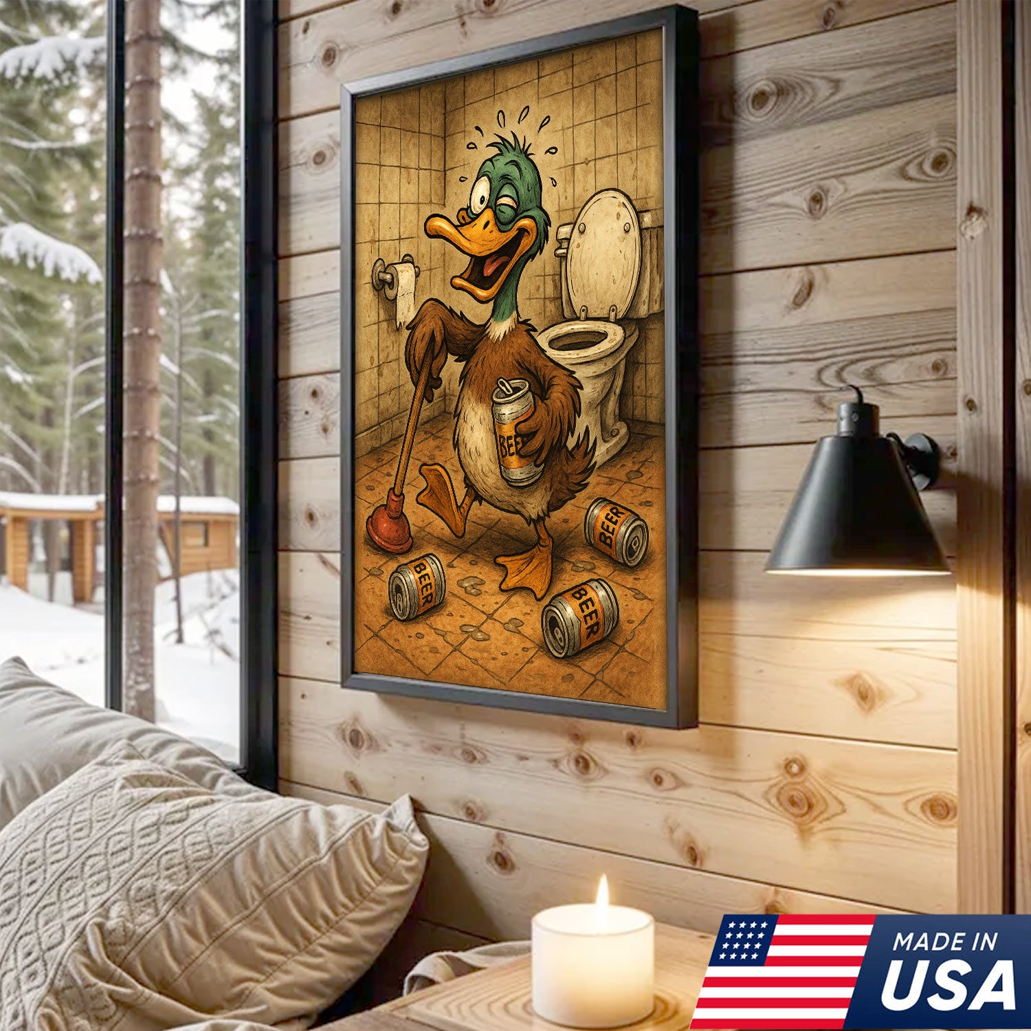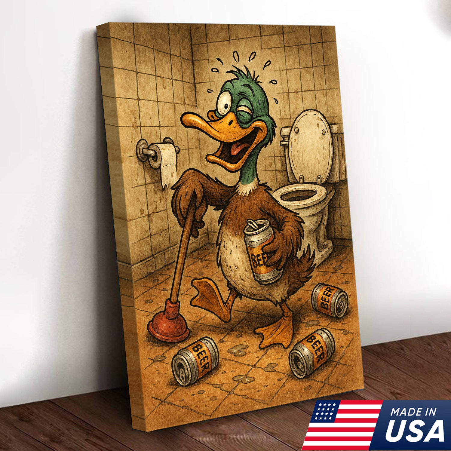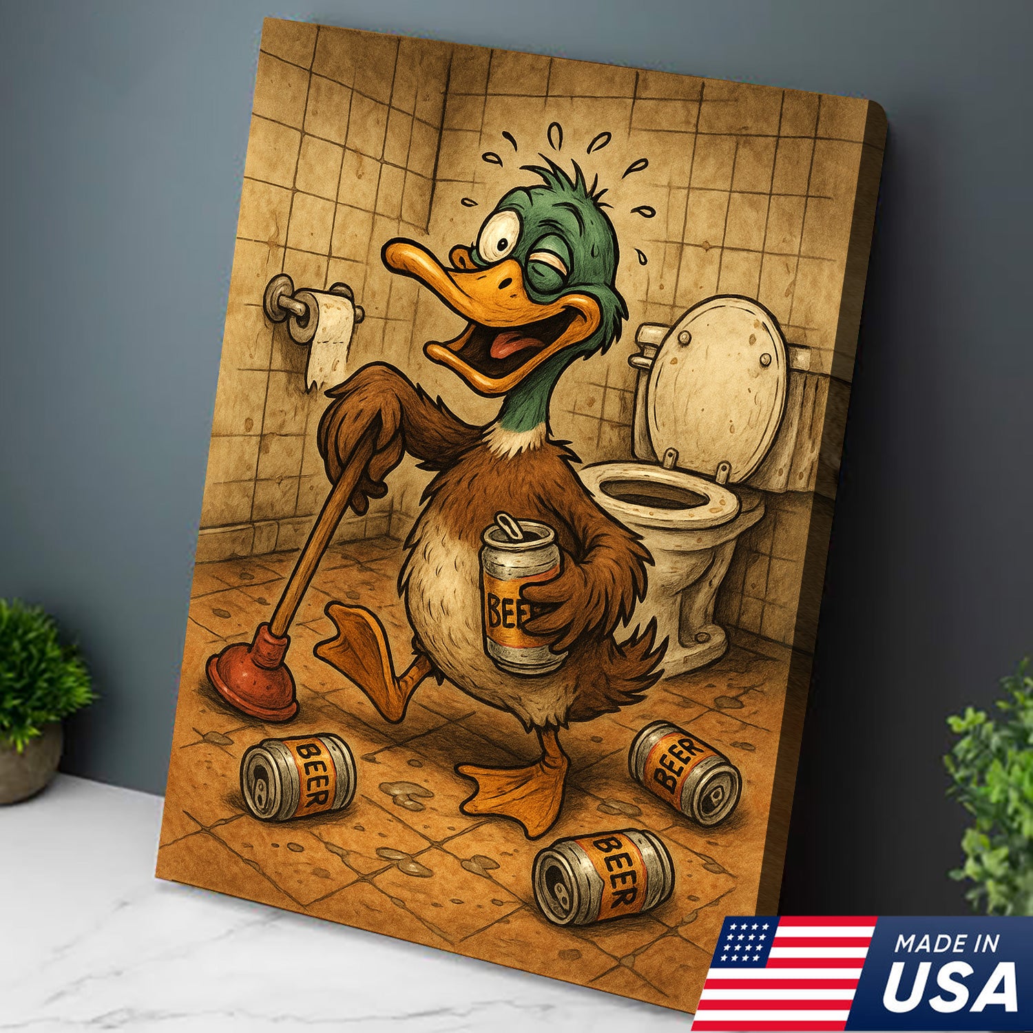 Funny Duck Canvas Wall Art – Hilarious Bathroom Decor with Soda Cans and Plunger for Rustic Cabin & Home