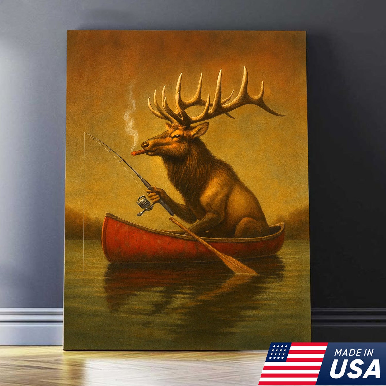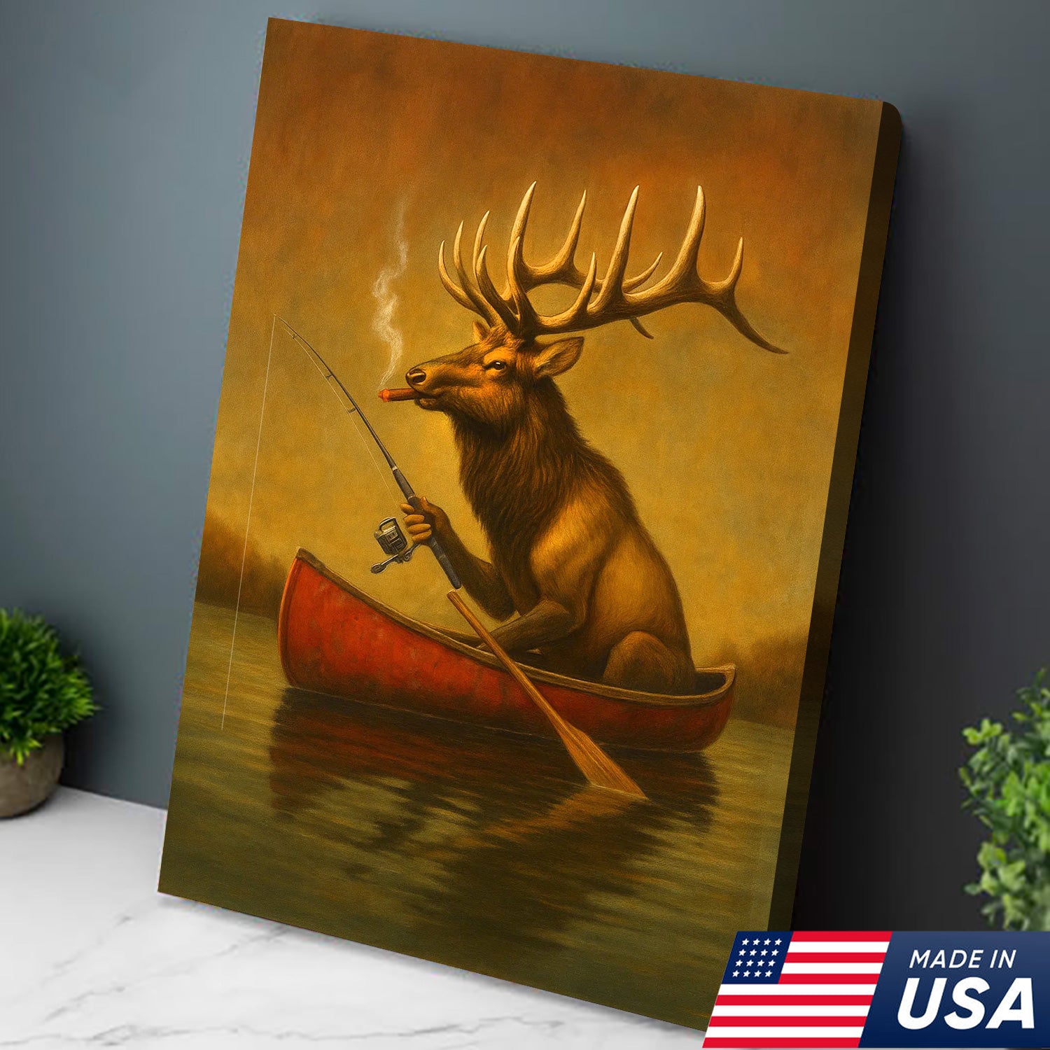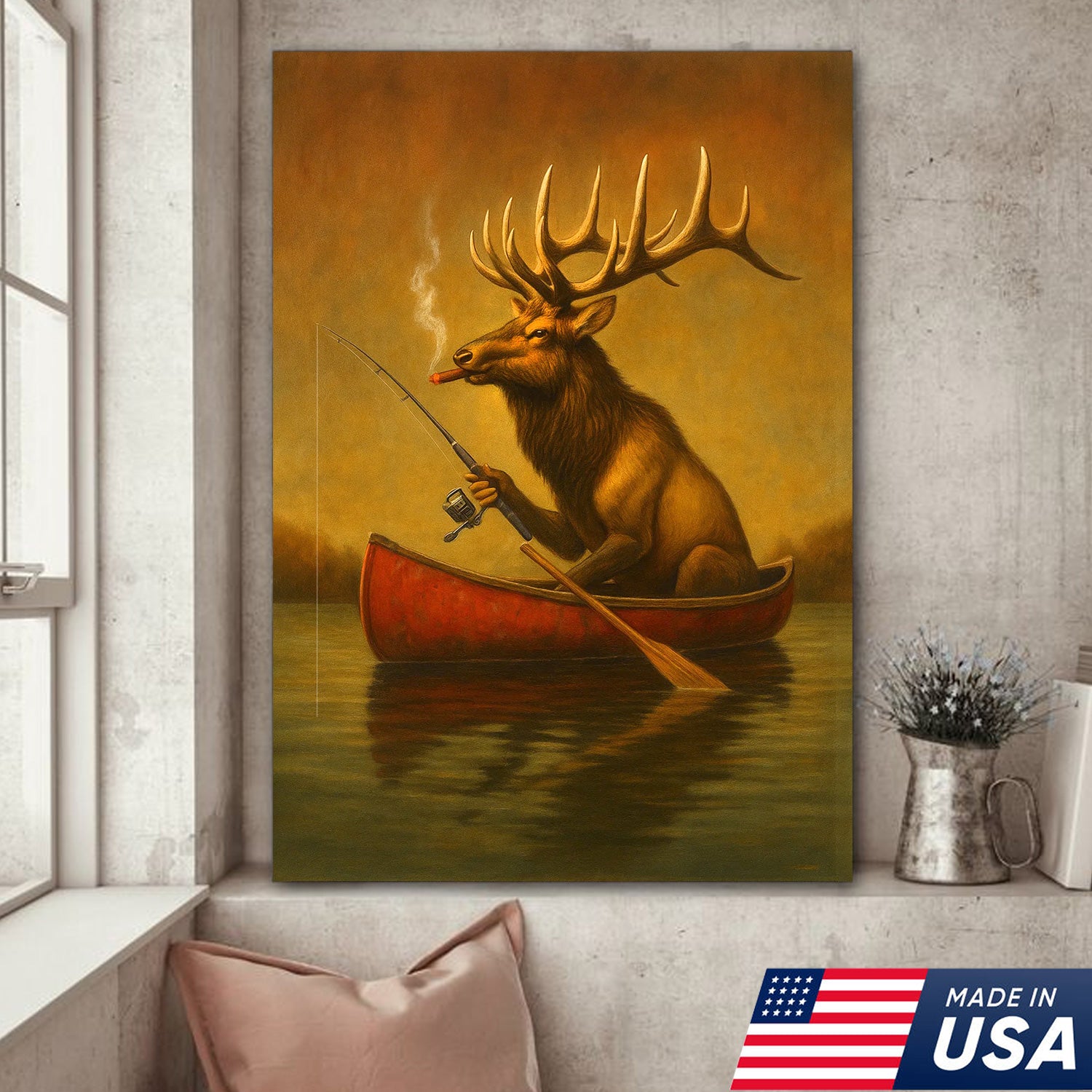Funny Elk Fishing Canvas Wall Art – Rustic Cabin Decor for Hunters & Fishermen