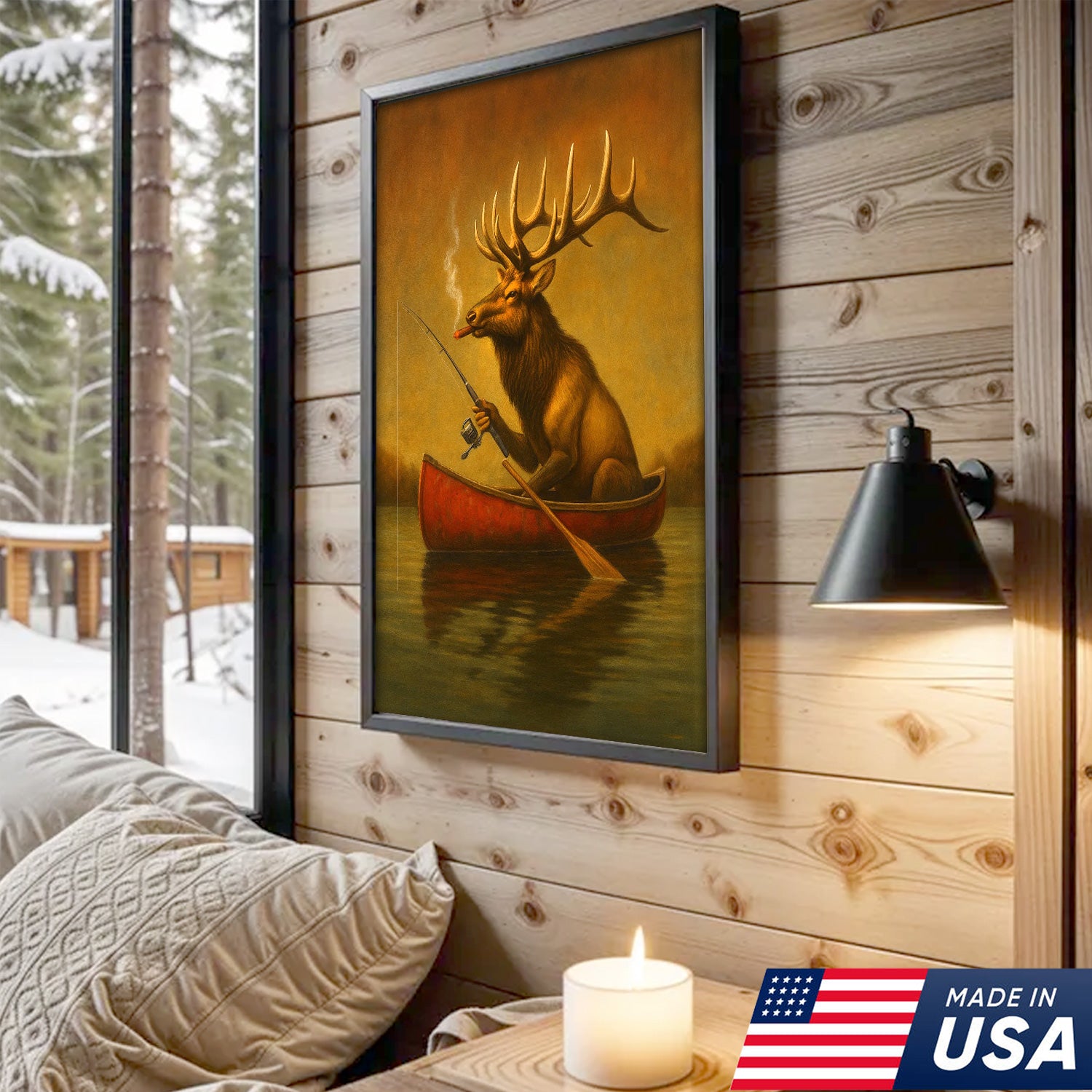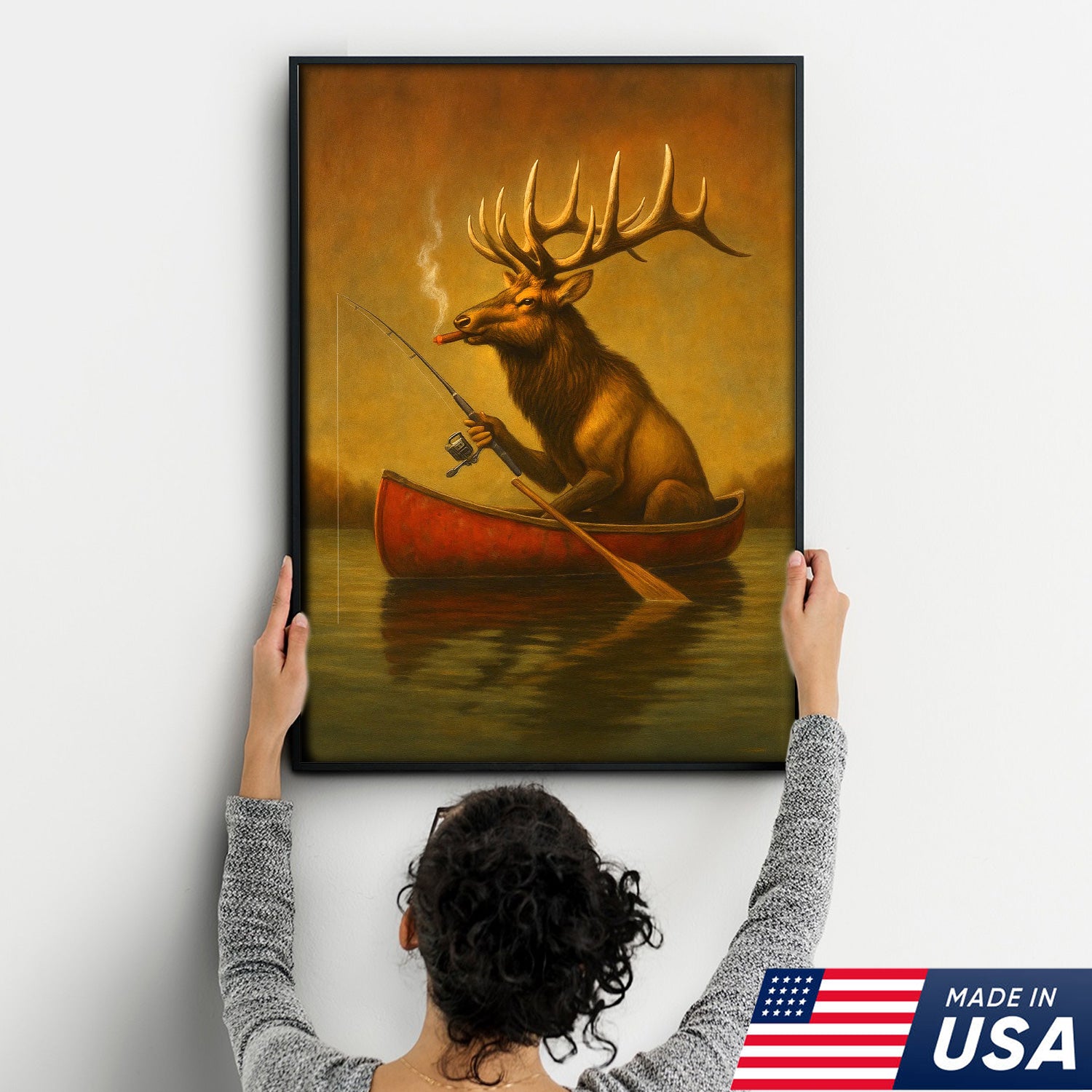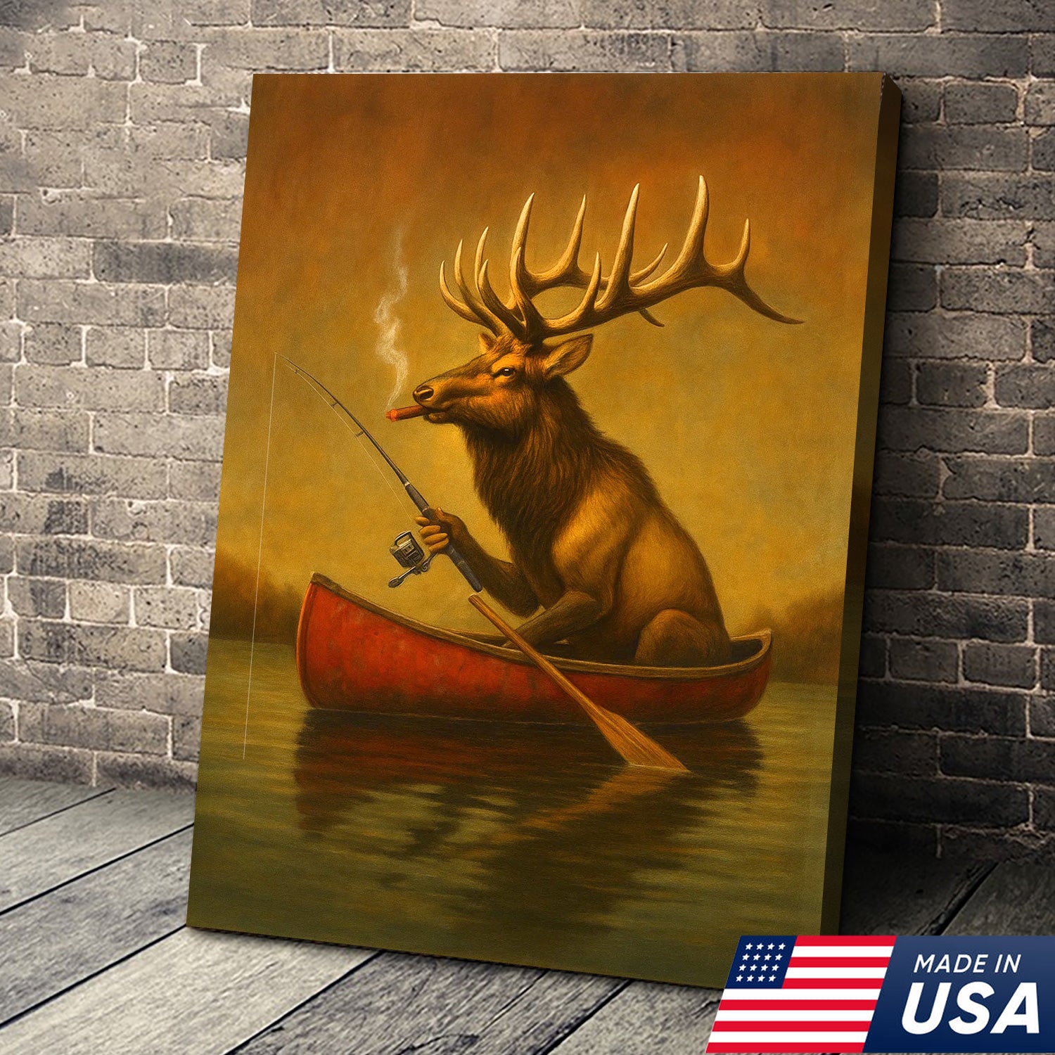 Funny Elk Fishing Canvas Wall Art – Rustic Cabin Decor for Hunters & Fishermen