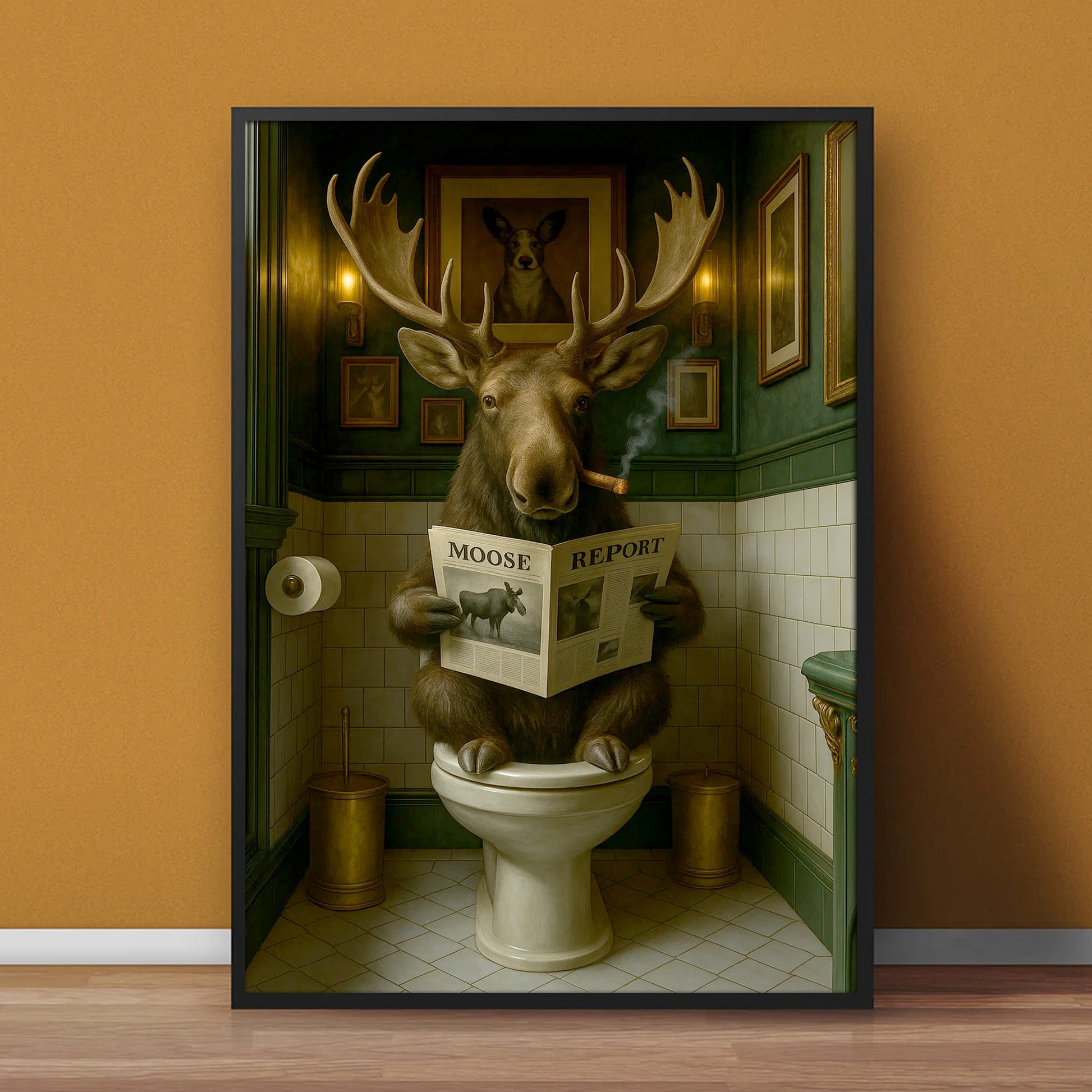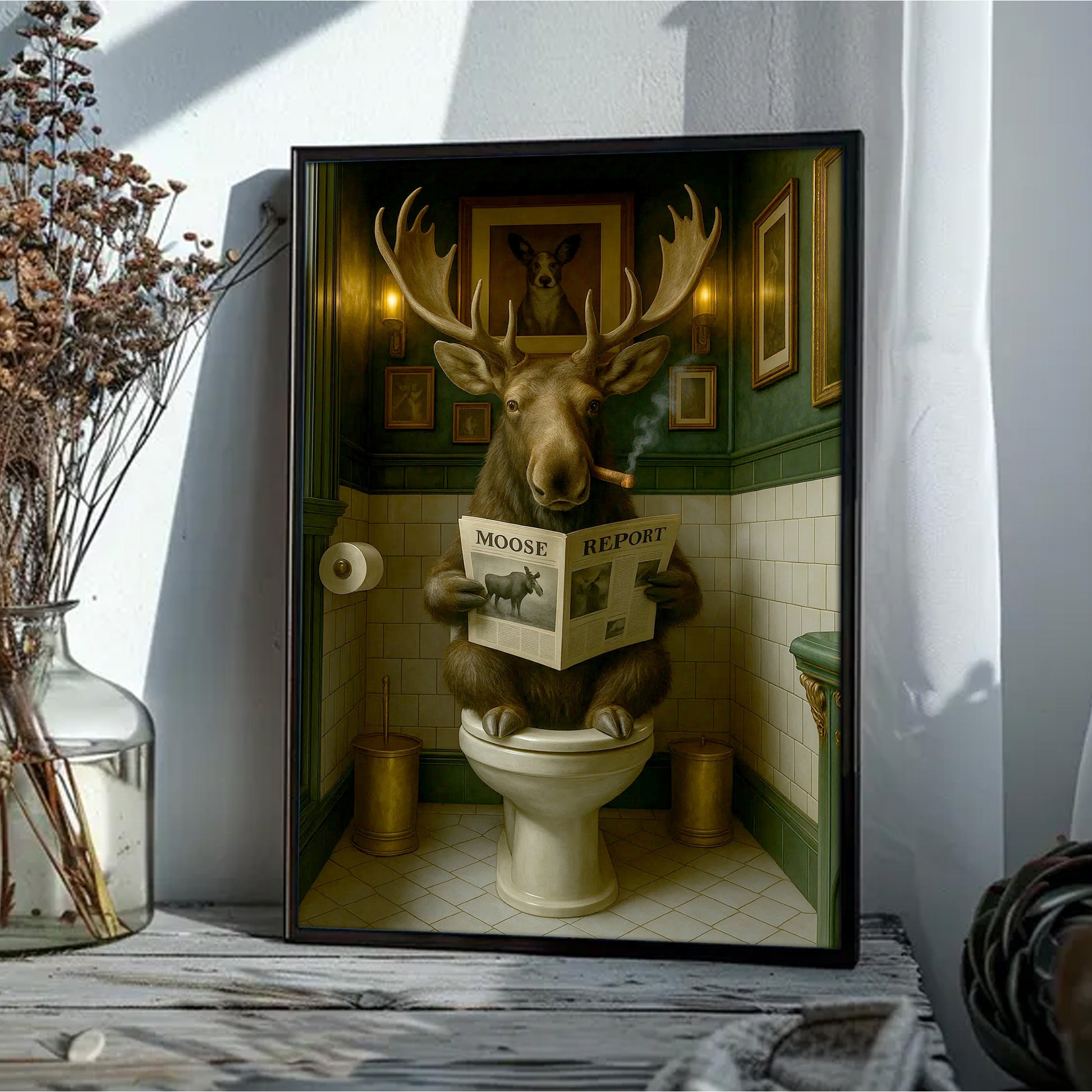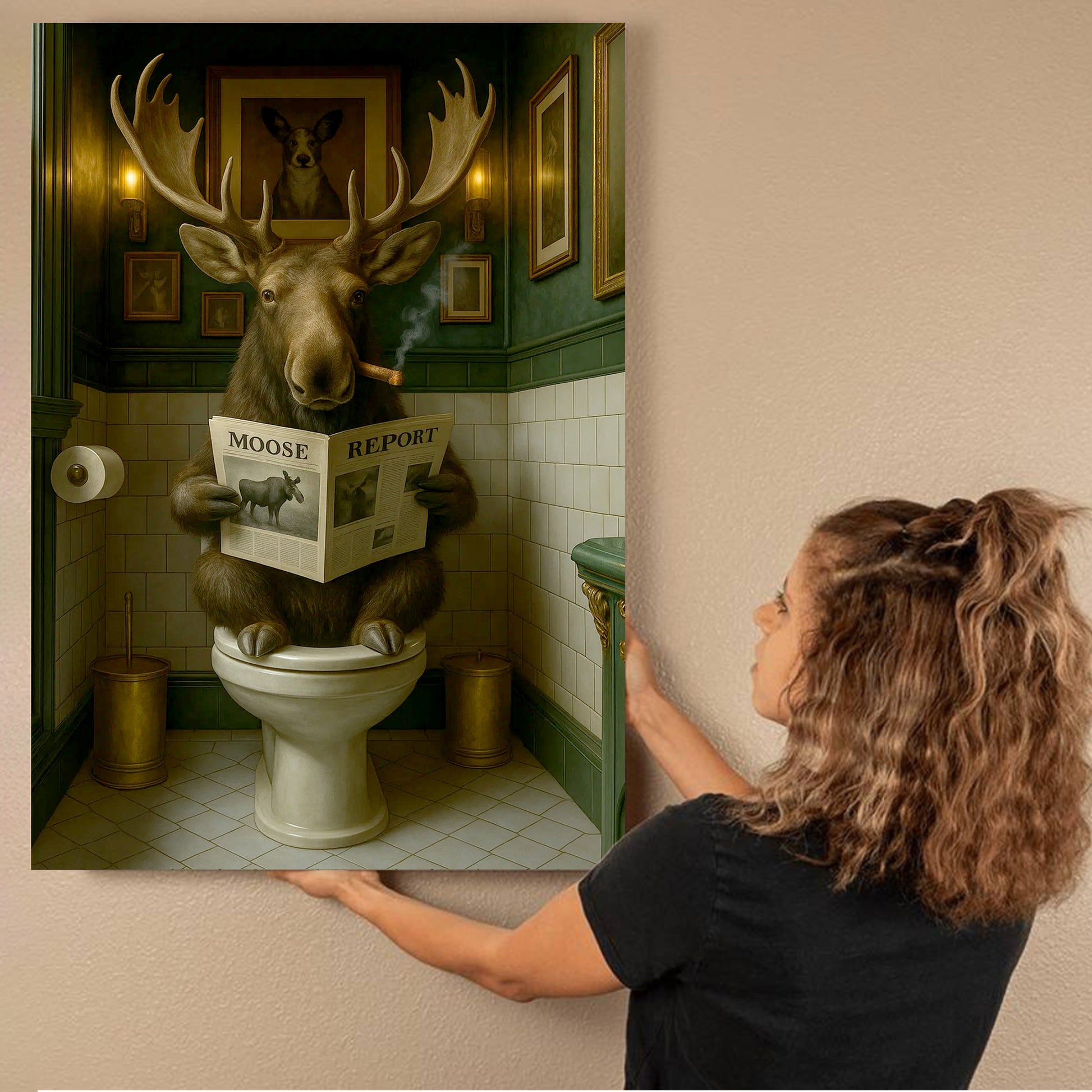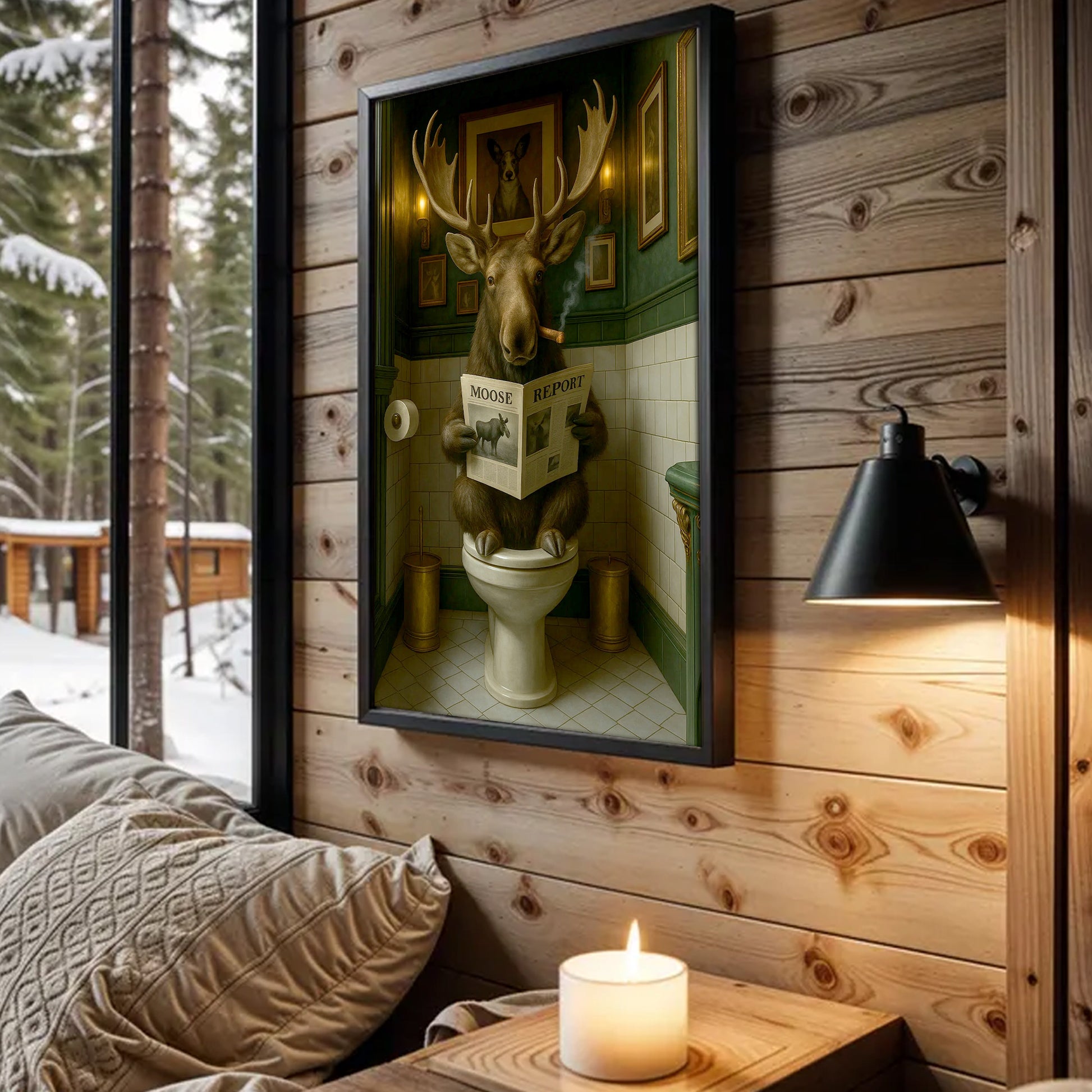 Funny Moose Bathroom Poster Canvas – Rustic Lodge Wall Art with Moose Reading ‘Moose Report’ - Gift for Hunters & Men