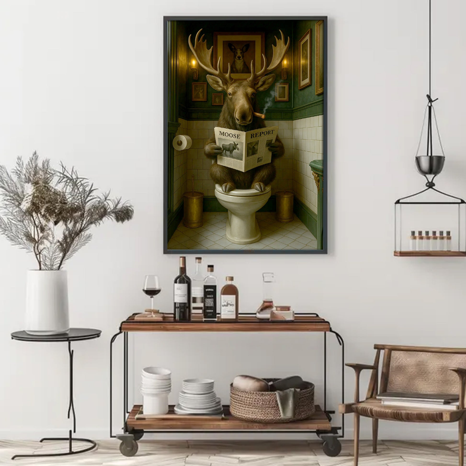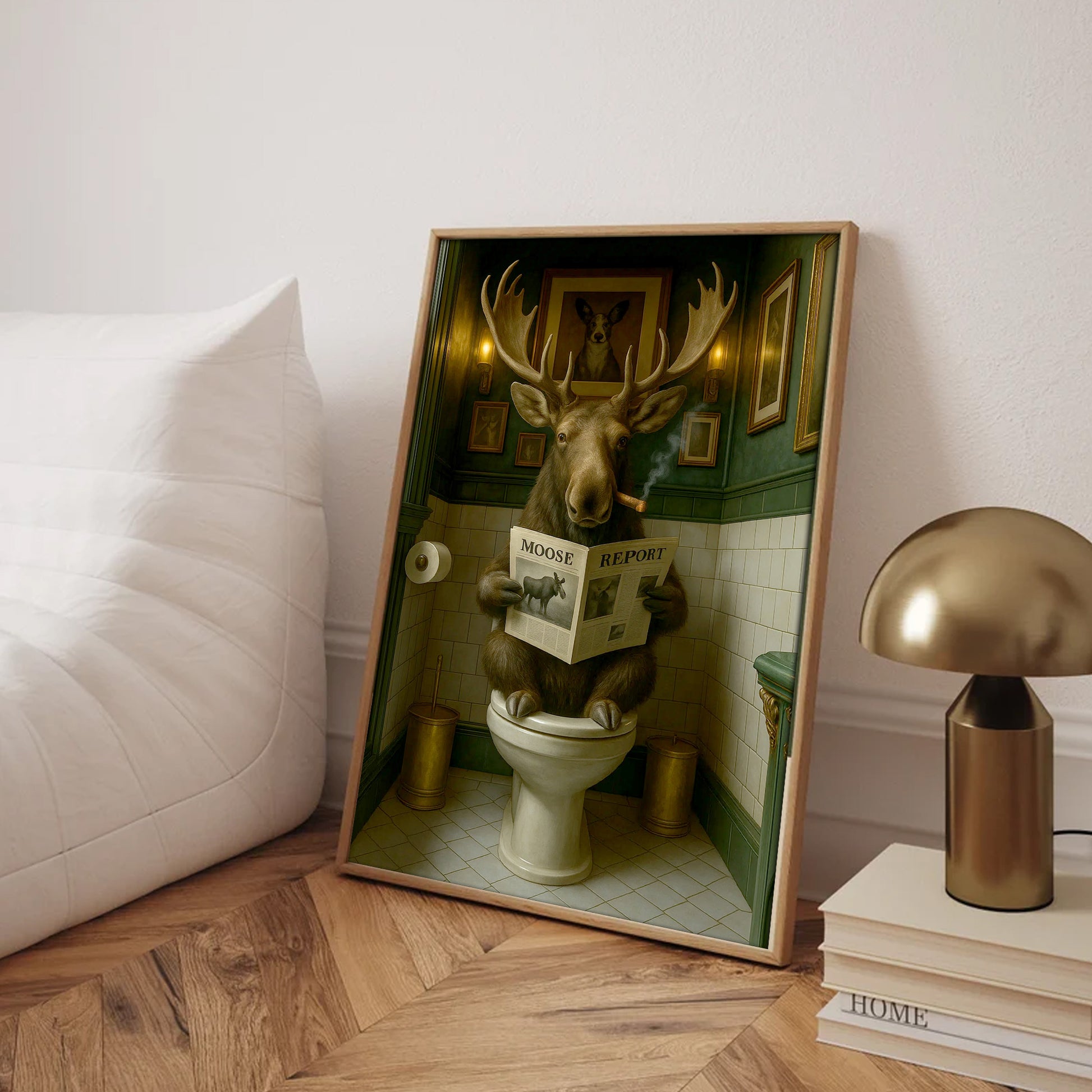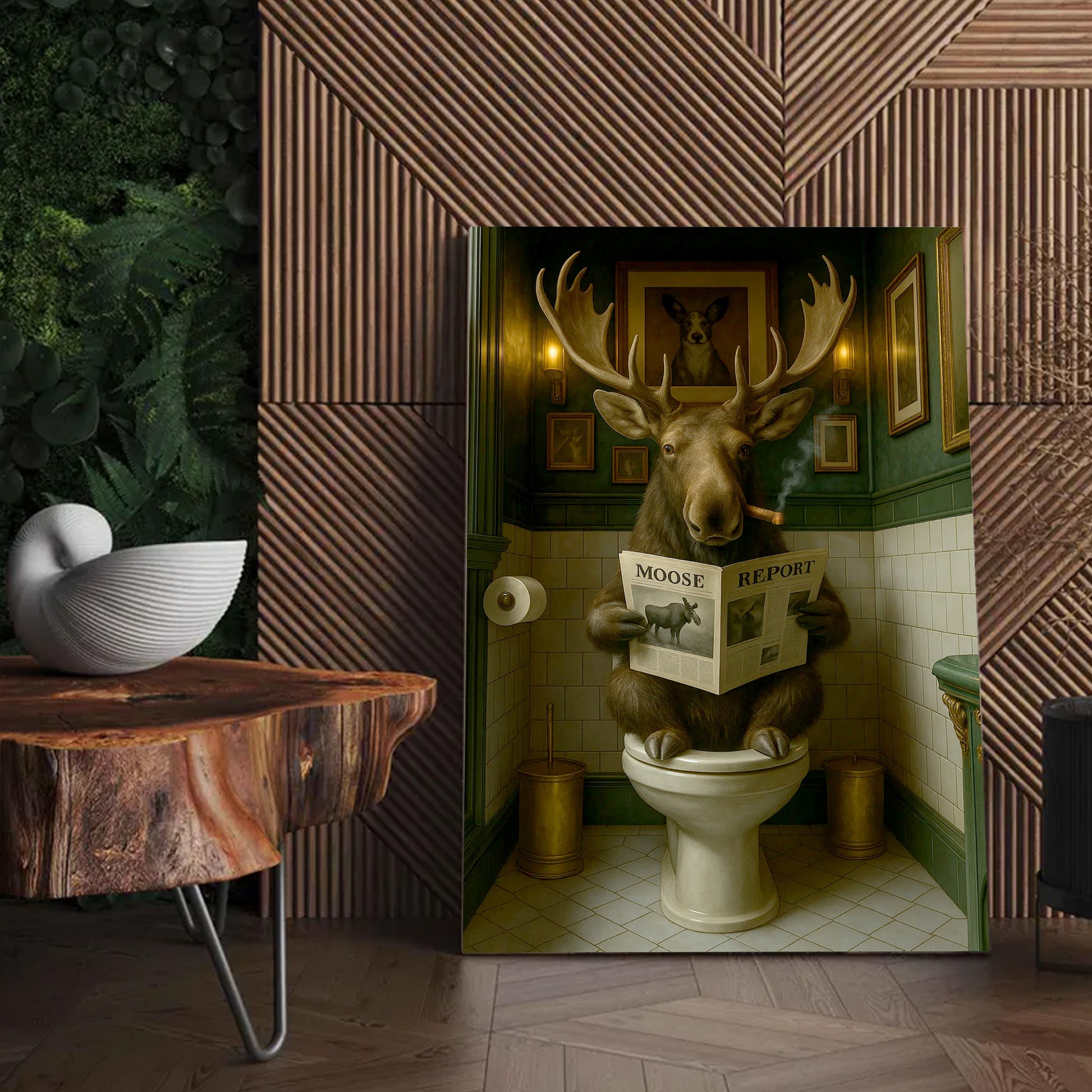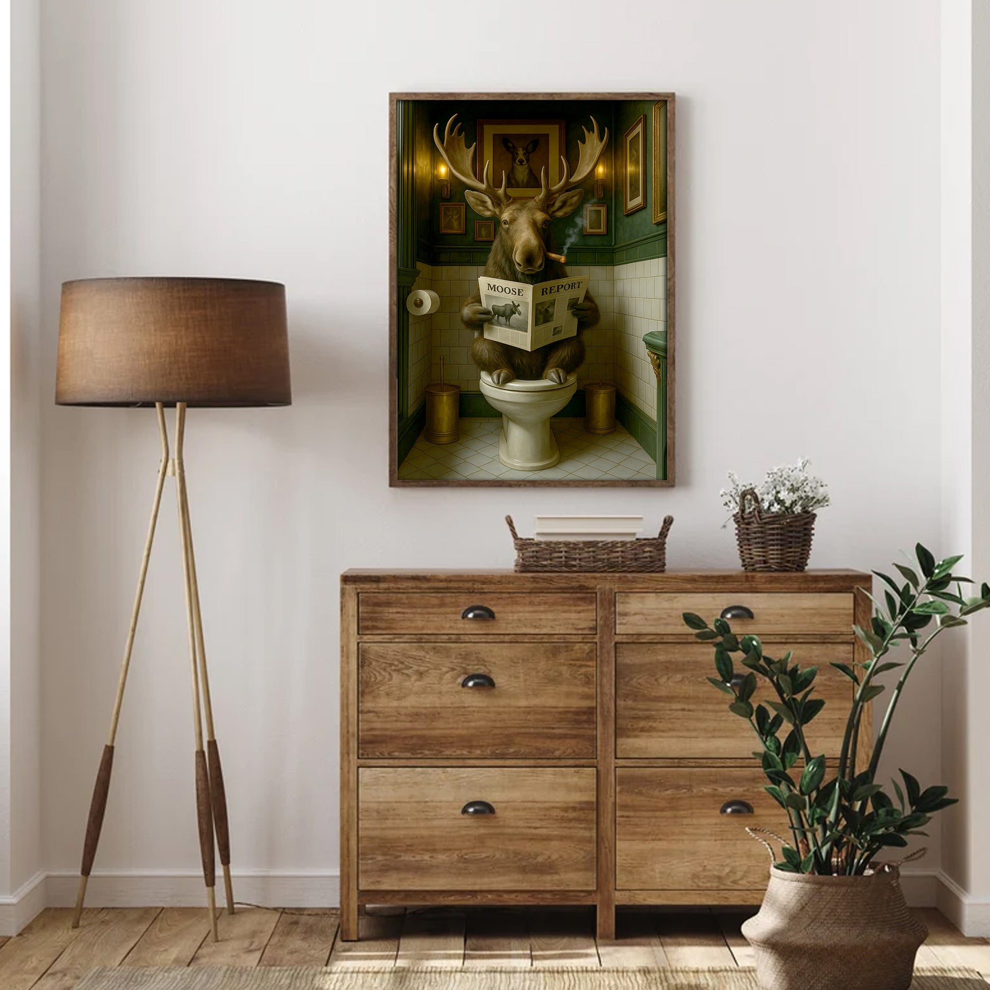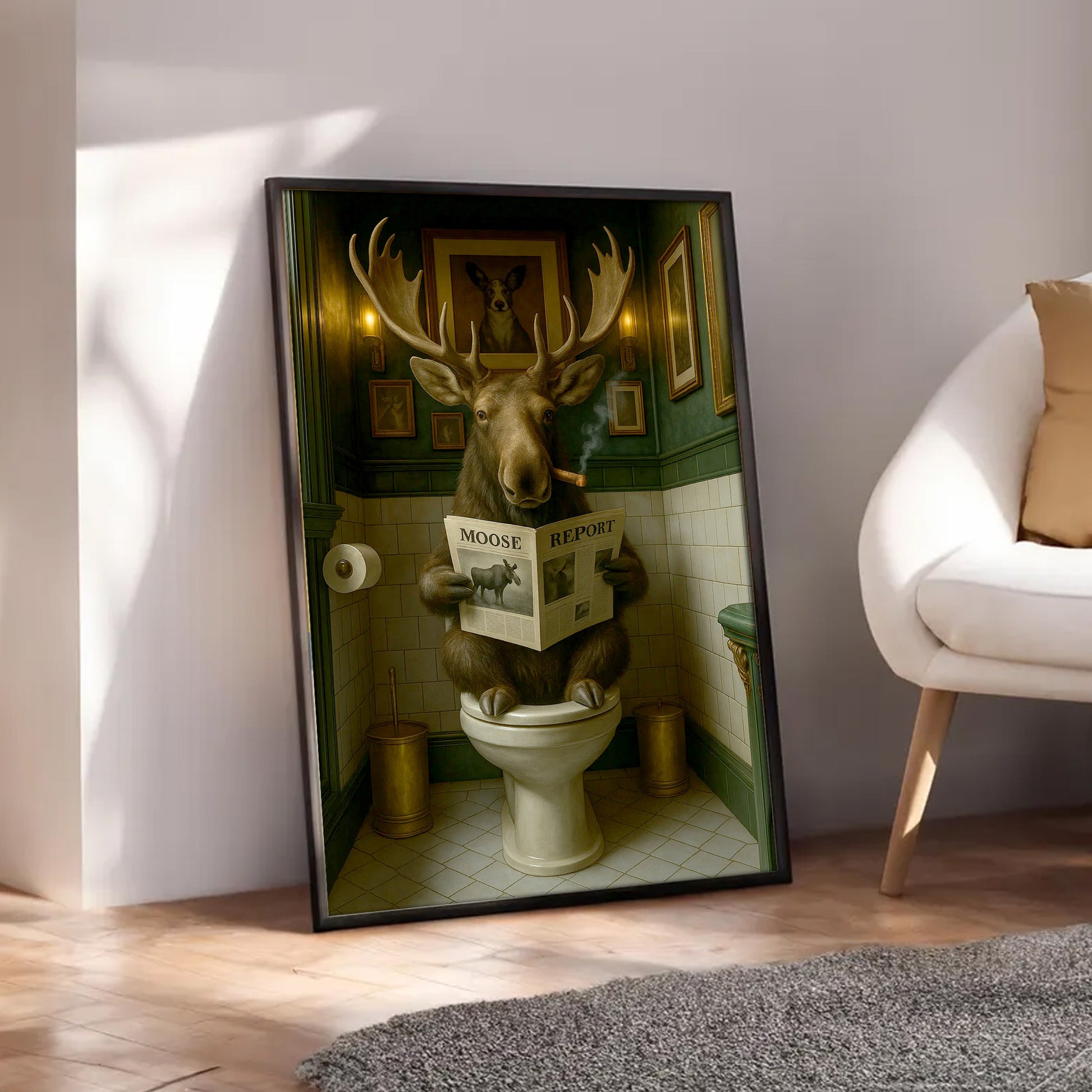 Funny Moose Bathroom Poster Canvas – Rustic Lodge Wall Art with Moose Reading ‘Moose Report’ - Gift for Hunters & Men