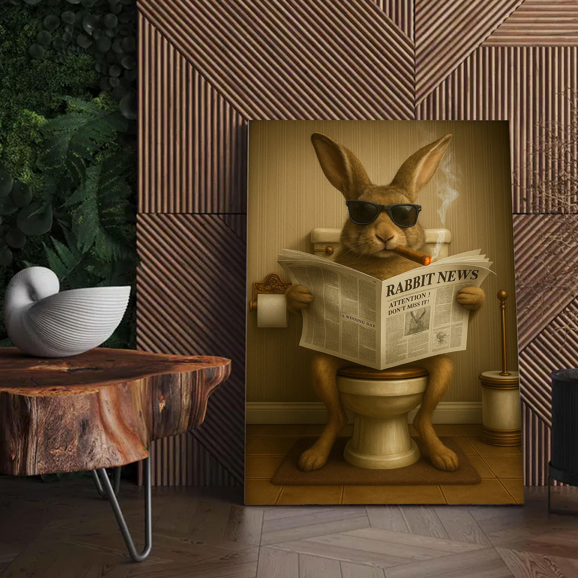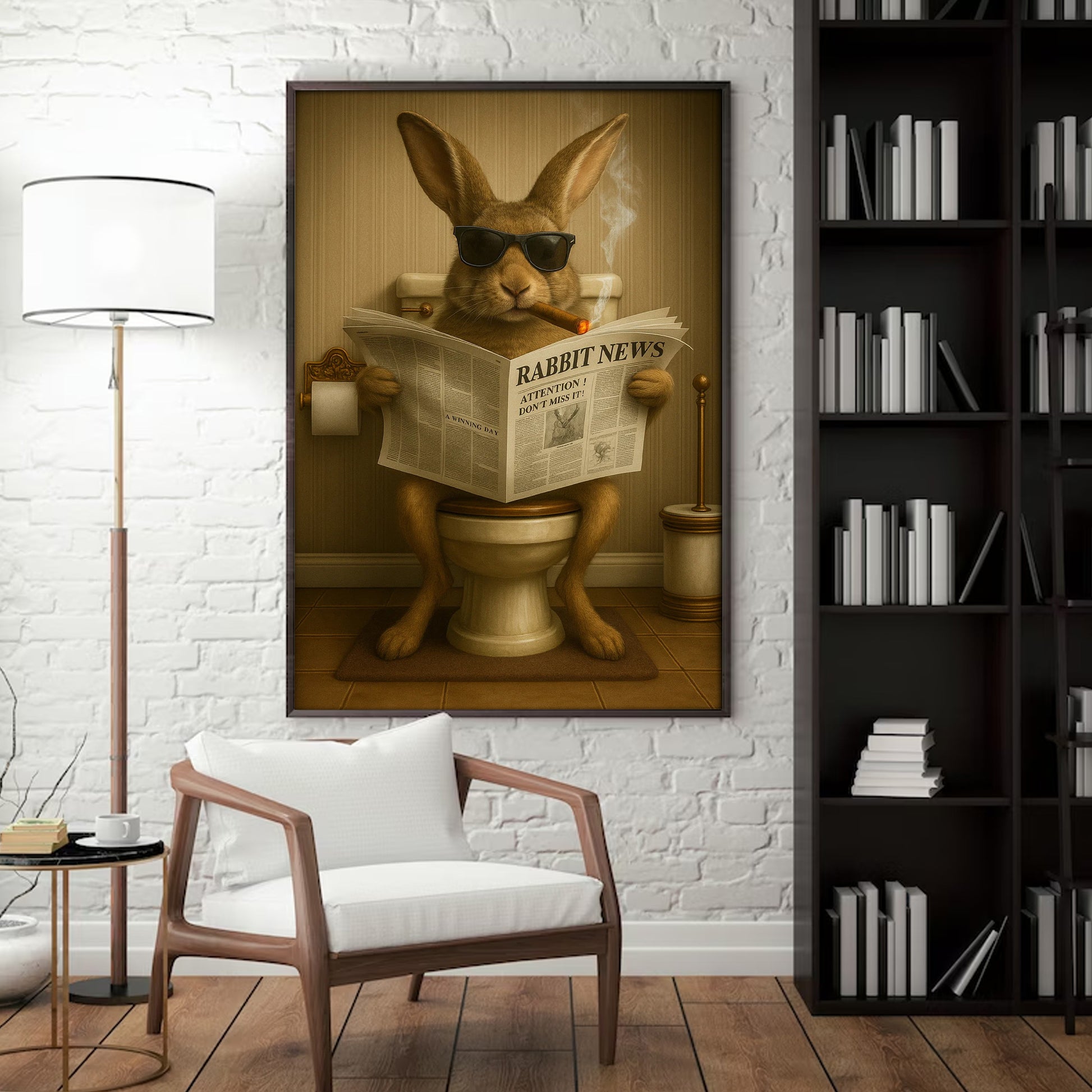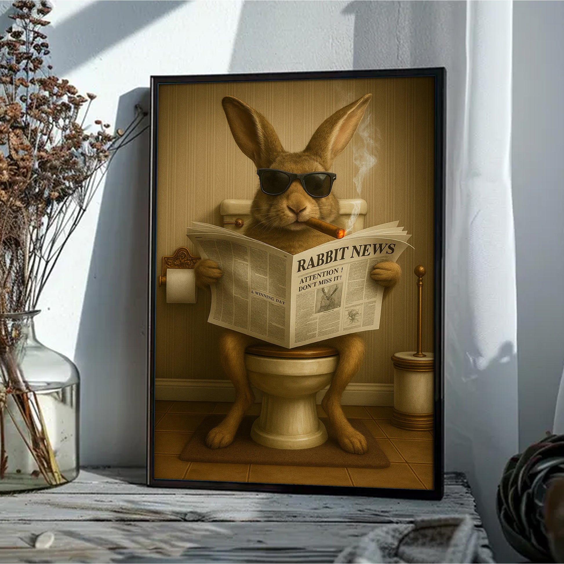 Funny Rabbit Reading News Bathroom Wall Art – Rustic Decor for Men, Hunting Cabin Poster, Hilarious Gift for Dad