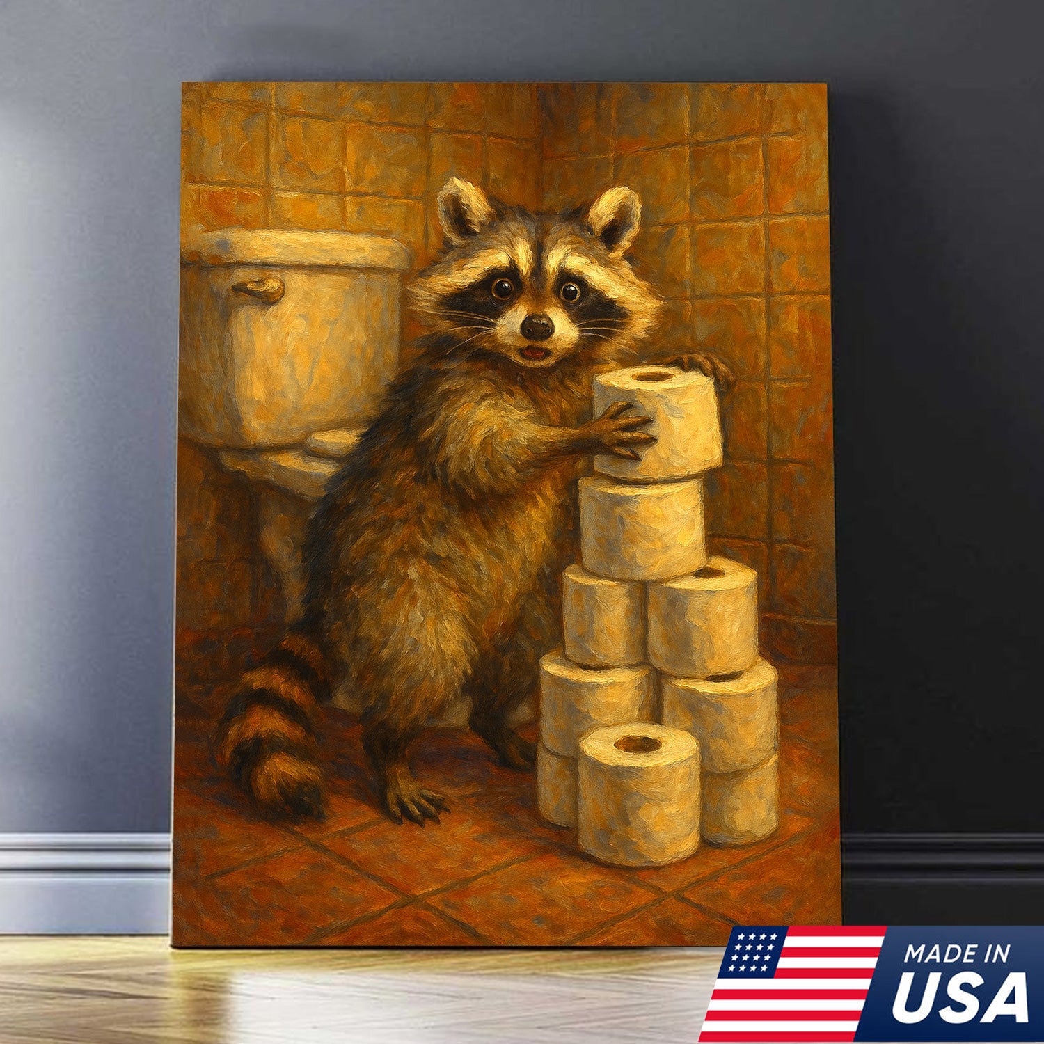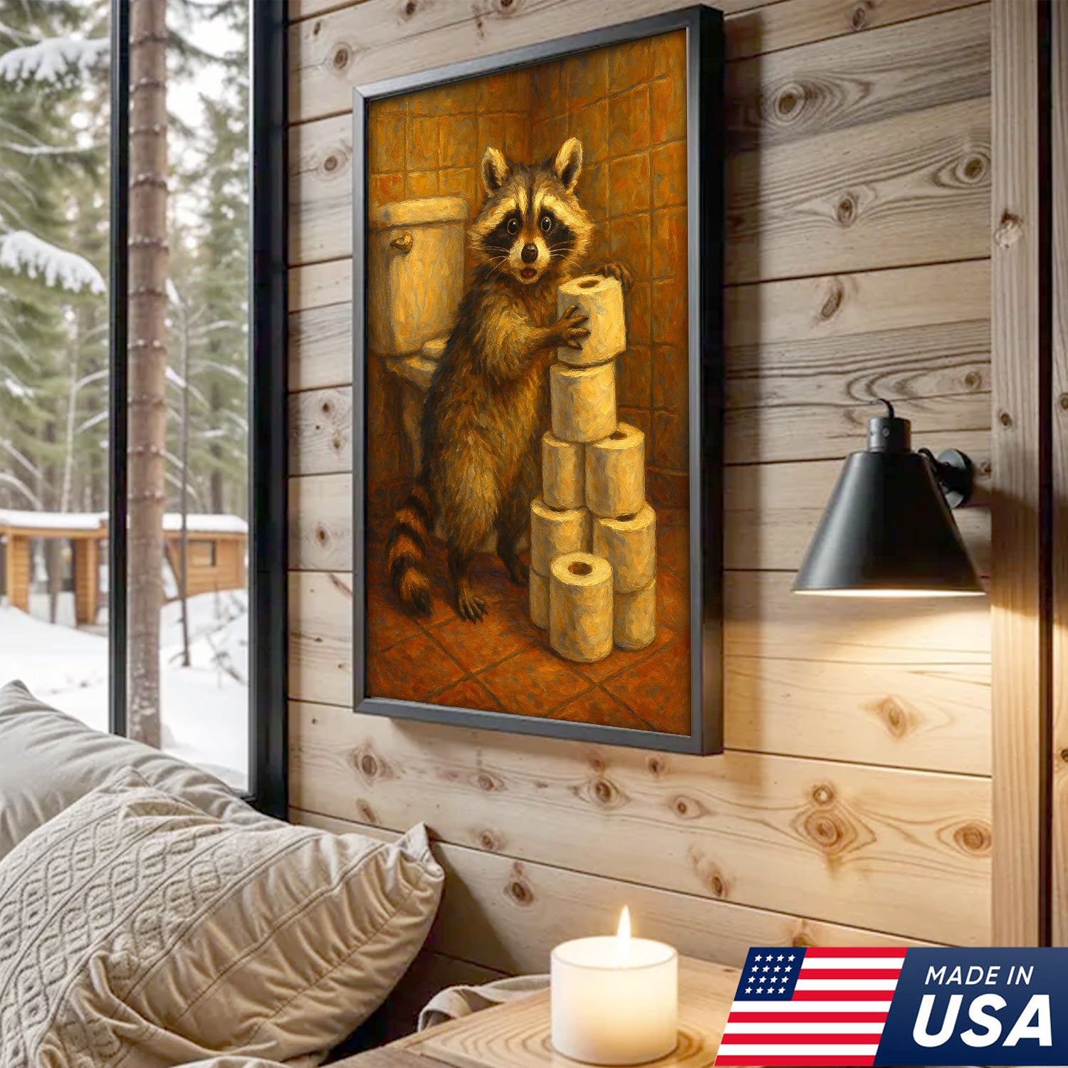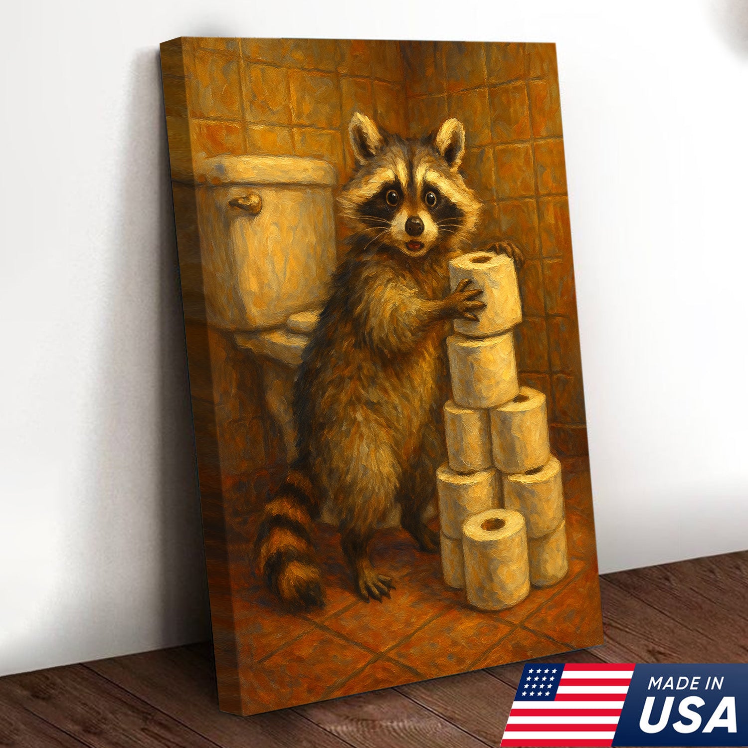 Funny Raccoon Canvas Wall Art – Cute Animal Bathroom Decor with Toilet Paper for Rustic Cabin & Home
