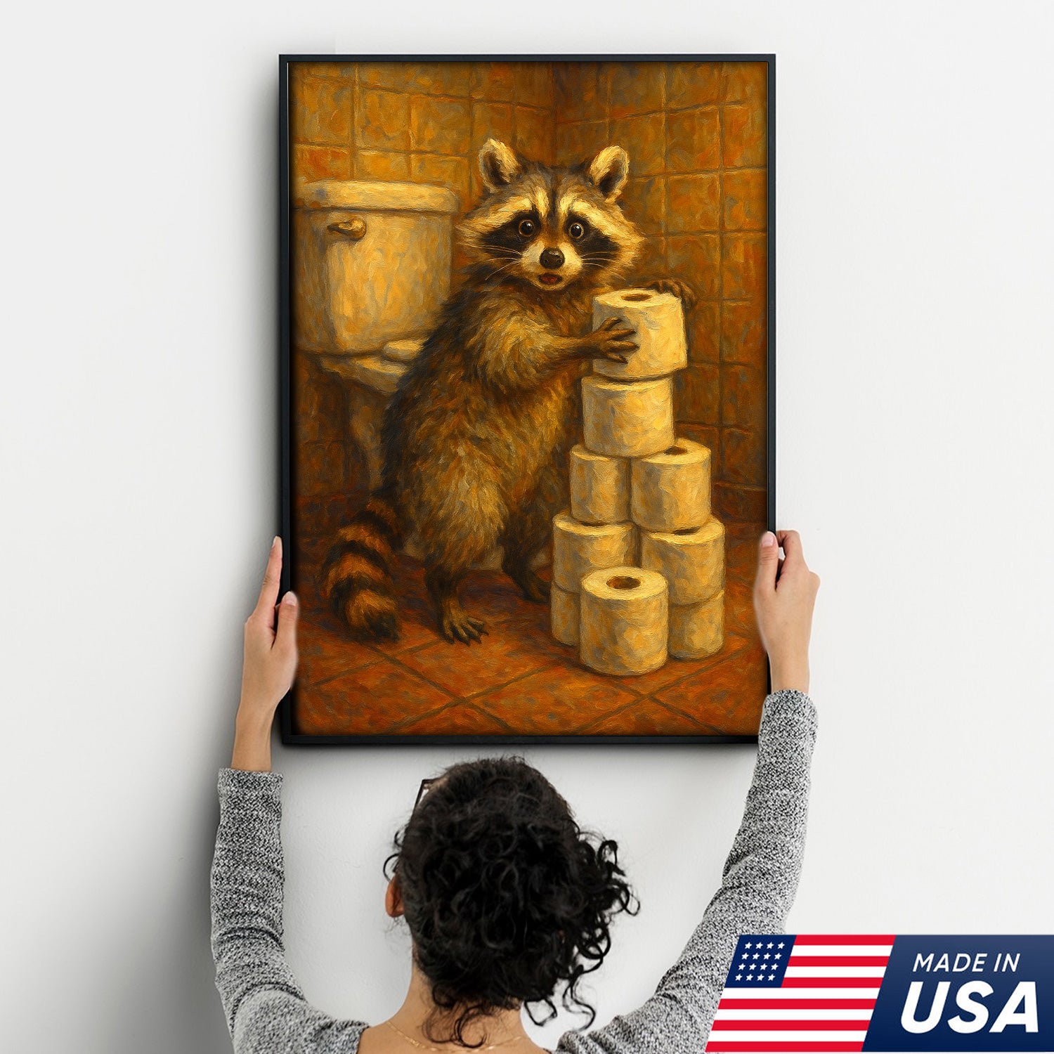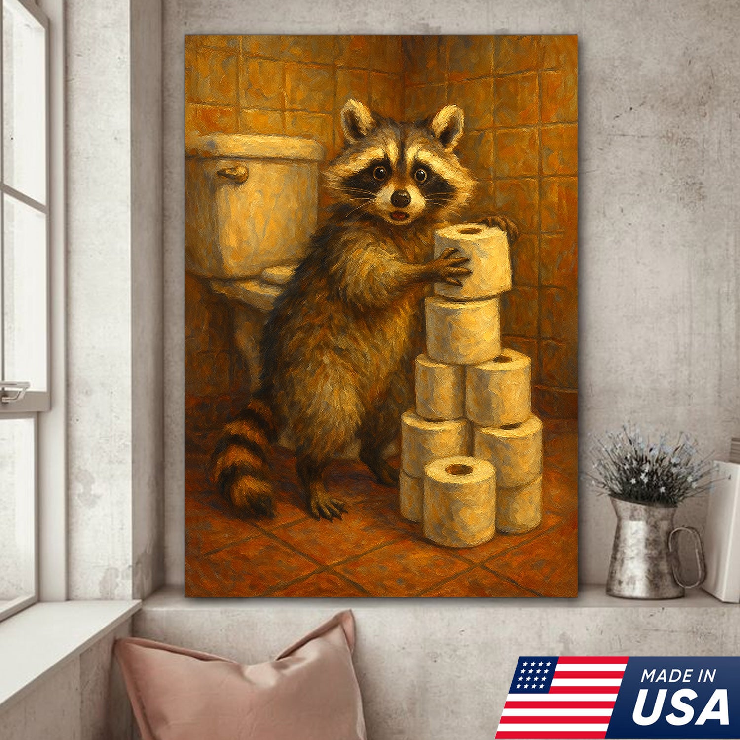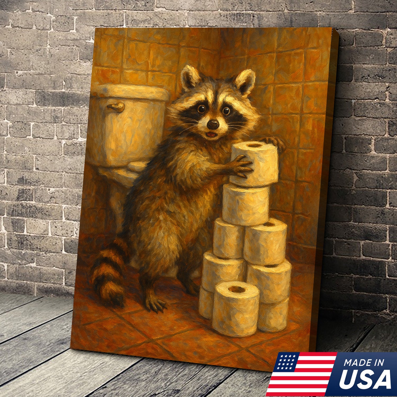 Funny Raccoon Canvas Wall Art – Cute Animal Bathroom Decor with Toilet Paper for Rustic Cabin & Home