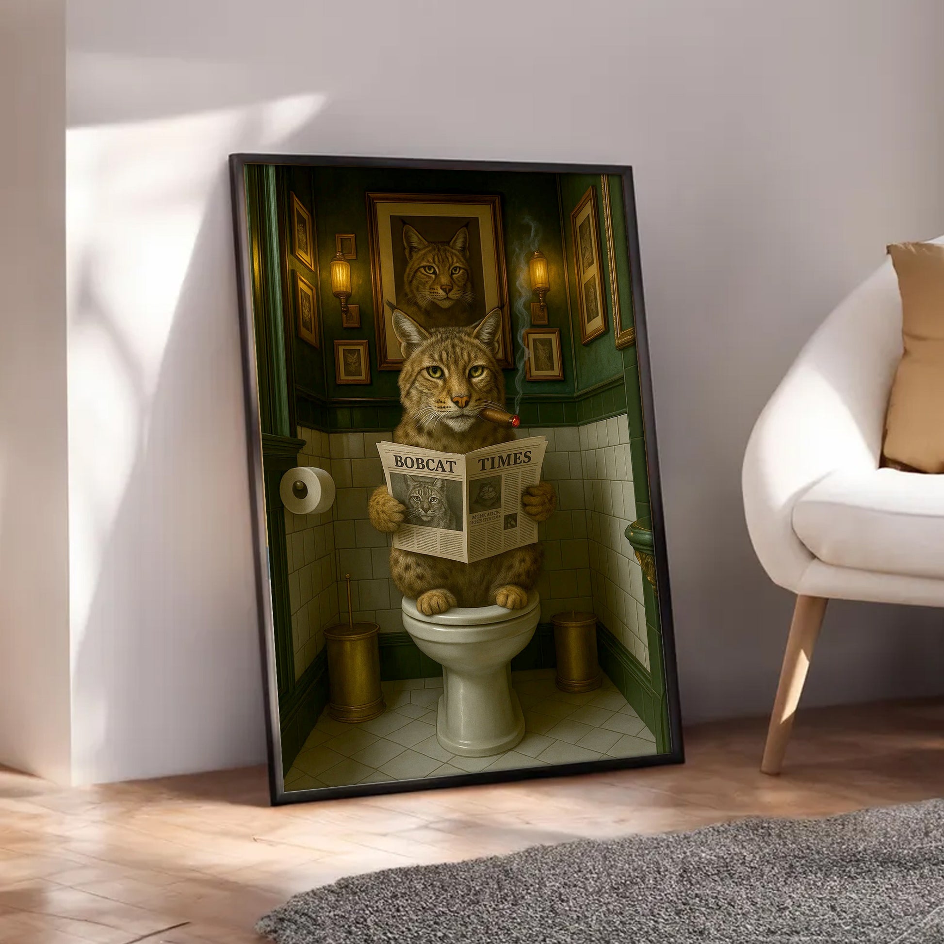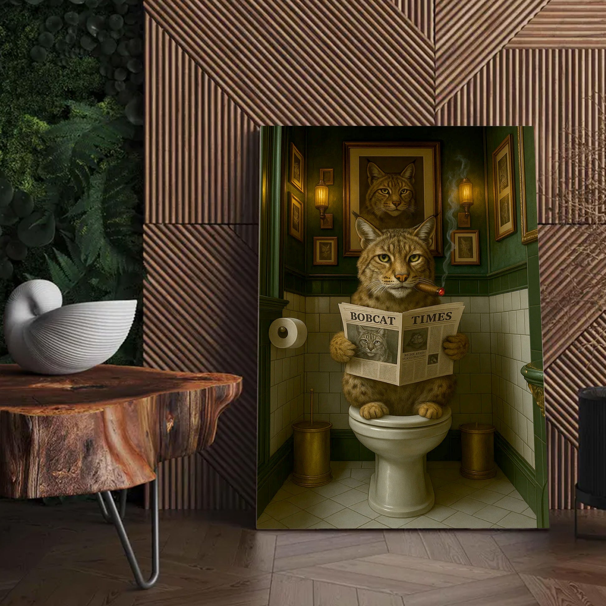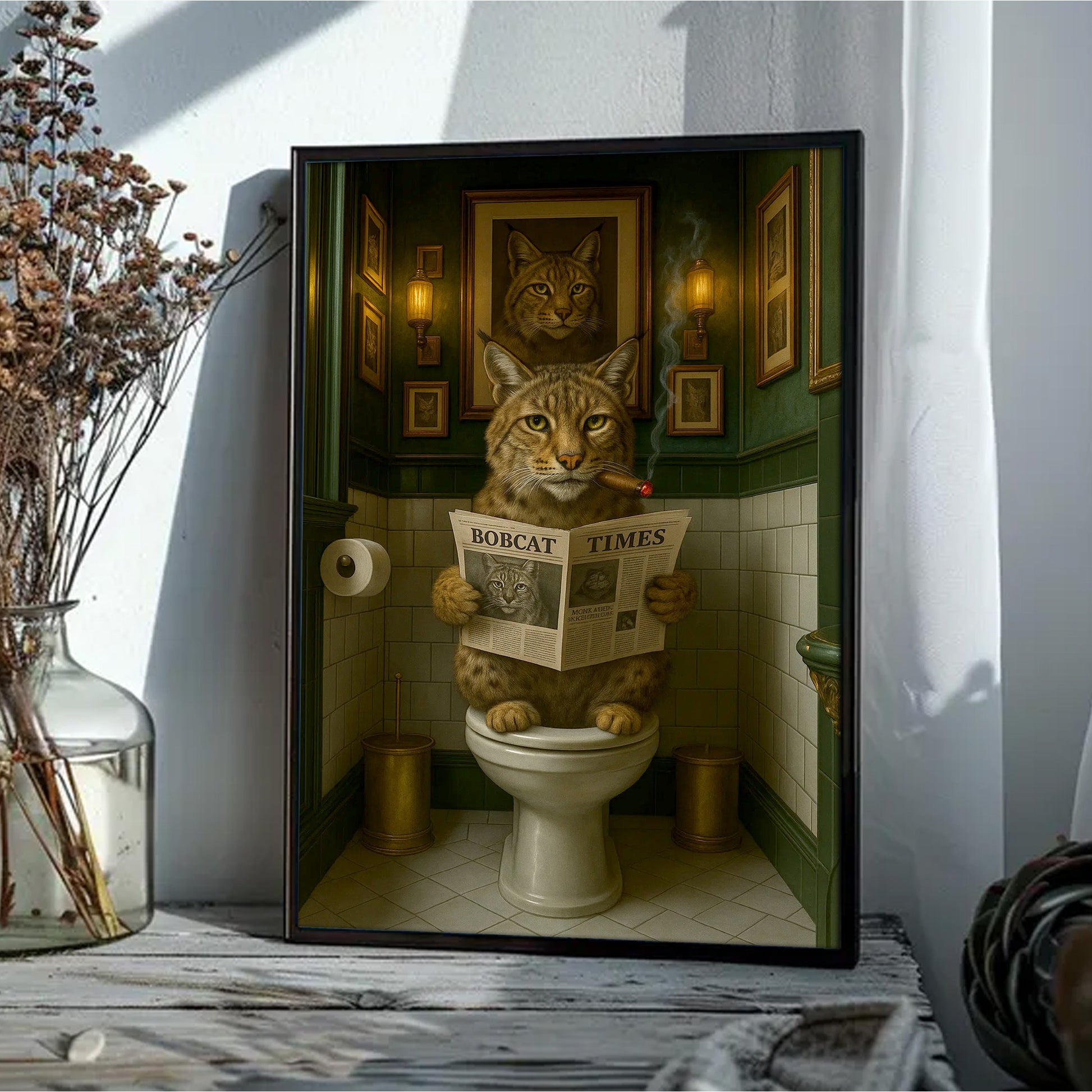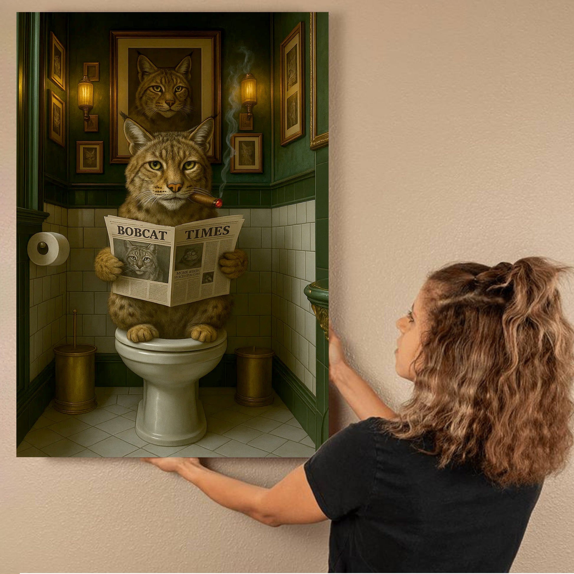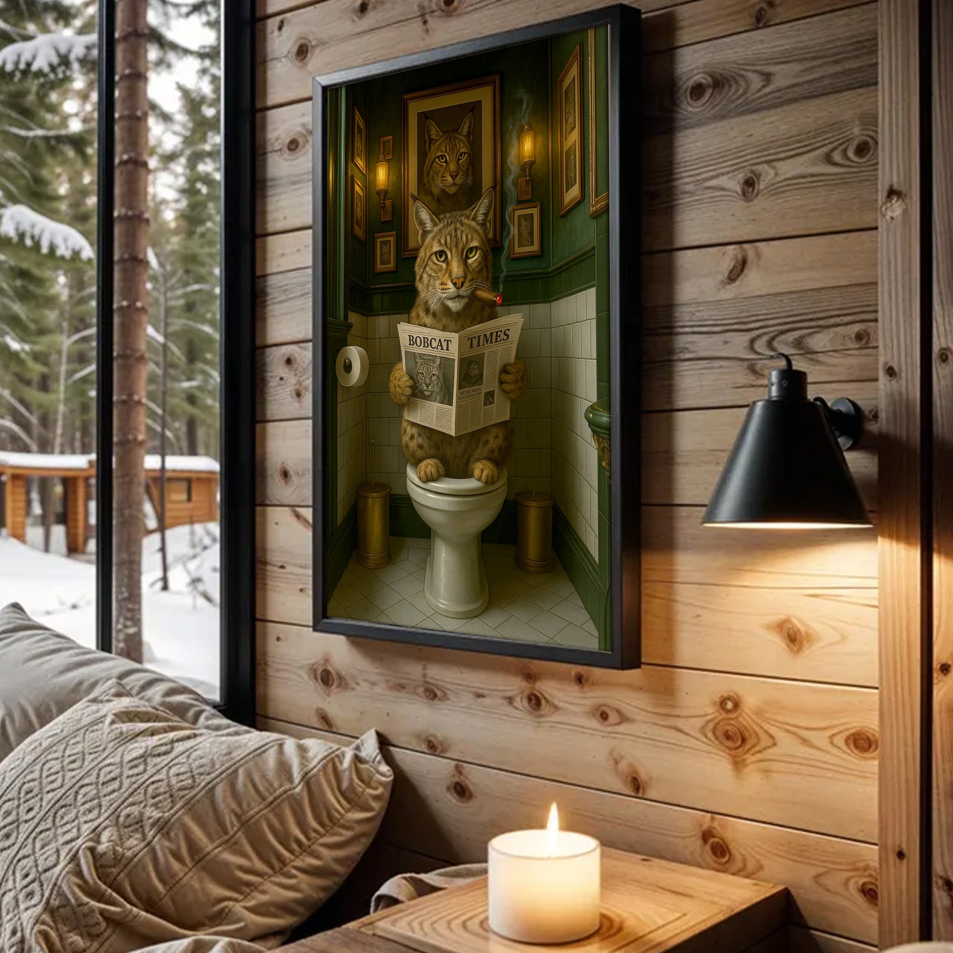 Funny Rustic Bobcat Wall Art Canvas – Smoking-Smoking Wild Cat Reading Newspaper - Rustic Lodge Wall Art, Gift for Hunters
