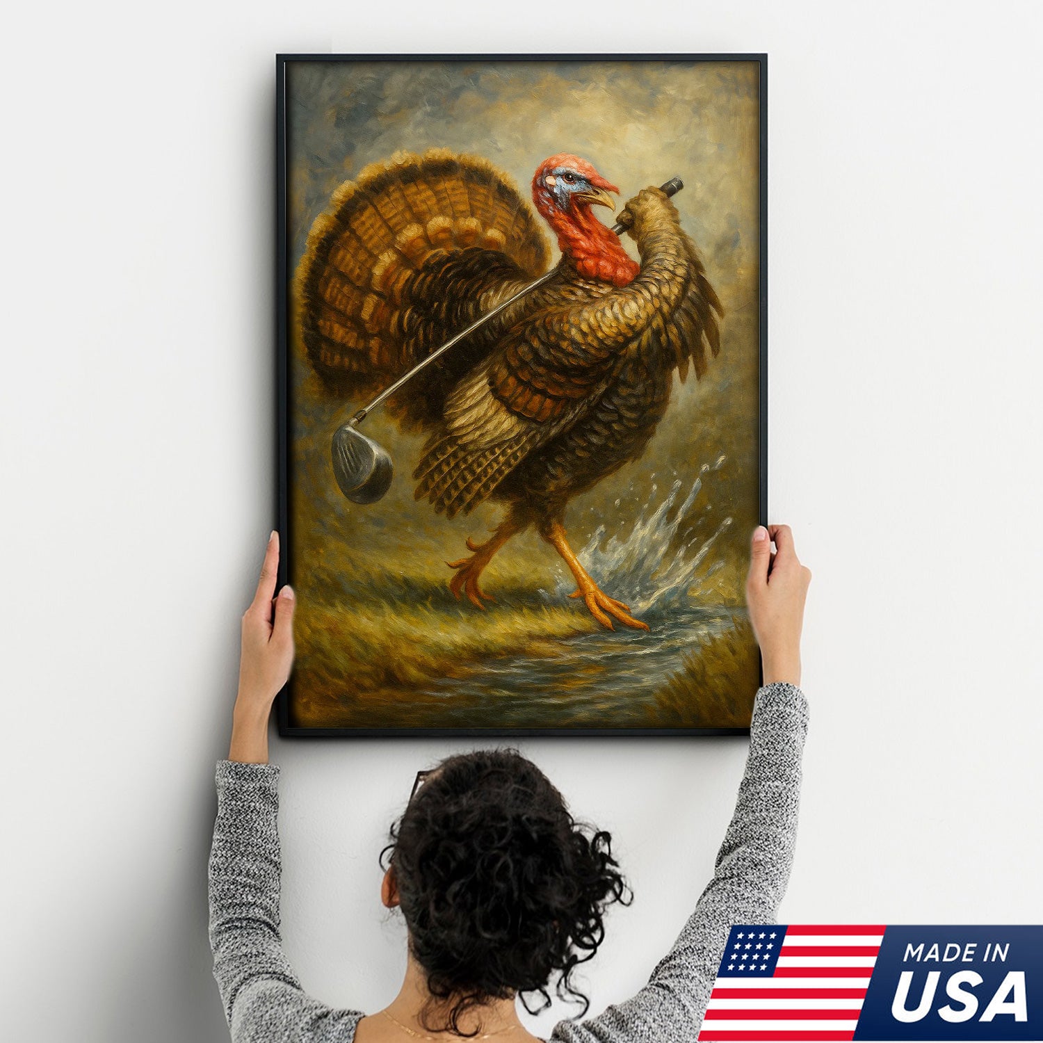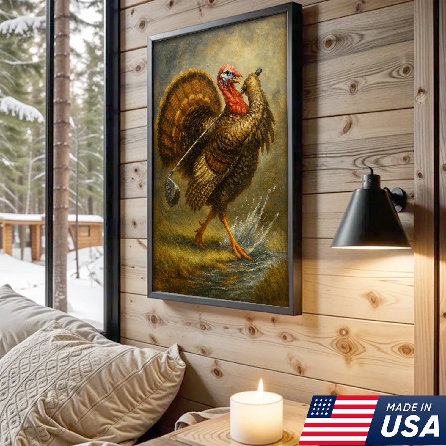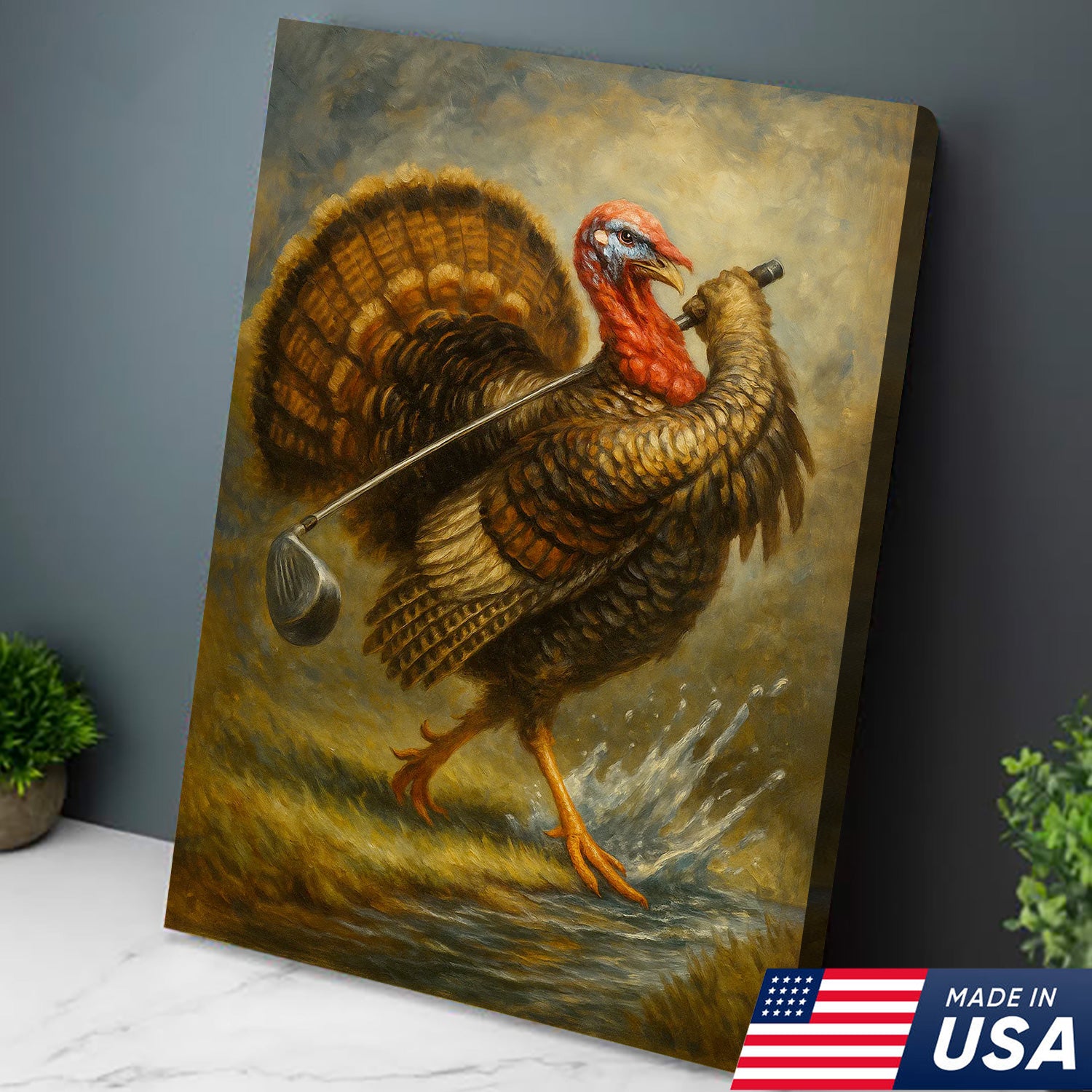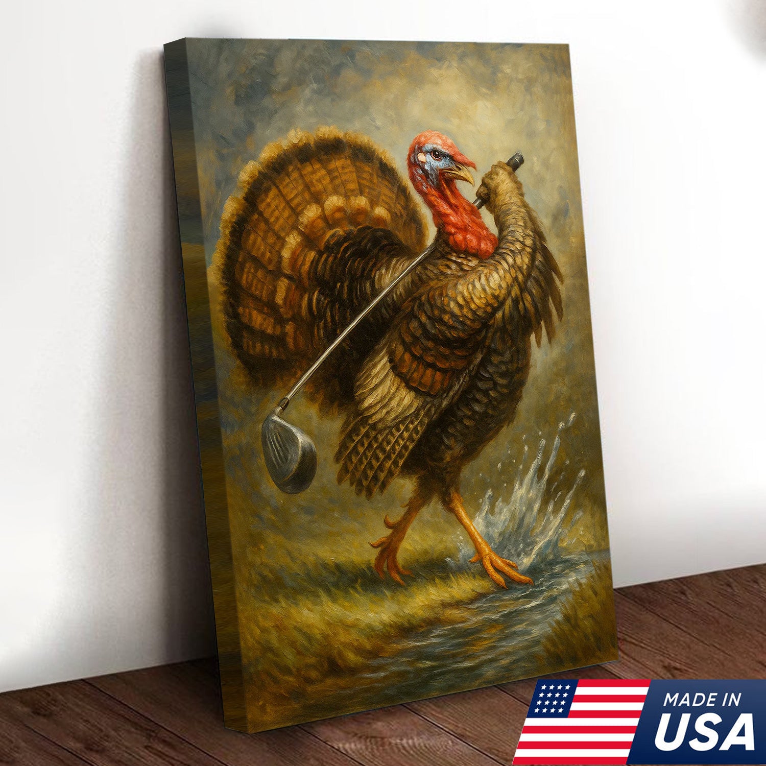 Funny Turkey Playing Golf Canvas Wall Art – Rustic Cabin Lodge Decor, Man Cave & Golfer Gift