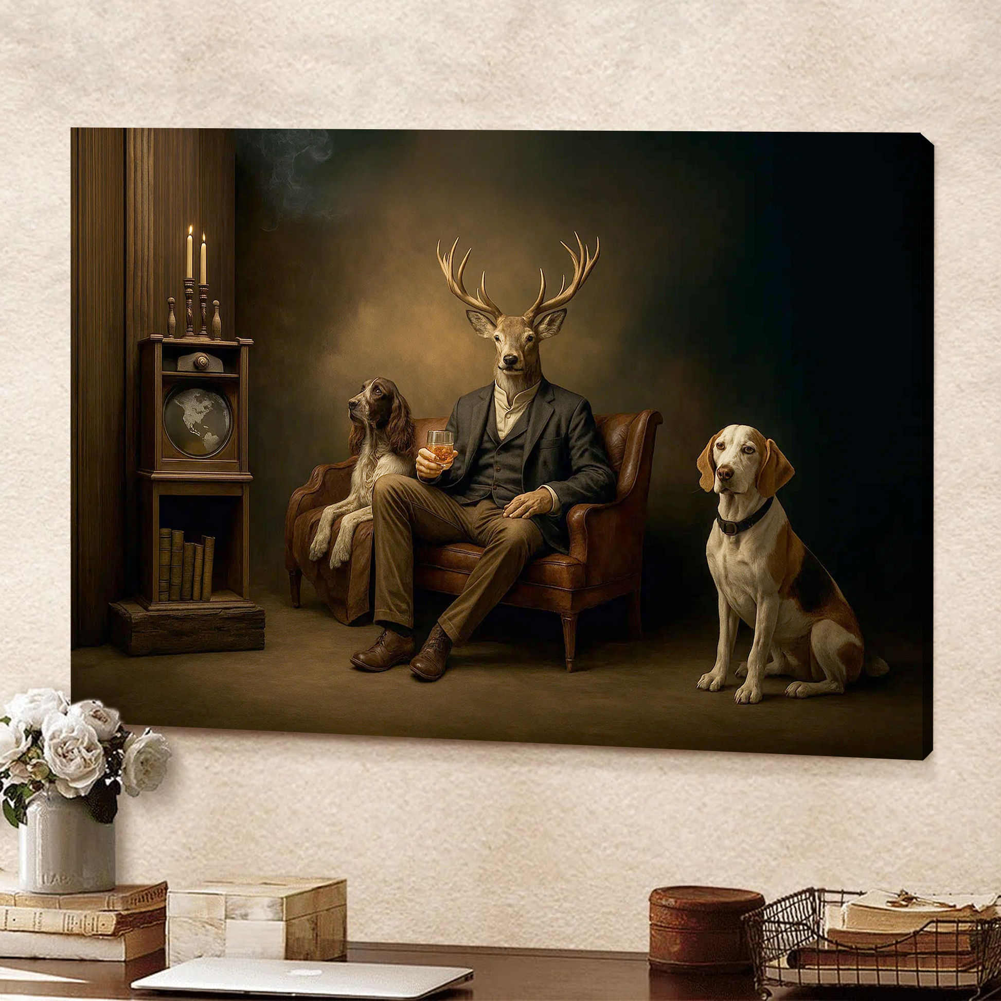 Gentleman Deer Canvas Wall Art – Rustic Whiskey & Hunting Lodge Decor, Man Cave Dog Lover Gift