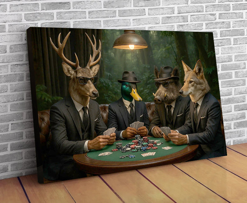 Hunter Animals Playing Poker Canvas - Deer, Duck, Boar & Coyote Poker Print – Man Cave Wall Decor