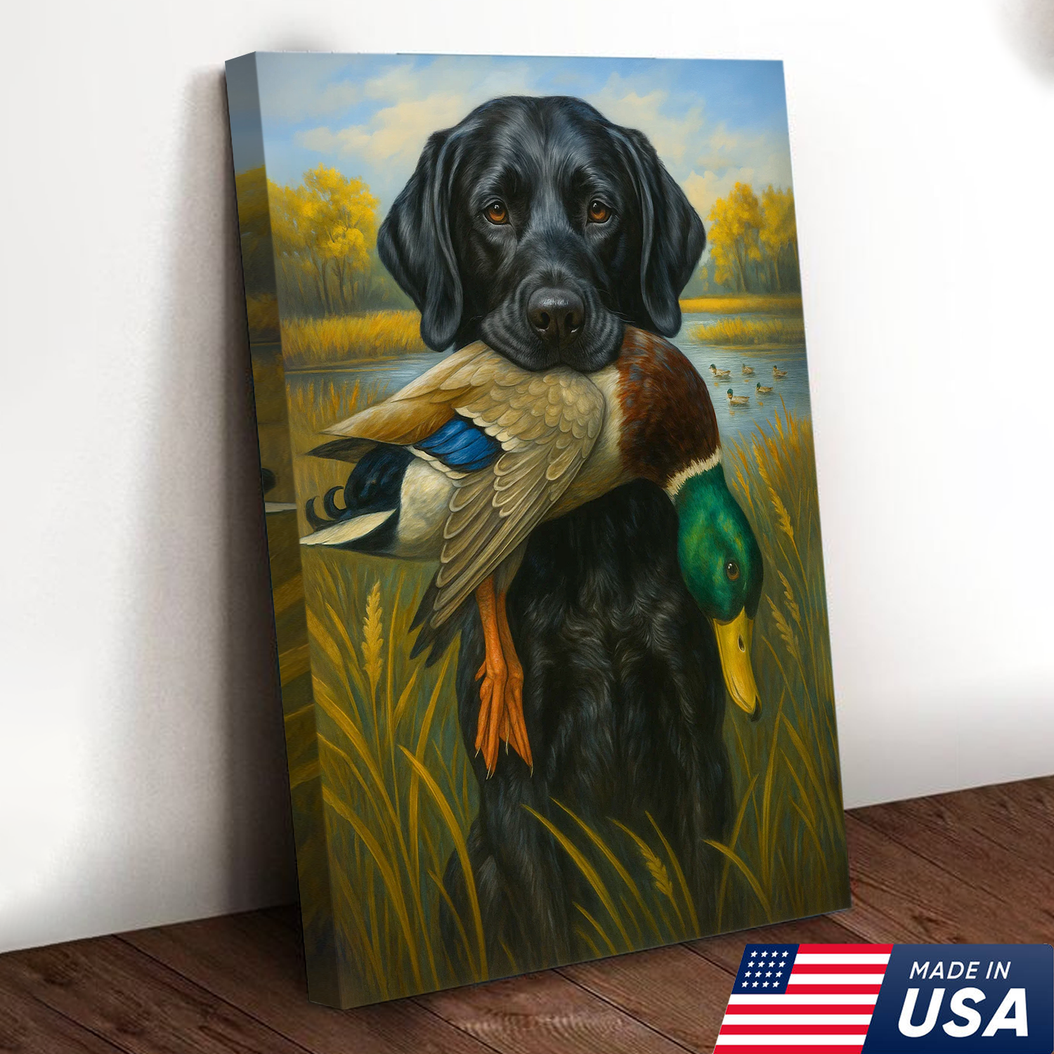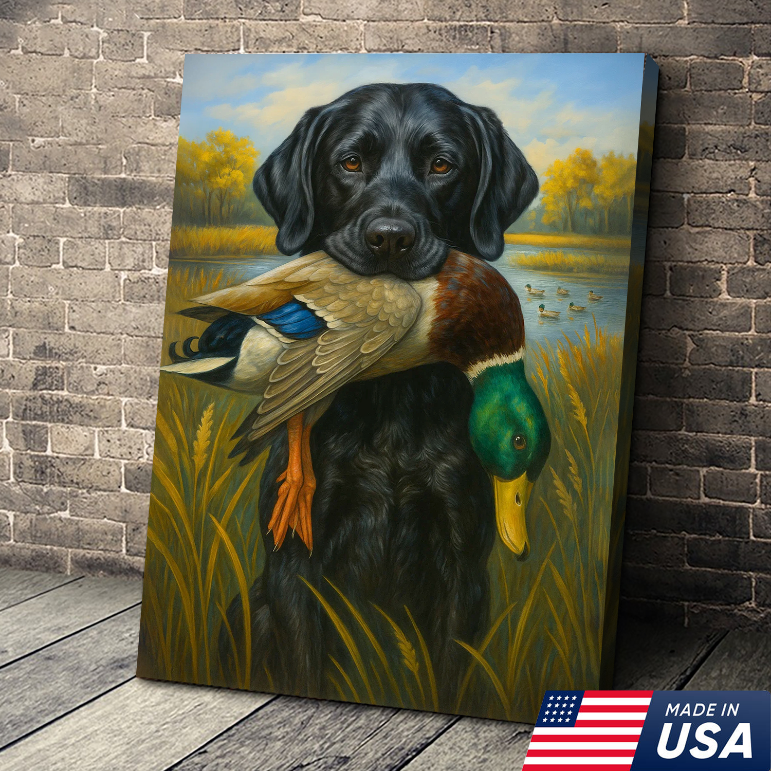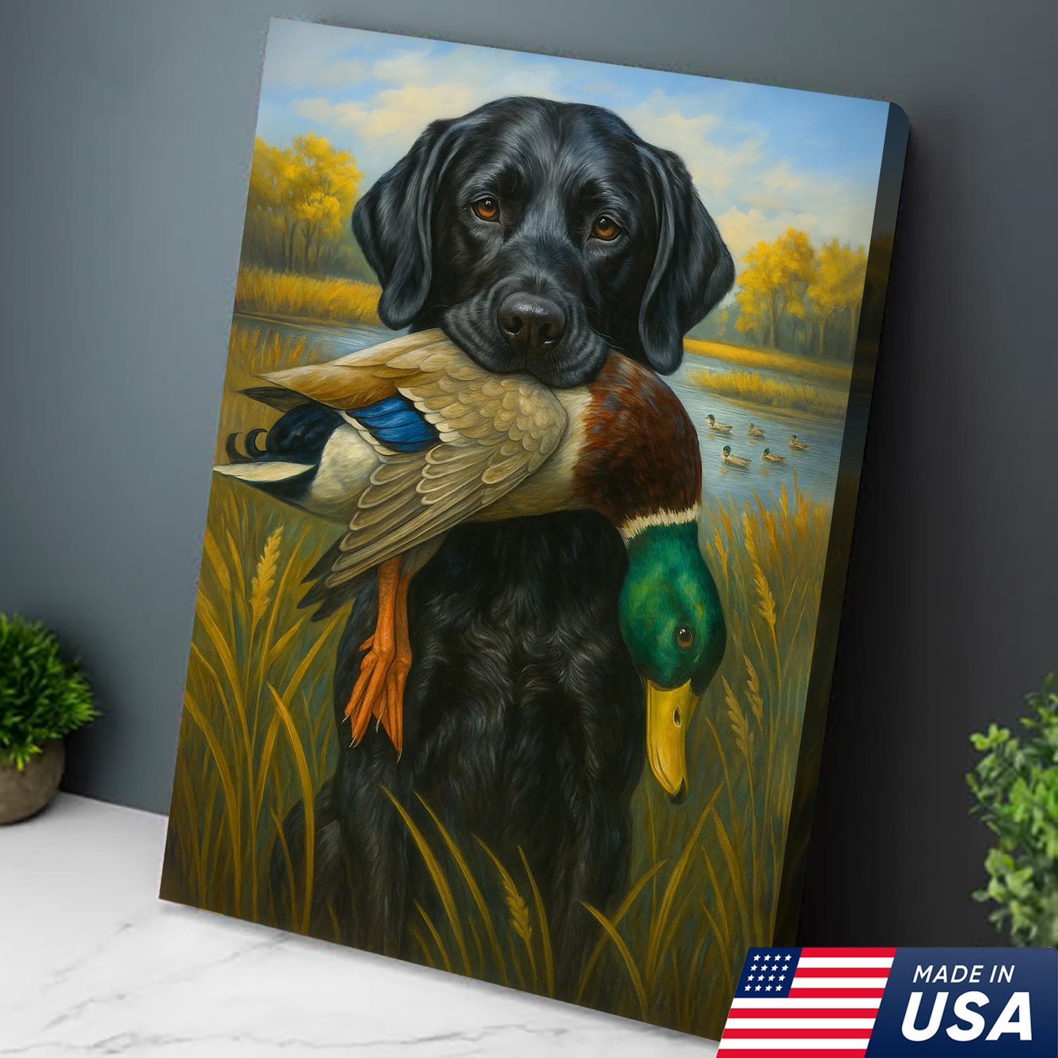 Hunting Dog Canvas Wall Art – Black Labrador Retriever with Duck, Rustic Cabin & Man Cave Decor, Made in USA
