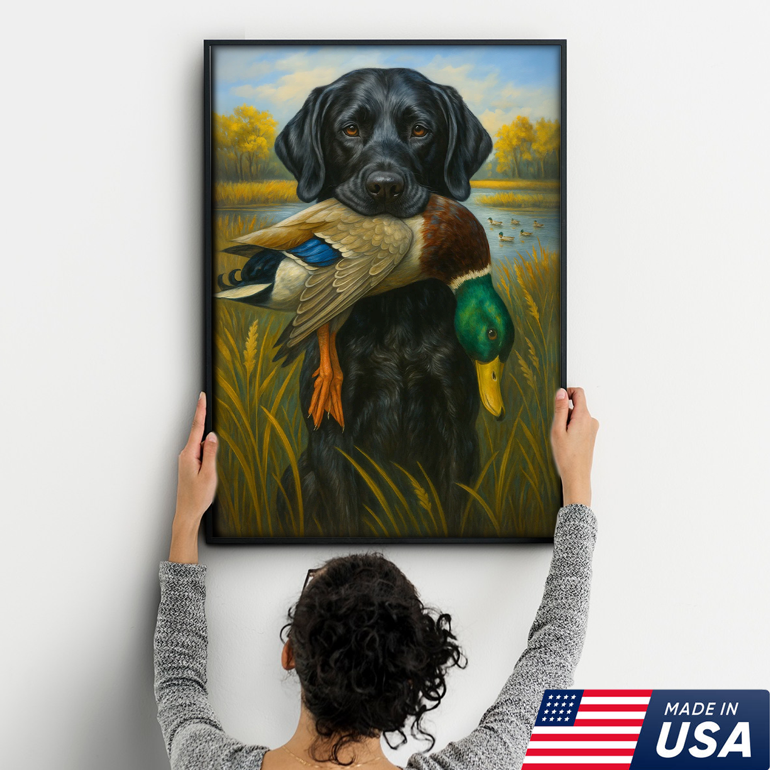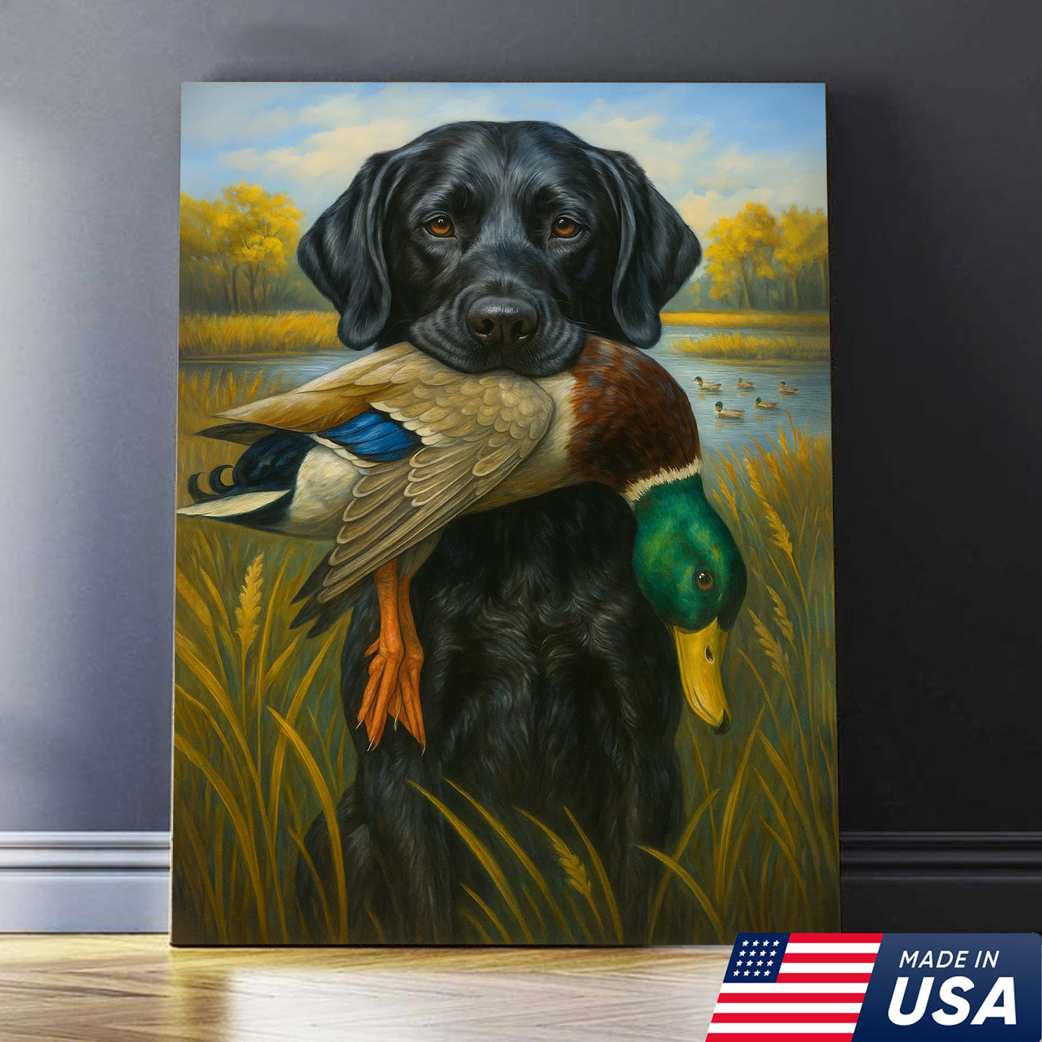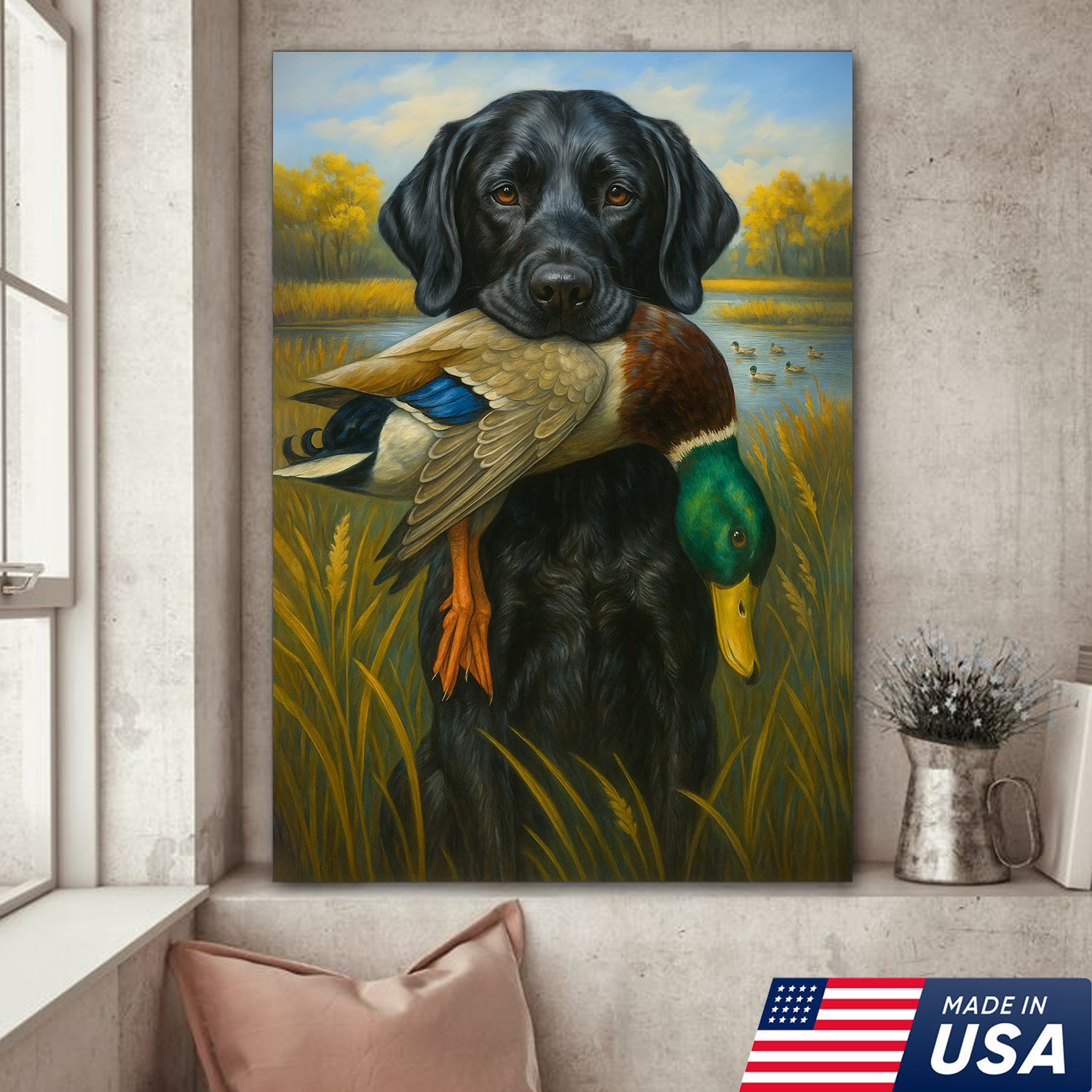 Hunting Dog Canvas Wall Art – Black Labrador Retriever with Duck, Rustic Cabin & Man Cave Decor, Made in USA