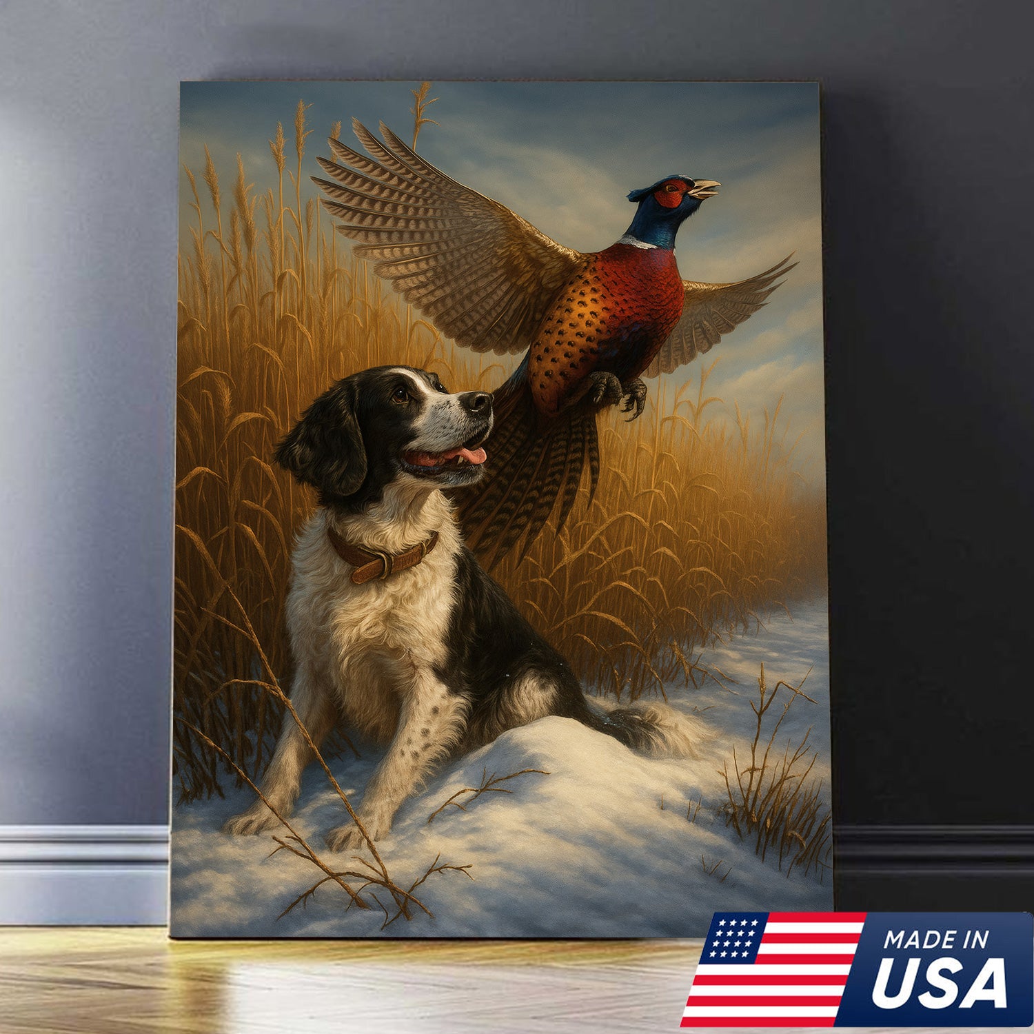 Hunting Dog & Pheasant in Winter Field Canvas – Classic Wildlife Wall Art for Lodge & Nature Decor